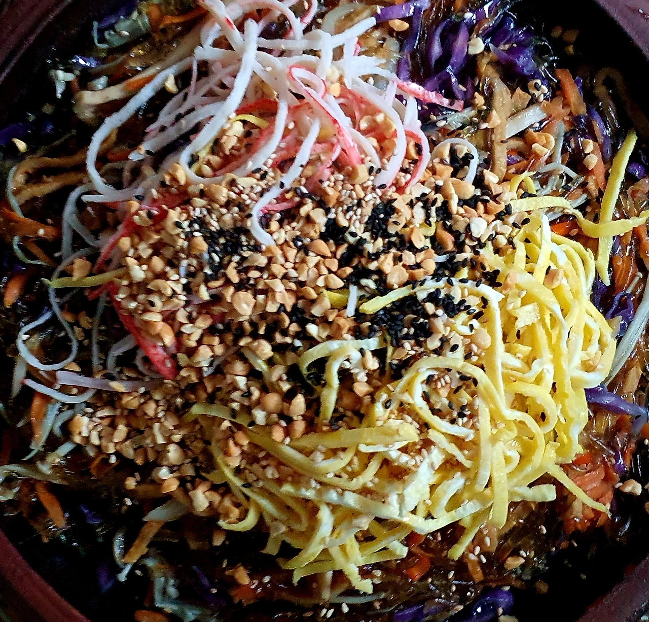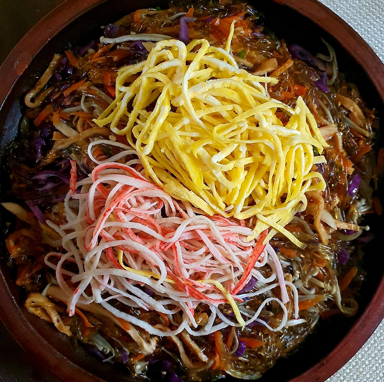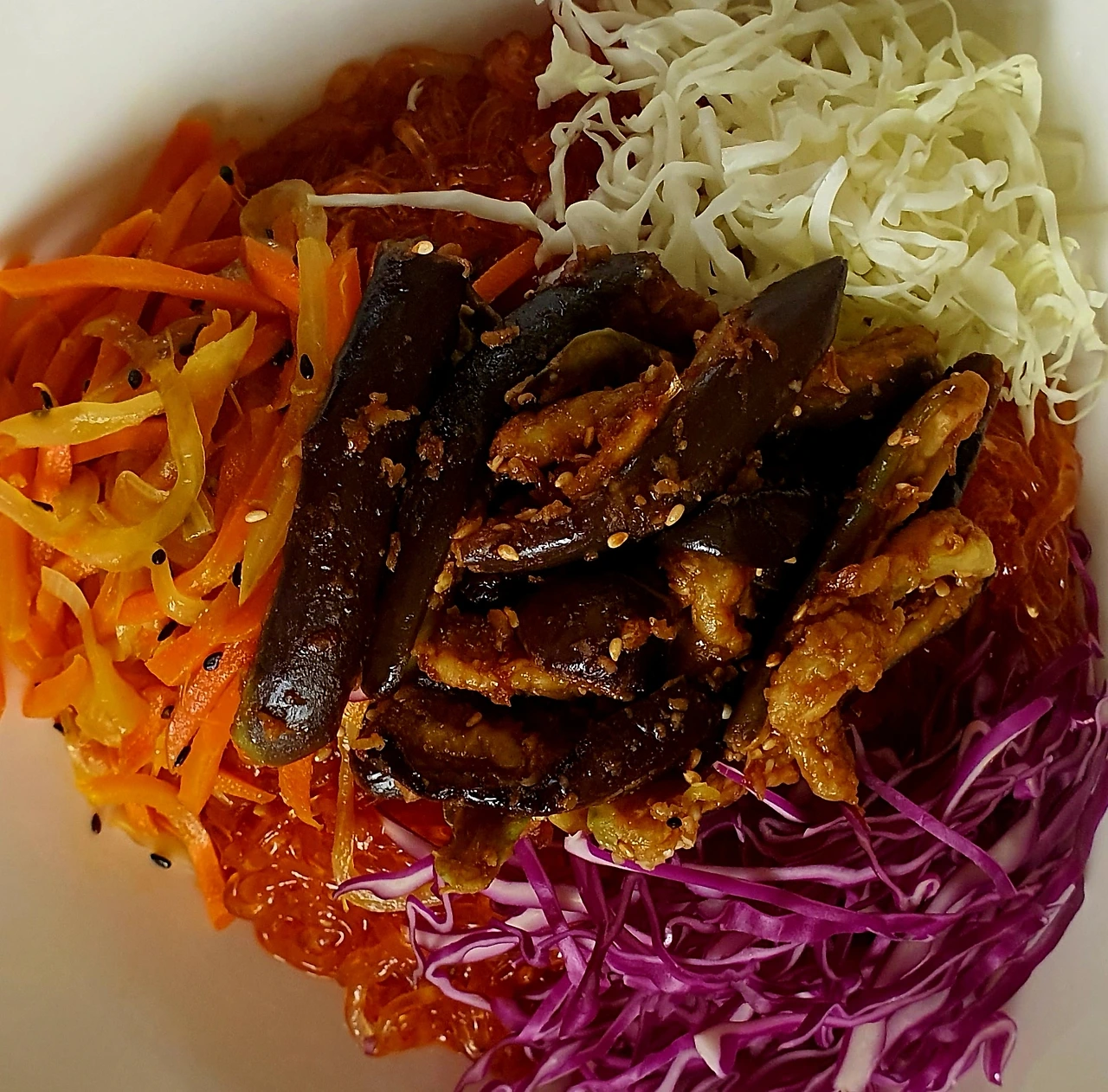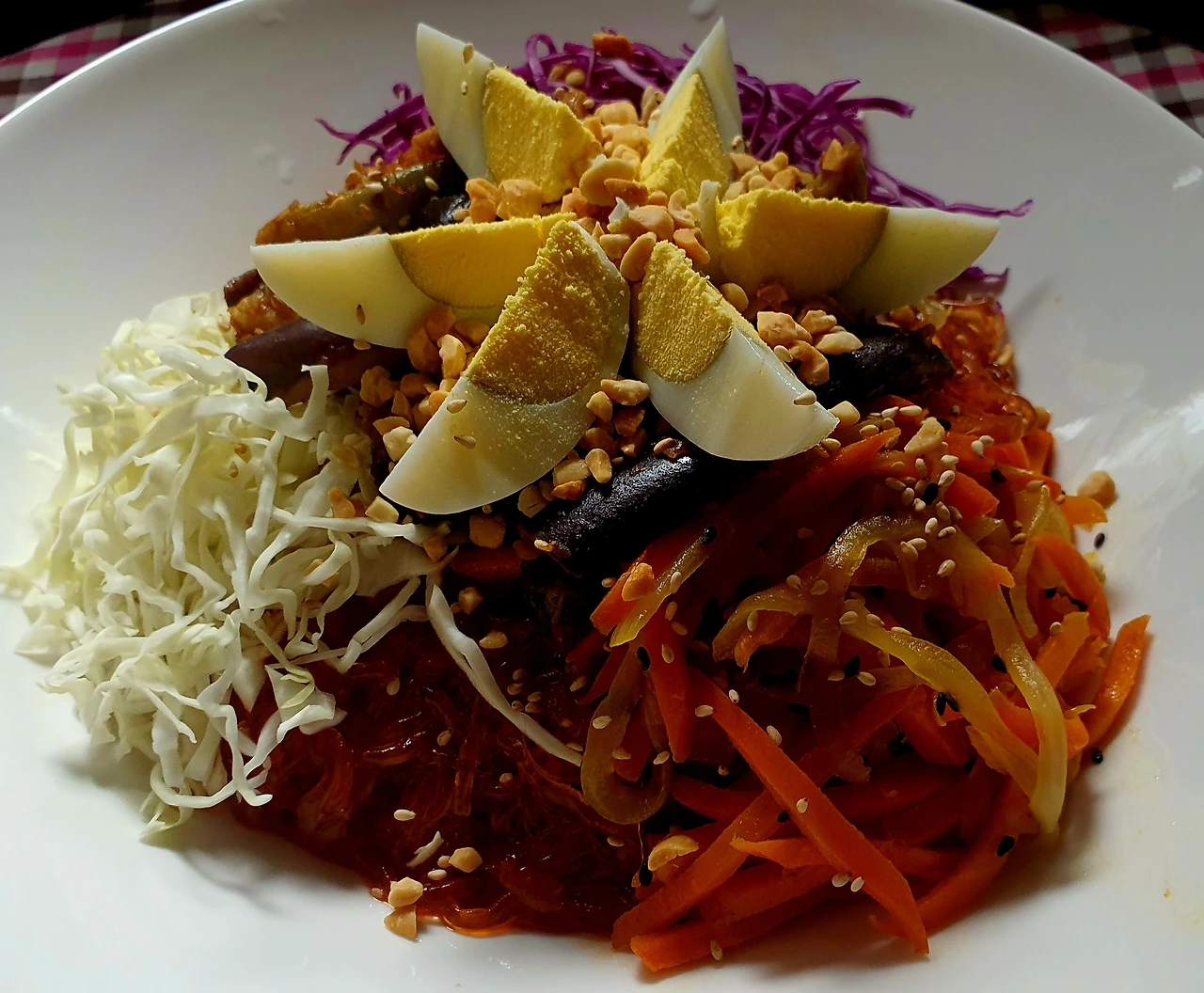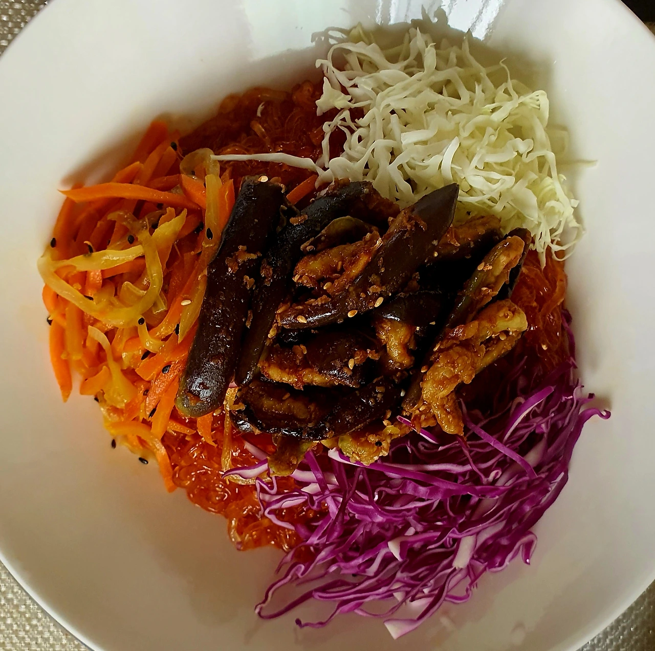 • 양념에 비빈 천사채 국수 위에 가지무침과 볶음 당근. 양파. 자색 양배추를 올리고 가운데 삶은 달걀을 올린다.