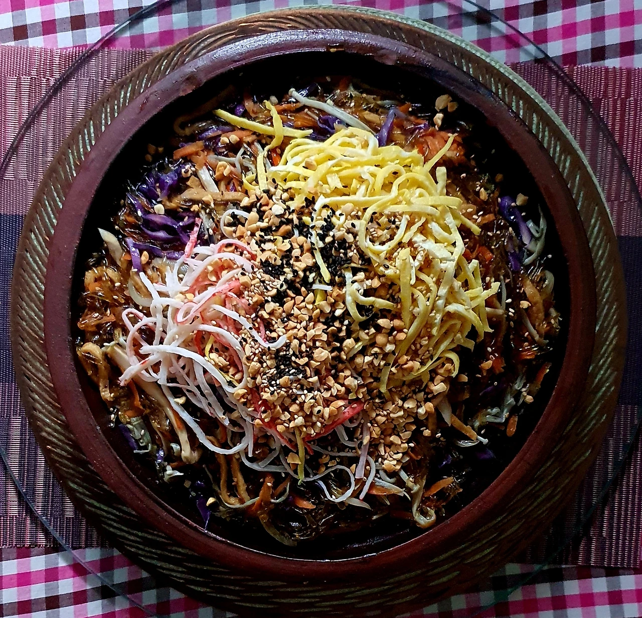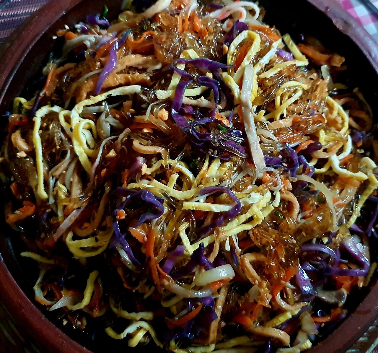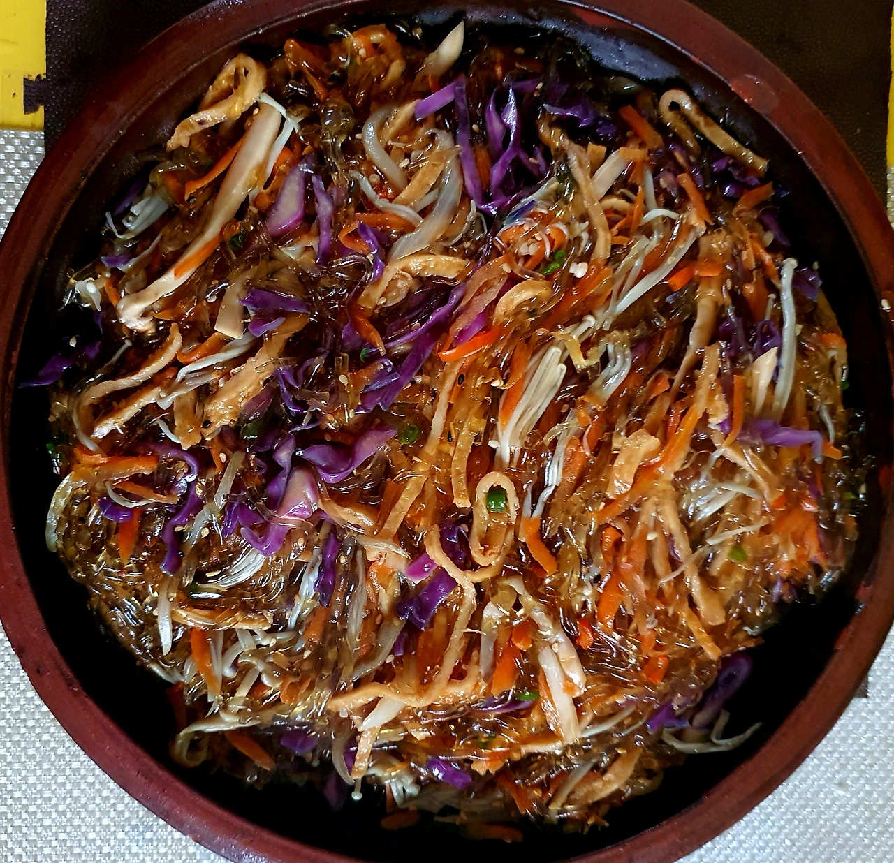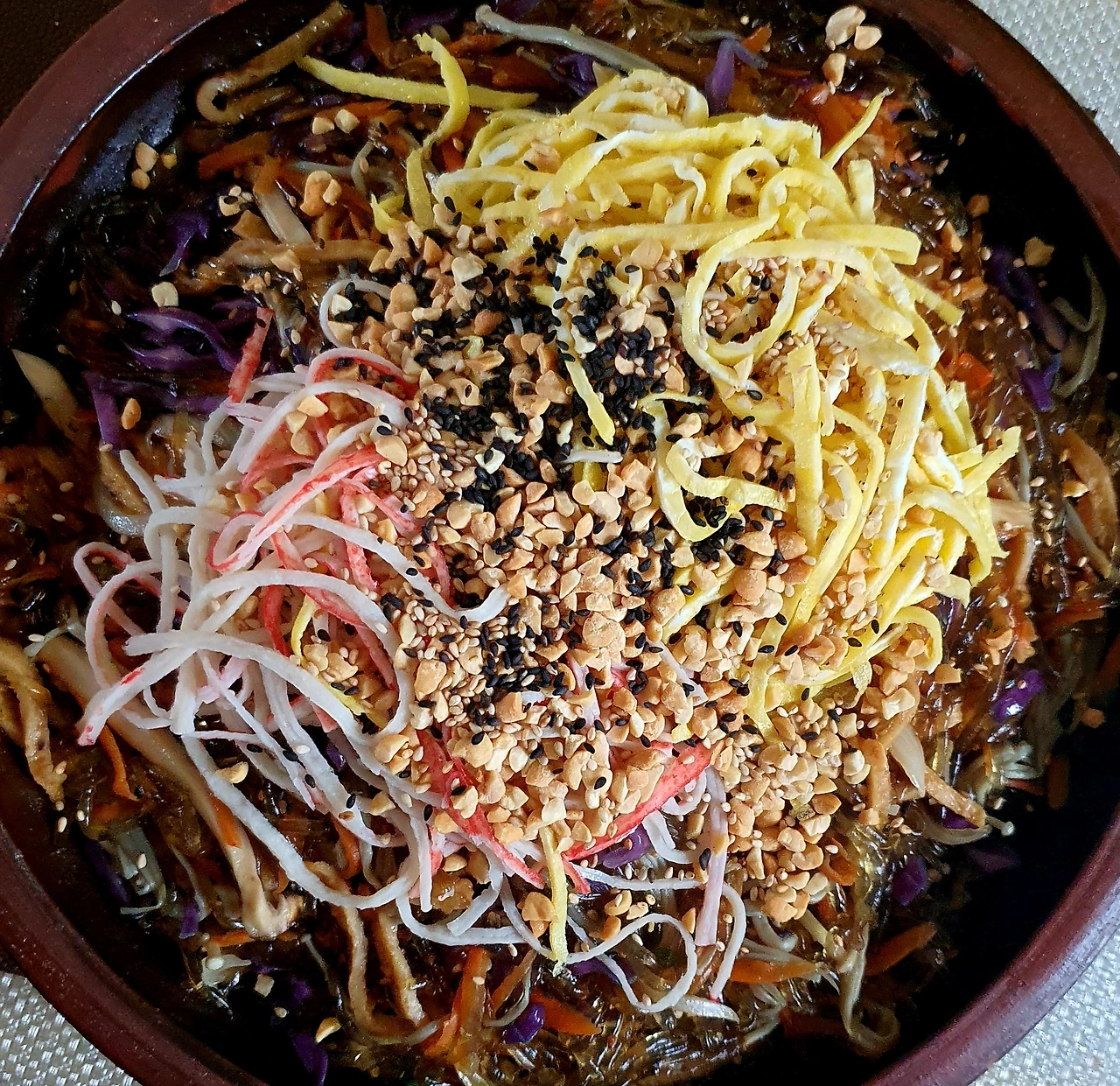 • 양념에 비빈 천사채 국수 위에 가지무침과 볶음 당근. 양파. 자색 양배추를 올리고 가운데 삶은 달걀을 올린다.