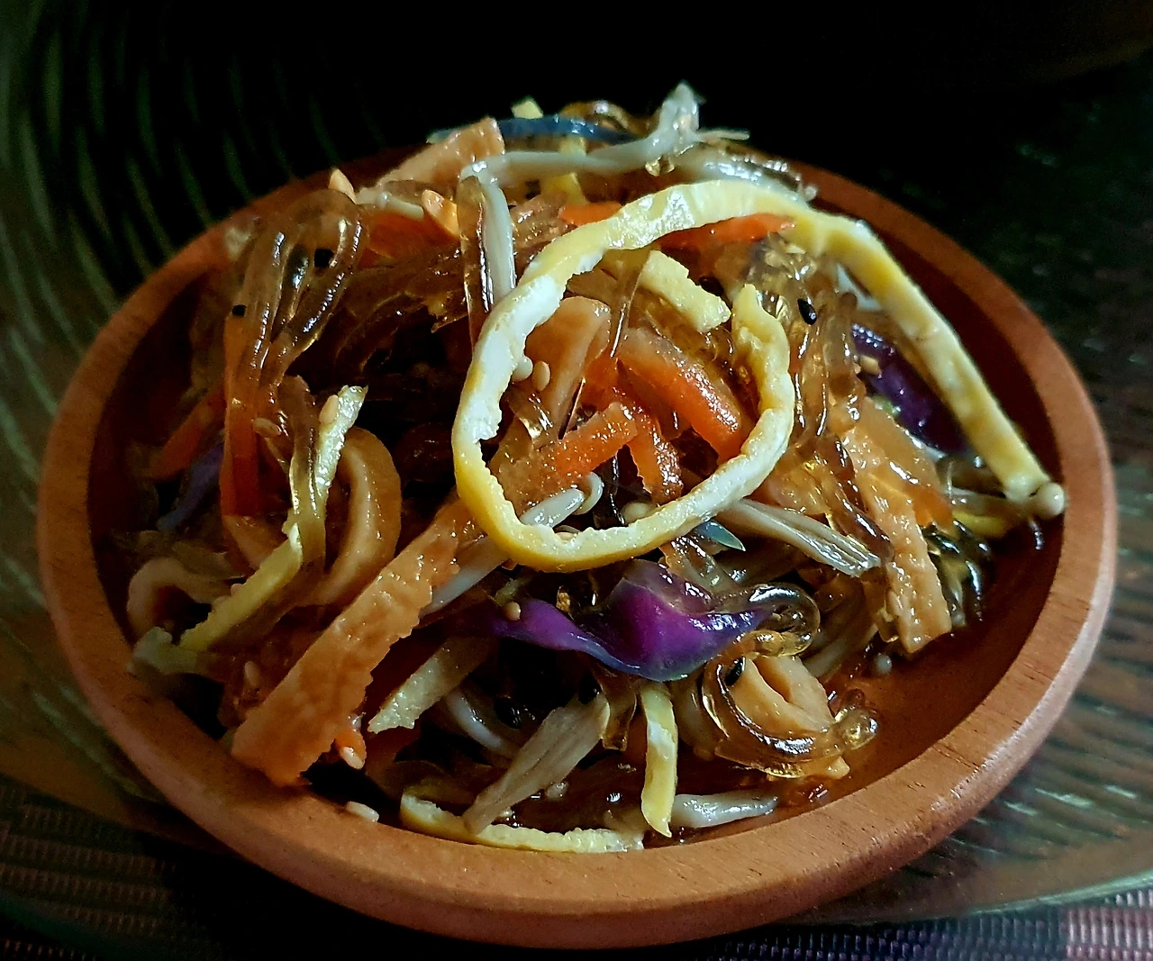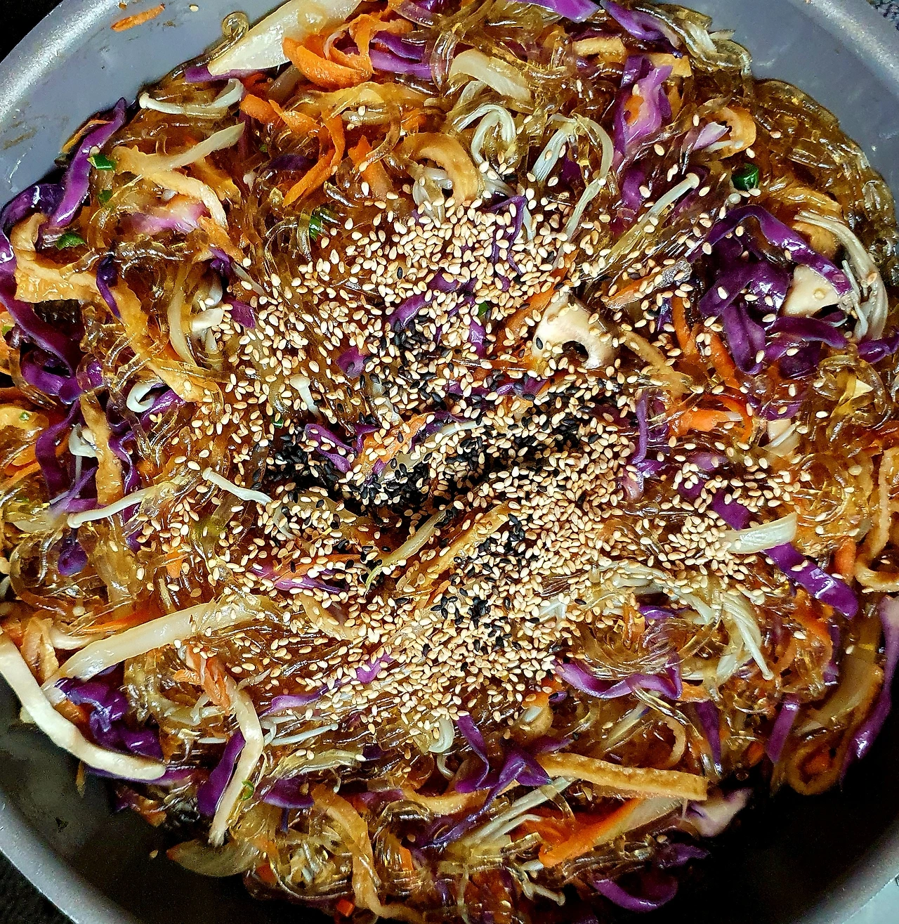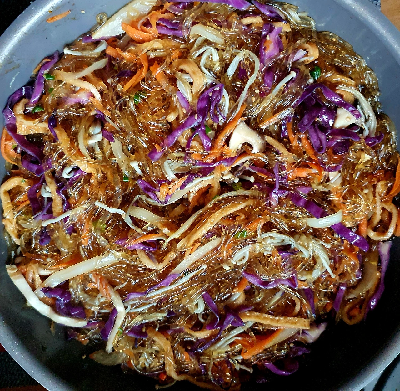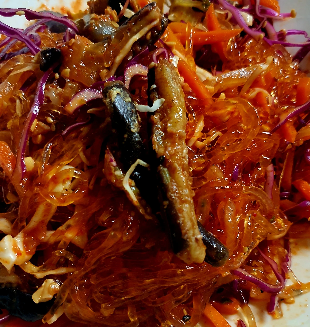 • 양념에 비빈 천사채 국수 위에 가지무침과 볶음 당근. 양파. 자색 양배추를 올리고 가운데 삶은 달걀을 올린다.