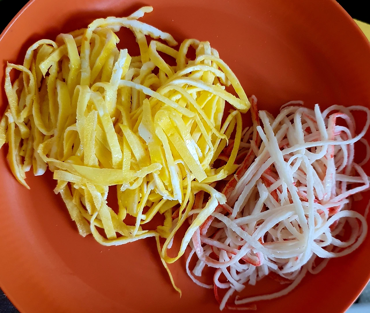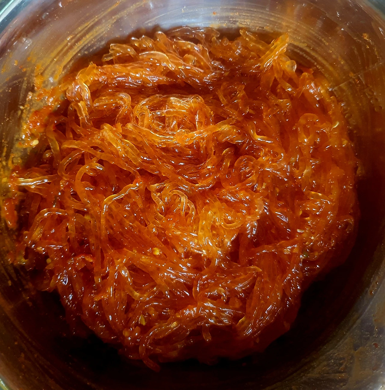 • 볼에 당면화된 천사채를 넣고 양념장을 넣고 조물조물 버무려서 완성접시에 담아 준다.