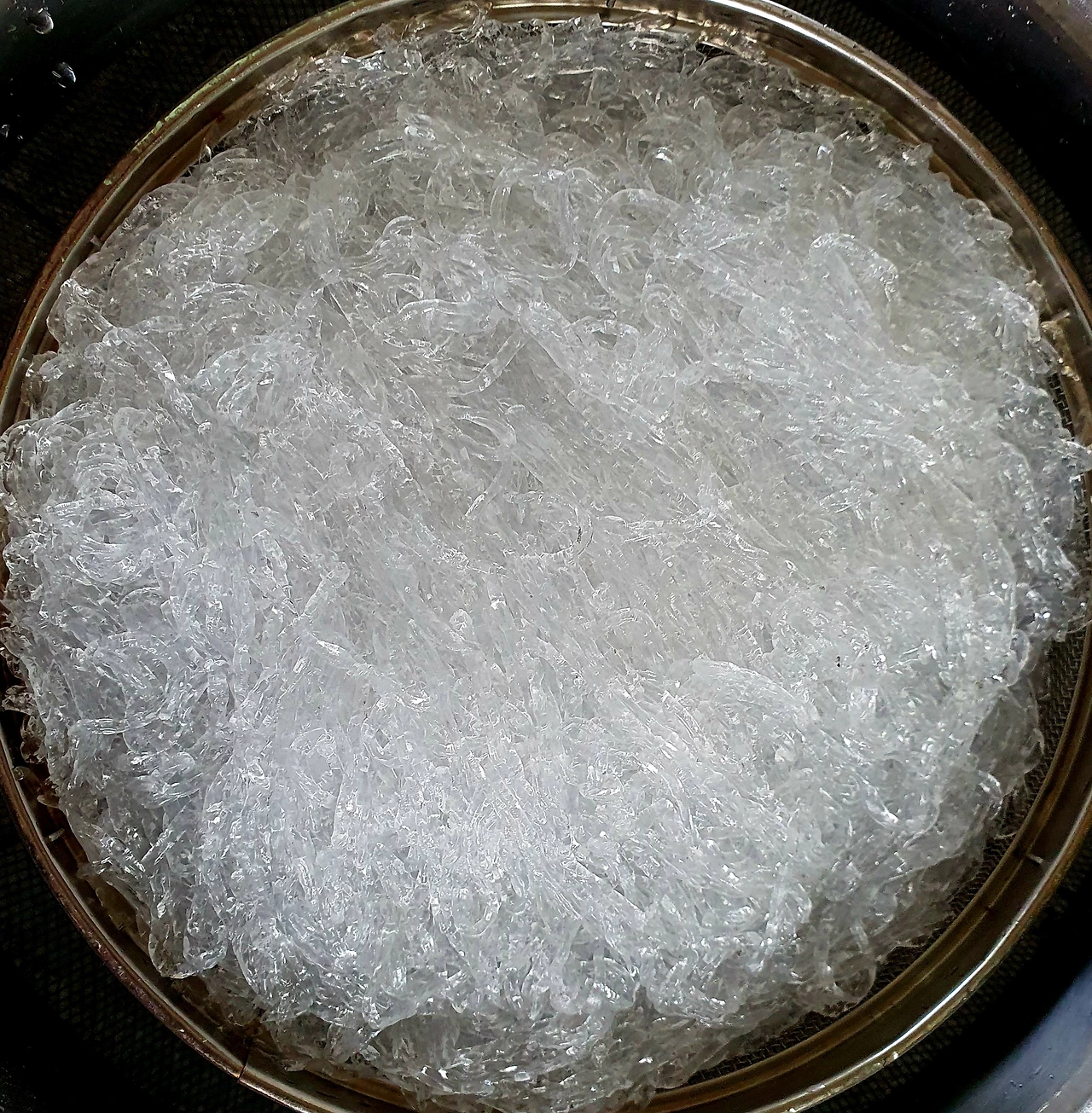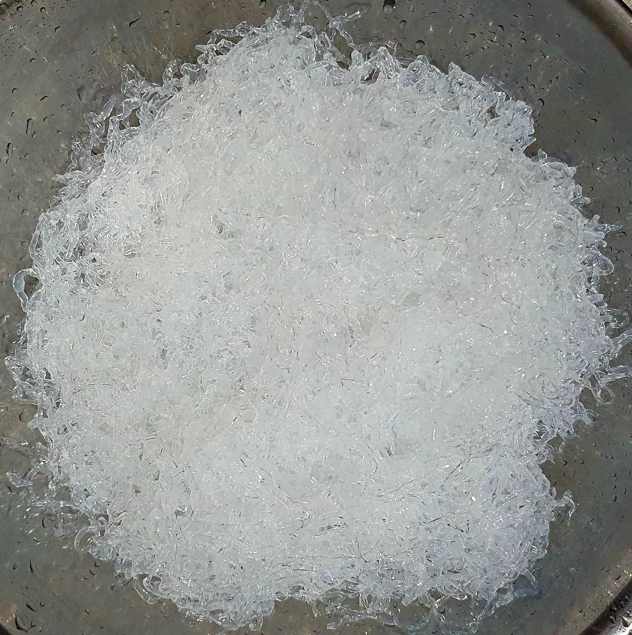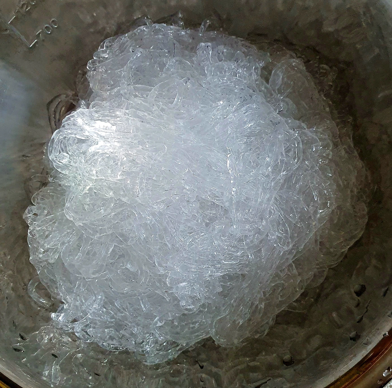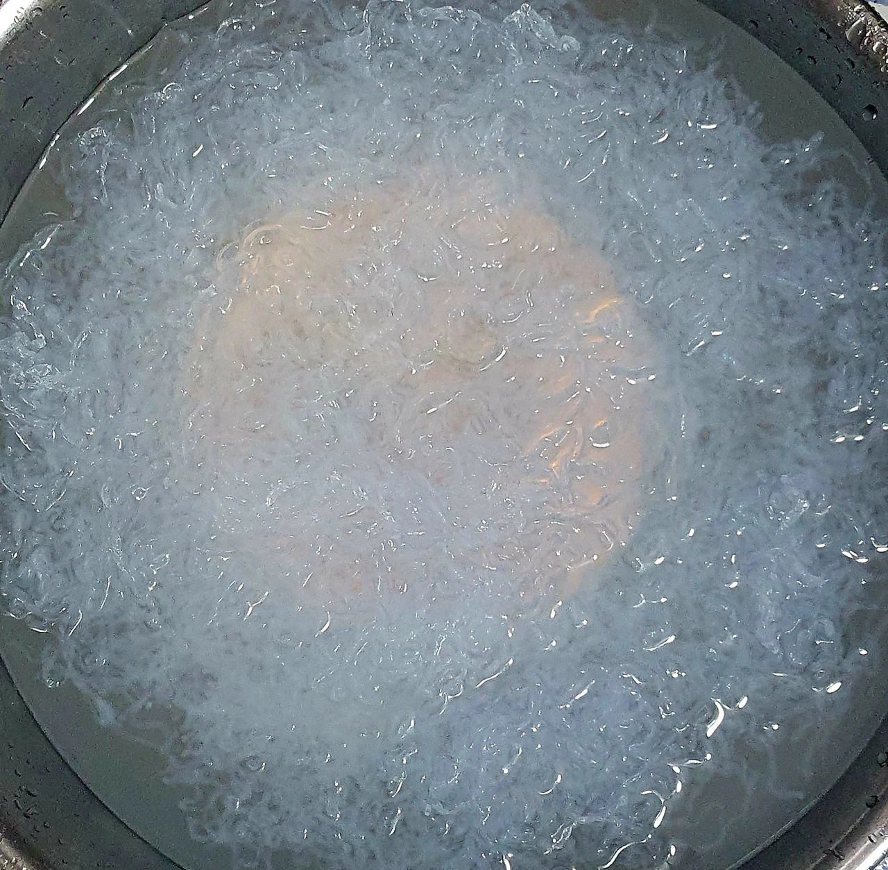 • 끓는 물에 베이킹소다 한 큰 술과 천사채를 넣고 한소끔 1분 안쪽으로 끓여 당면화를 시킨다.