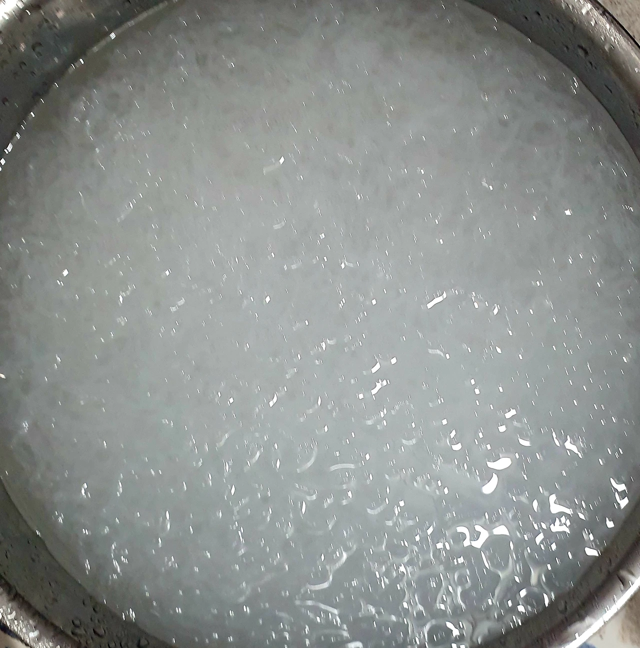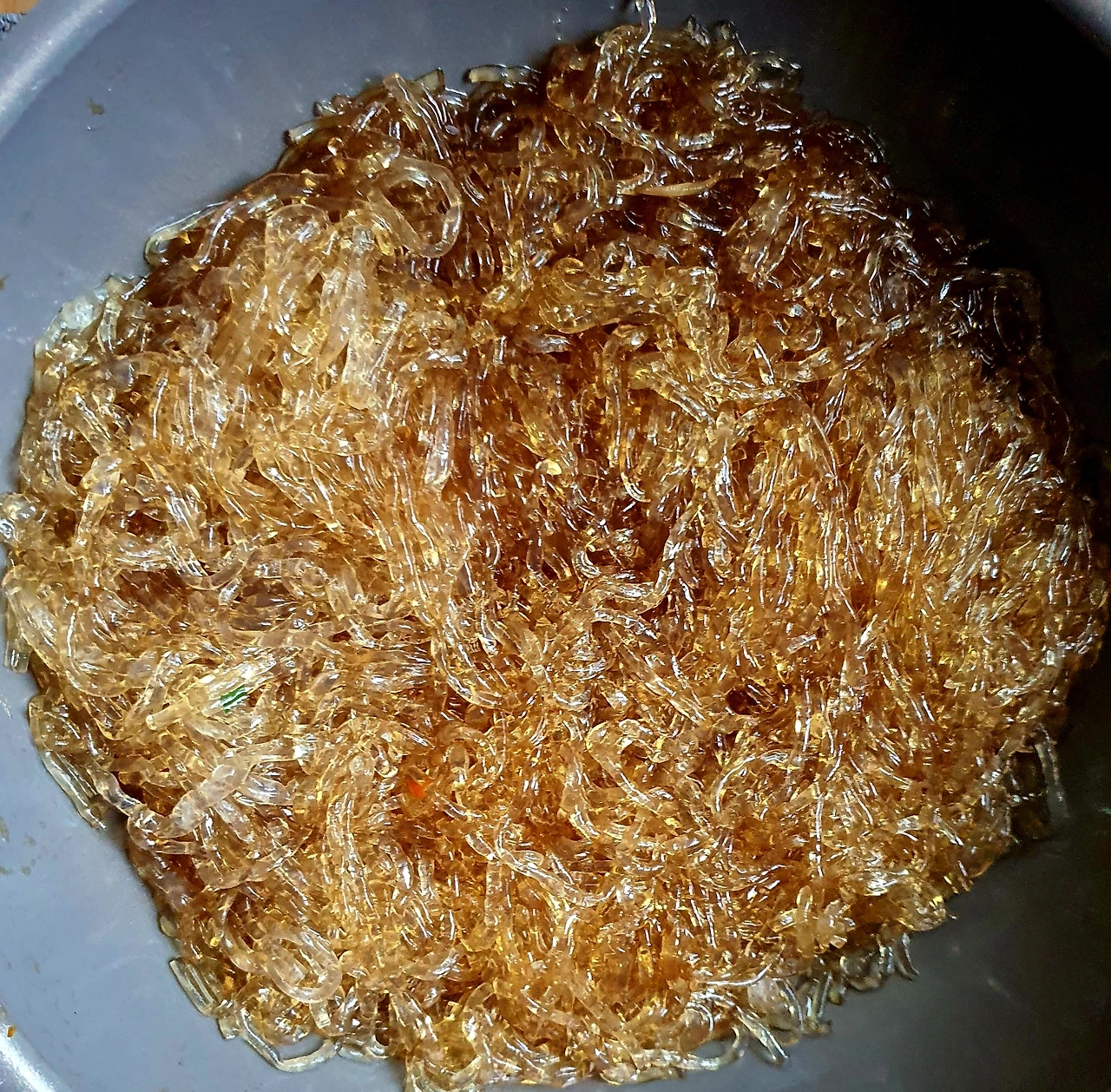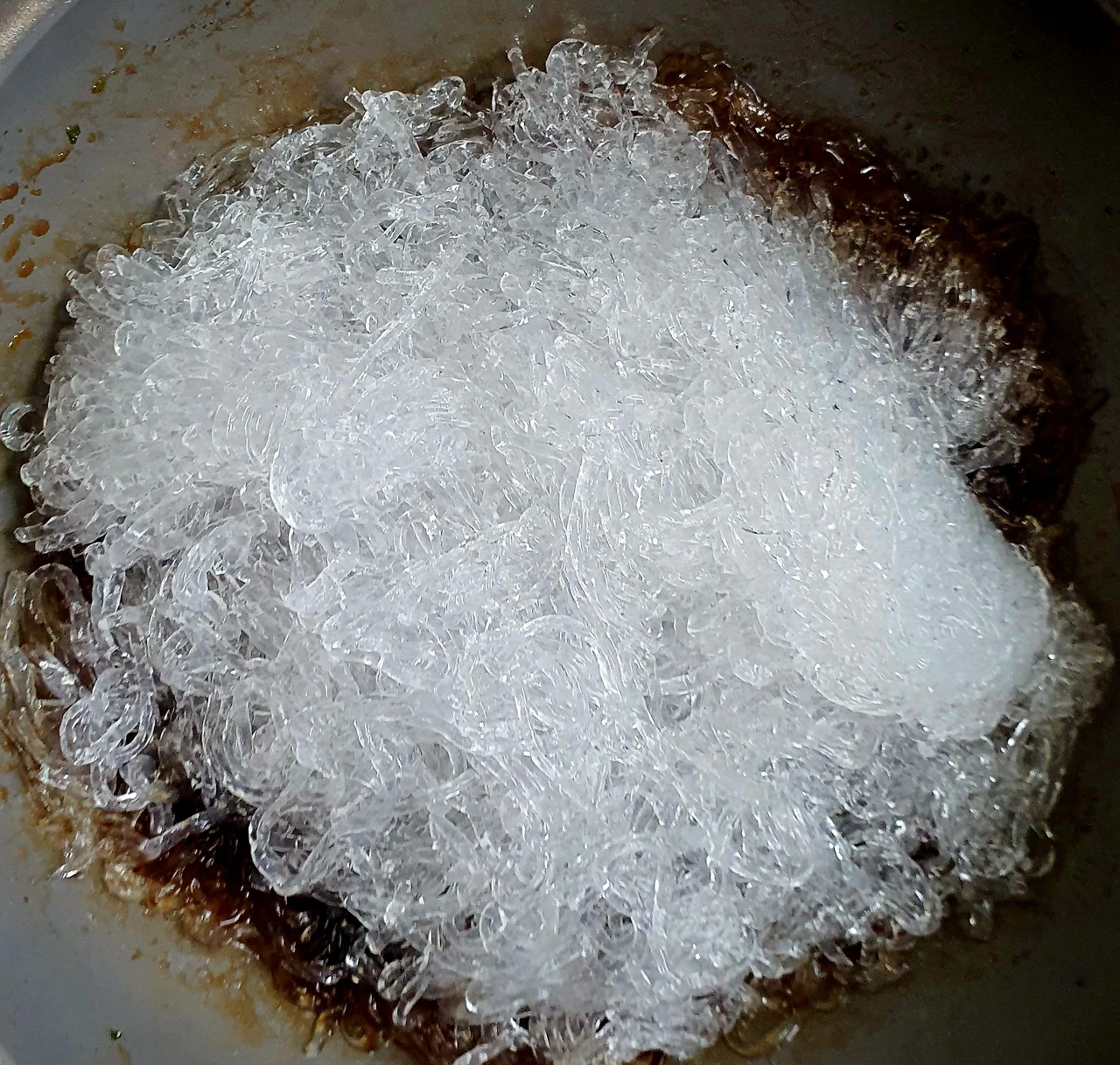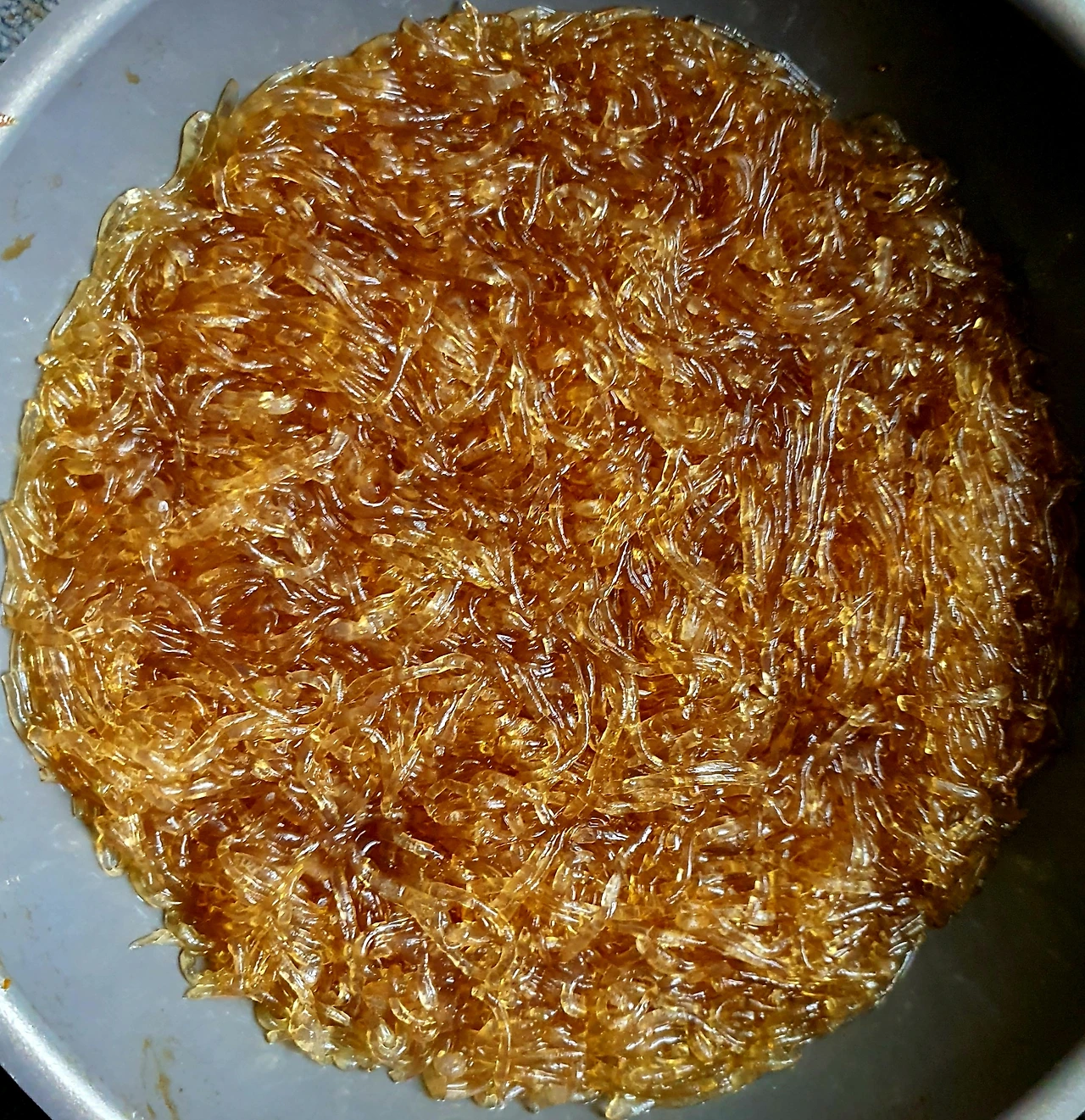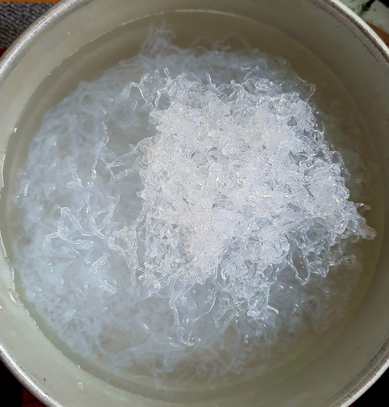 • 끓는 물에 베이킹소다 한 큰 술과 천사채를 넣고 한소끔 1분 안쪽으로 끓여 당면화를 시킨다.