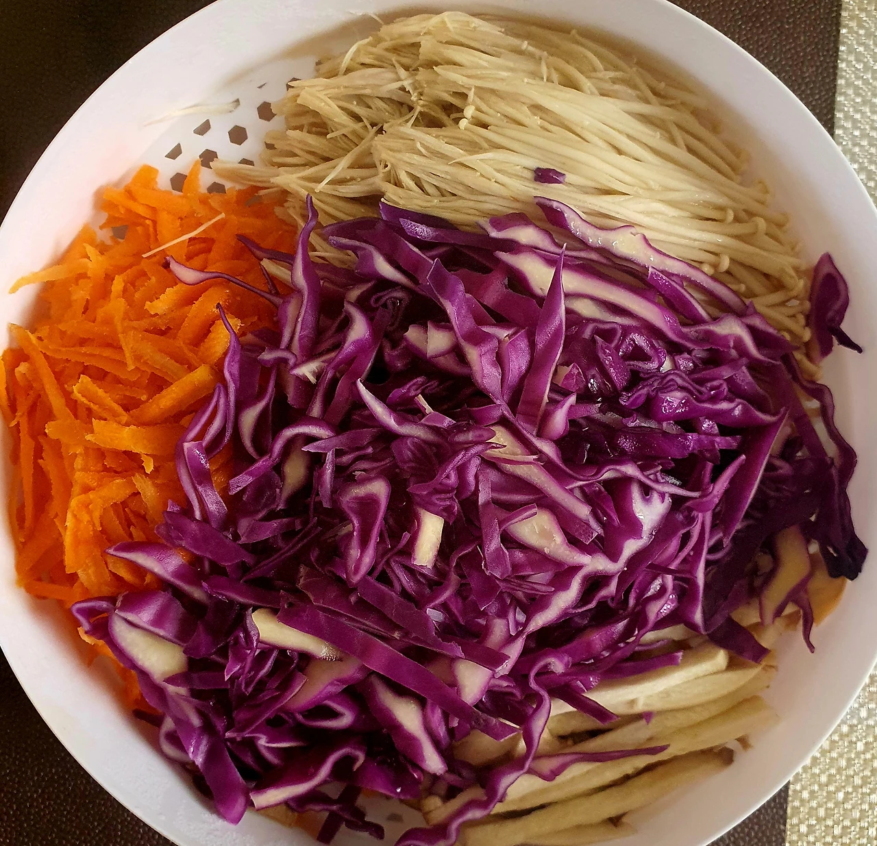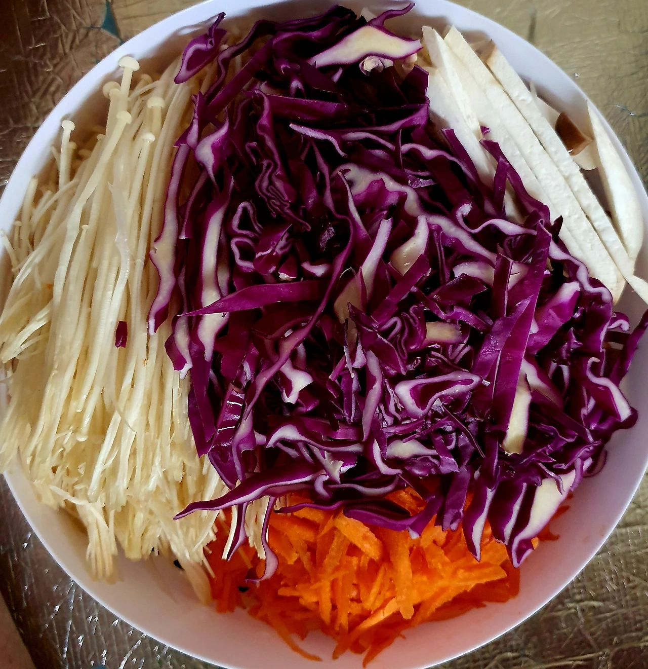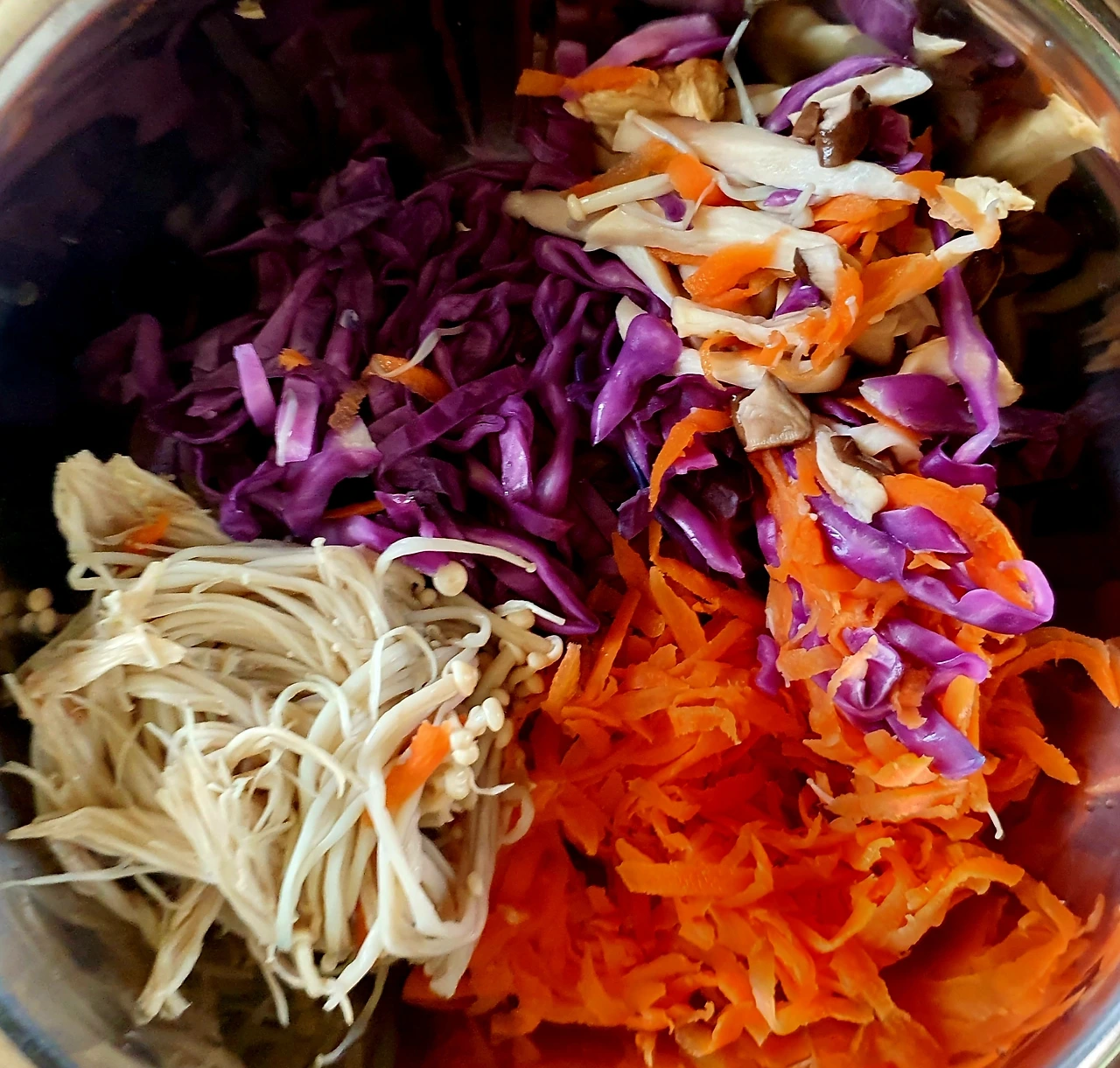• 채 썬 당근. 팽이버섯. 새송이버섯. 적채를 전자랜즈용 찜기에 담아 5분 정도 돌려 쪄준 다음 꼭 짜서 수분을 빼서 소금. 참기름. 통깨를 넣고 버무려 준비한다.