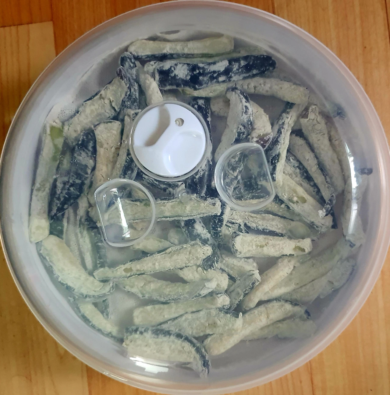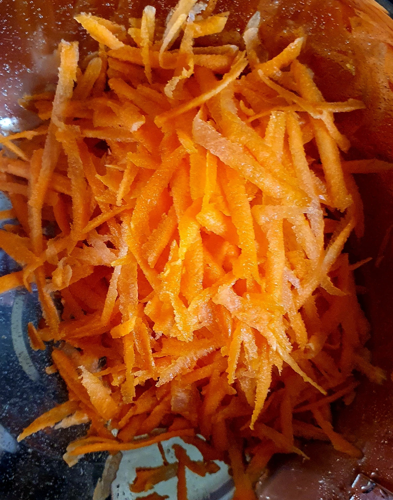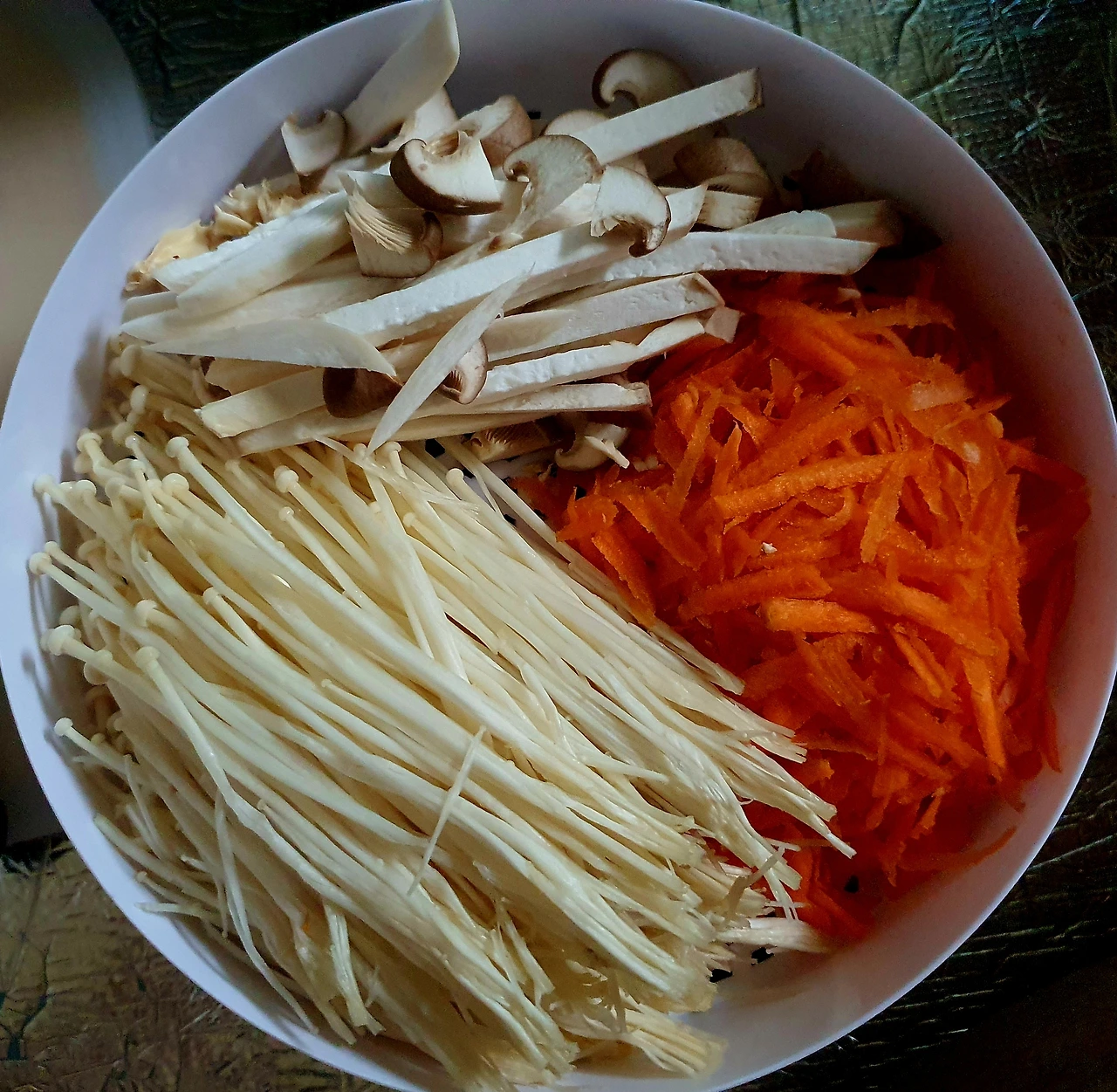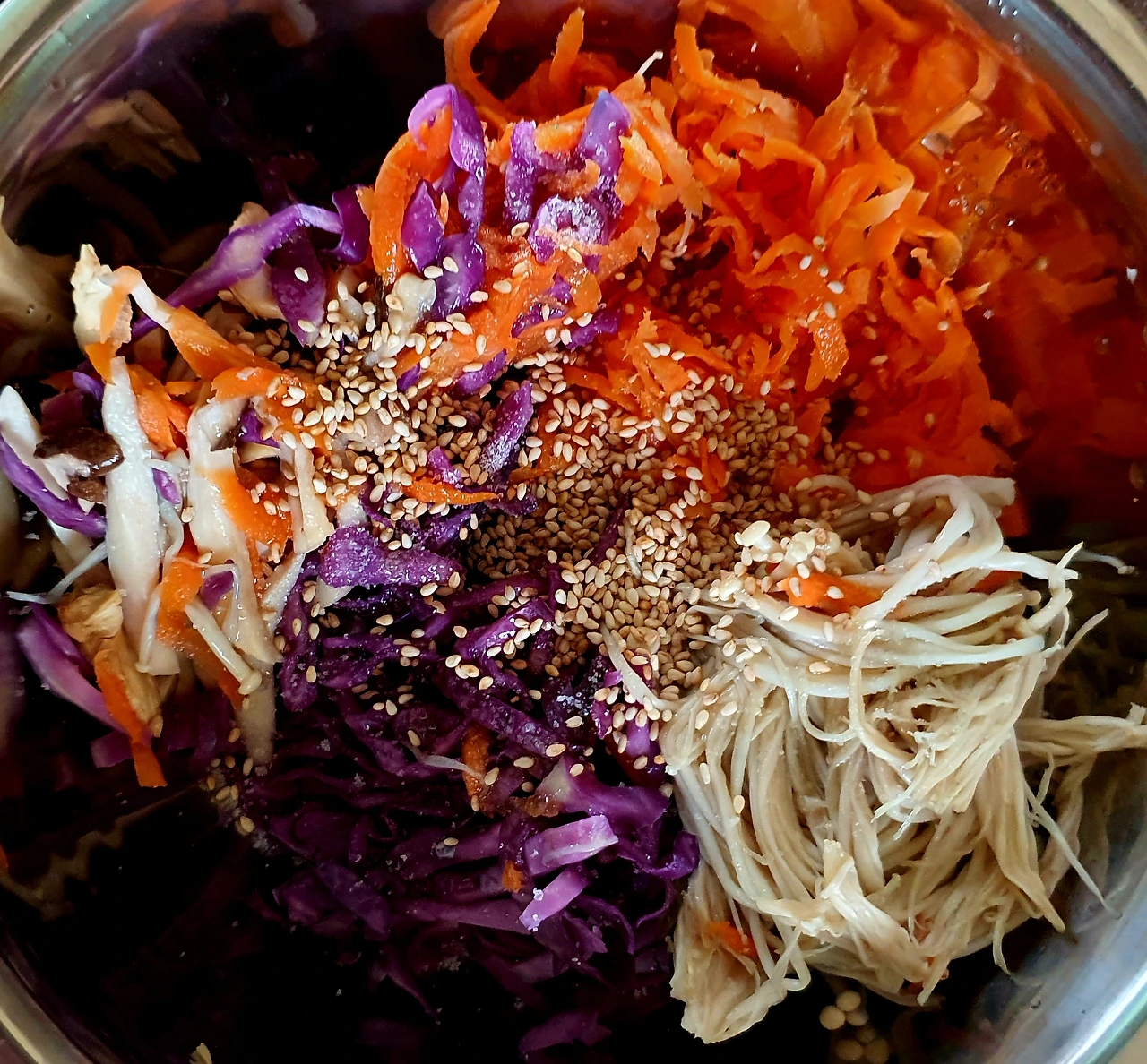• 채 썬 당근. 팽이버섯. 새송이버섯. 적채를 전자랜즈용 찜기에 담아 5분 정도 돌려 쪄준 다음 꼭 짜서 수분을 빼서 소금. 참기름. 통깨를 넣고 버무려 준비한다.