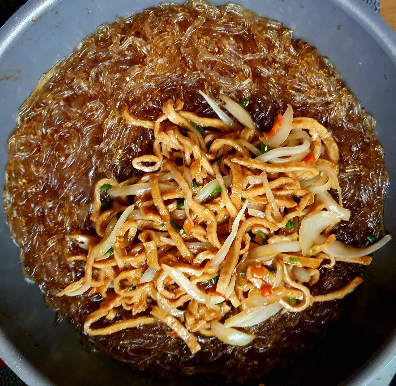 • 재료가 다 볶아지면 볼에 담아두고, 다시 웍에 당면양념을 담고 끓어오르면 미리 만들어 두었던 당면화된 천사채를 넣고 양념국물이 없어질 때까지 졸이듯 볶아준다.