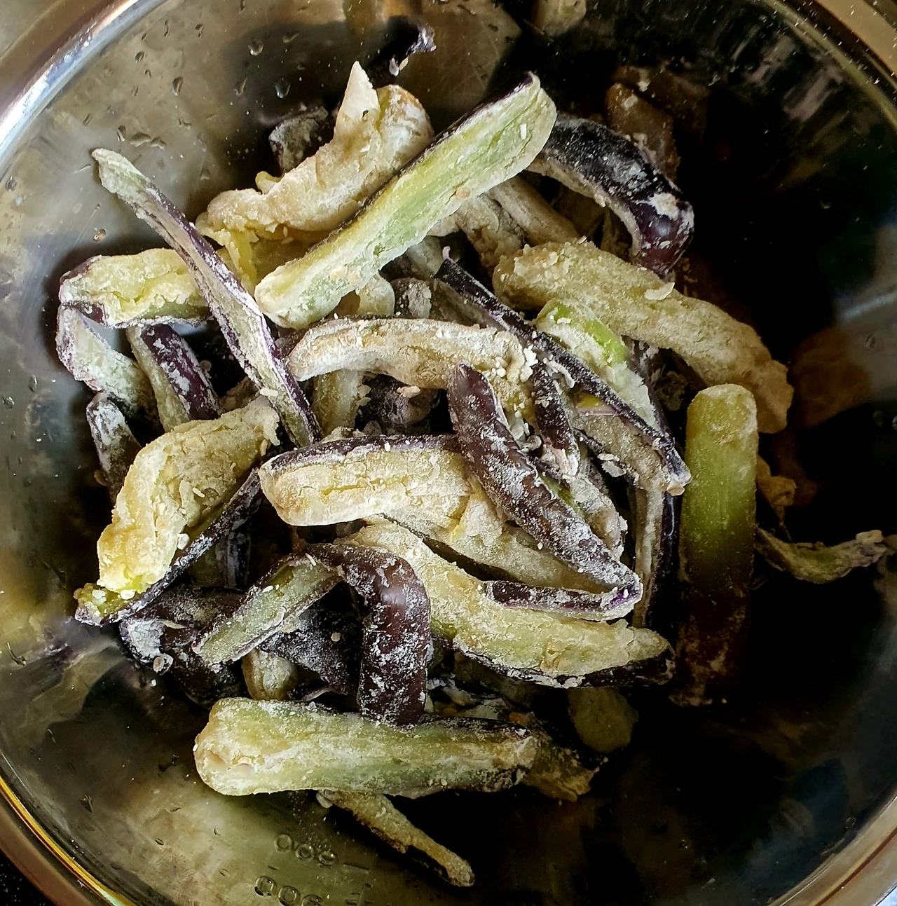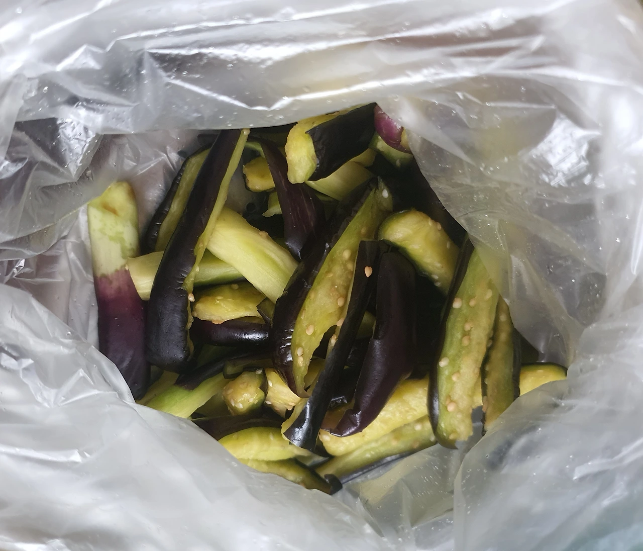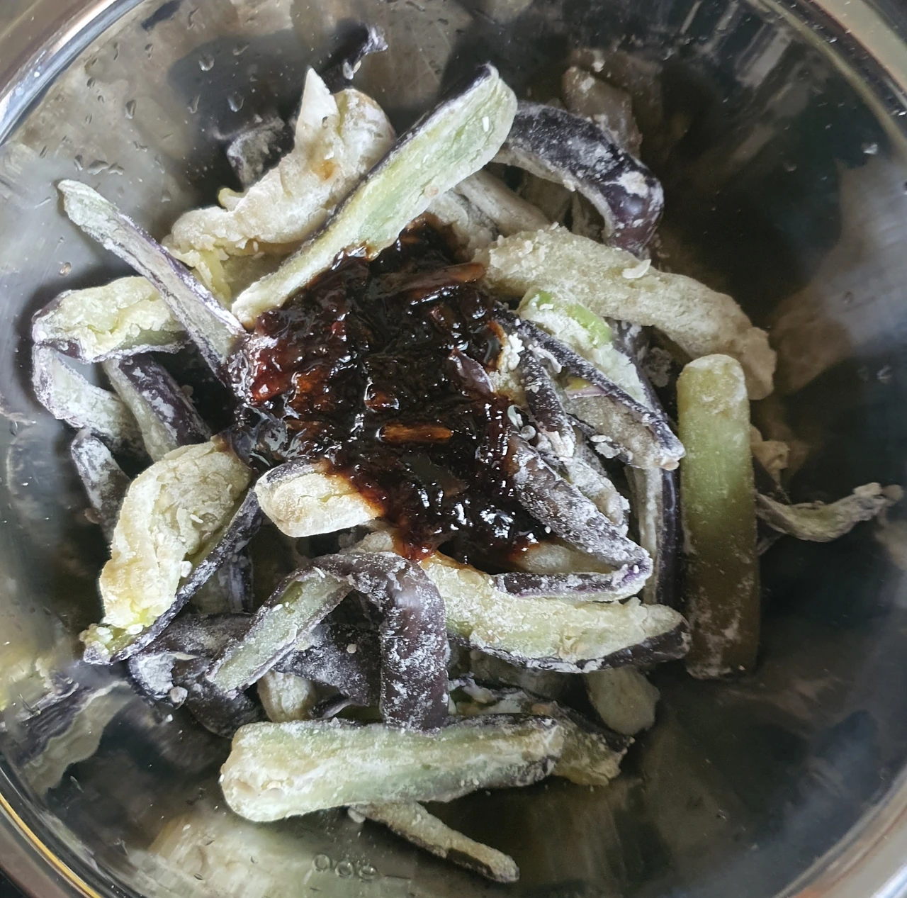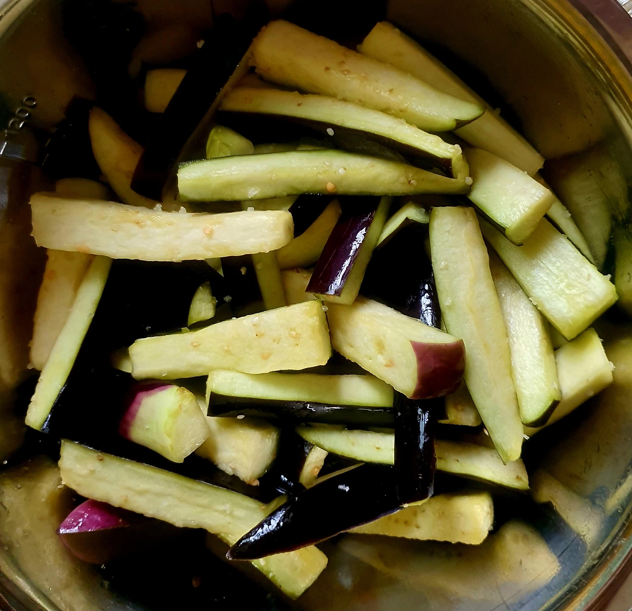 • 가지를 길게 썰어서 소금 조금 넣고 15분 정도 절인 후 꼭 짜서 수분을 어느 정도 제거하고 비닐봉지에 담아 찹쌀가루에 버무려서 전자레인지에 4~5분 돌려 쪄서 식힌 후에 양념장에 버무려 준비한다. 이러면 가지무침의 식감이 달라짐. 넉넉하게 만들어 반찬으로 씀.