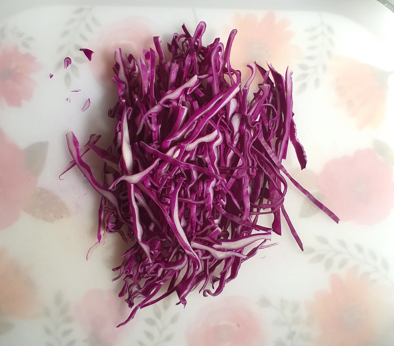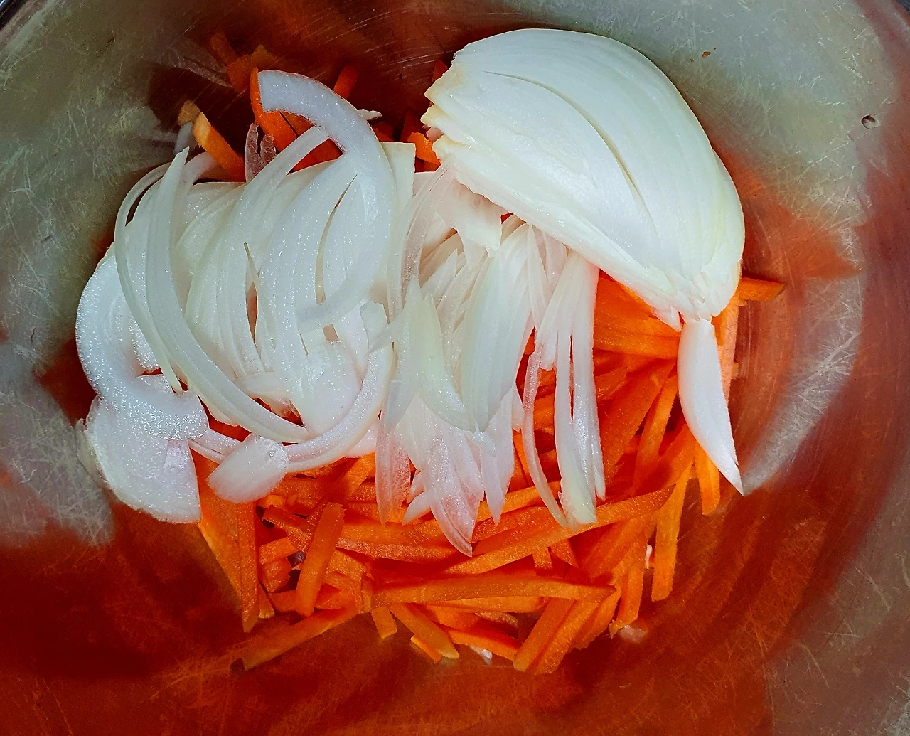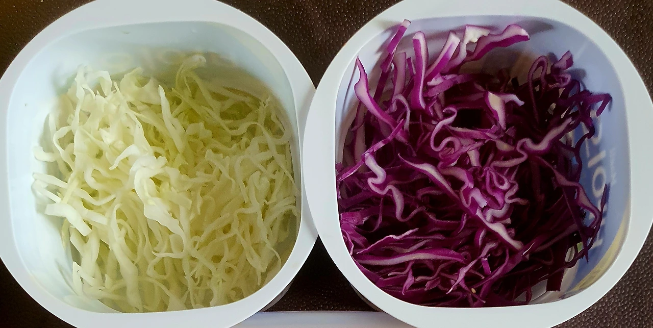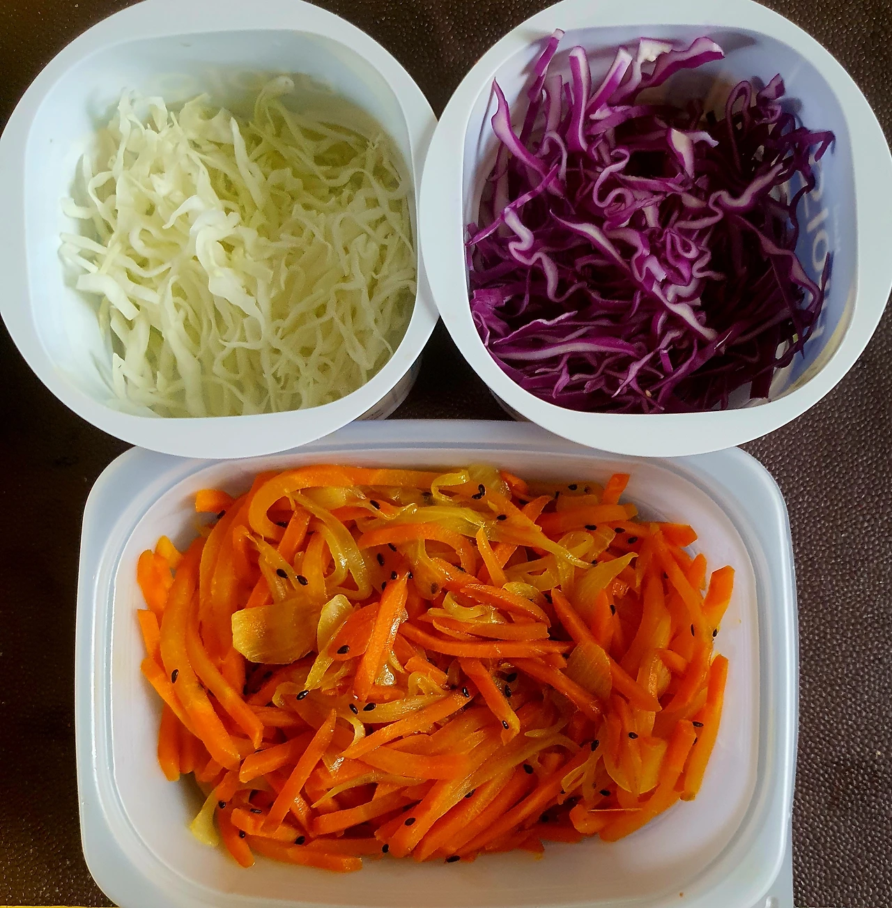 • 당근과 양파는 채를 썰어 소금에 살짝 절여 기름 살짝 둘러 볶아서 준비한다. 자색 양배추는 얇게 채를 썰어준다.