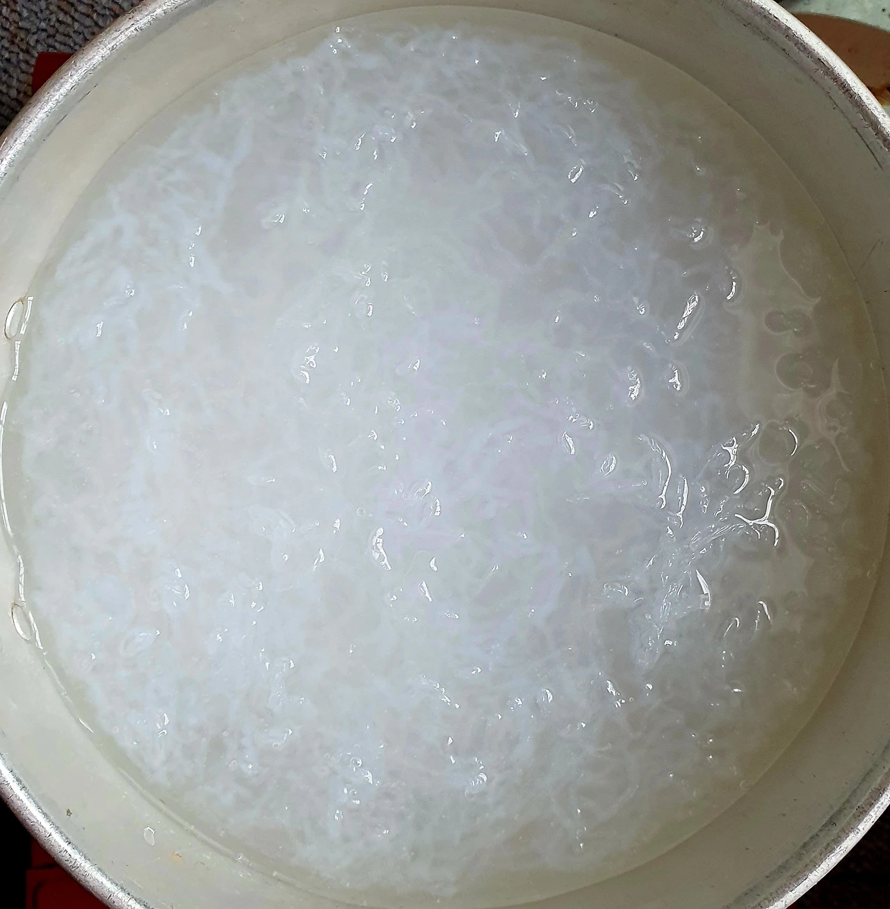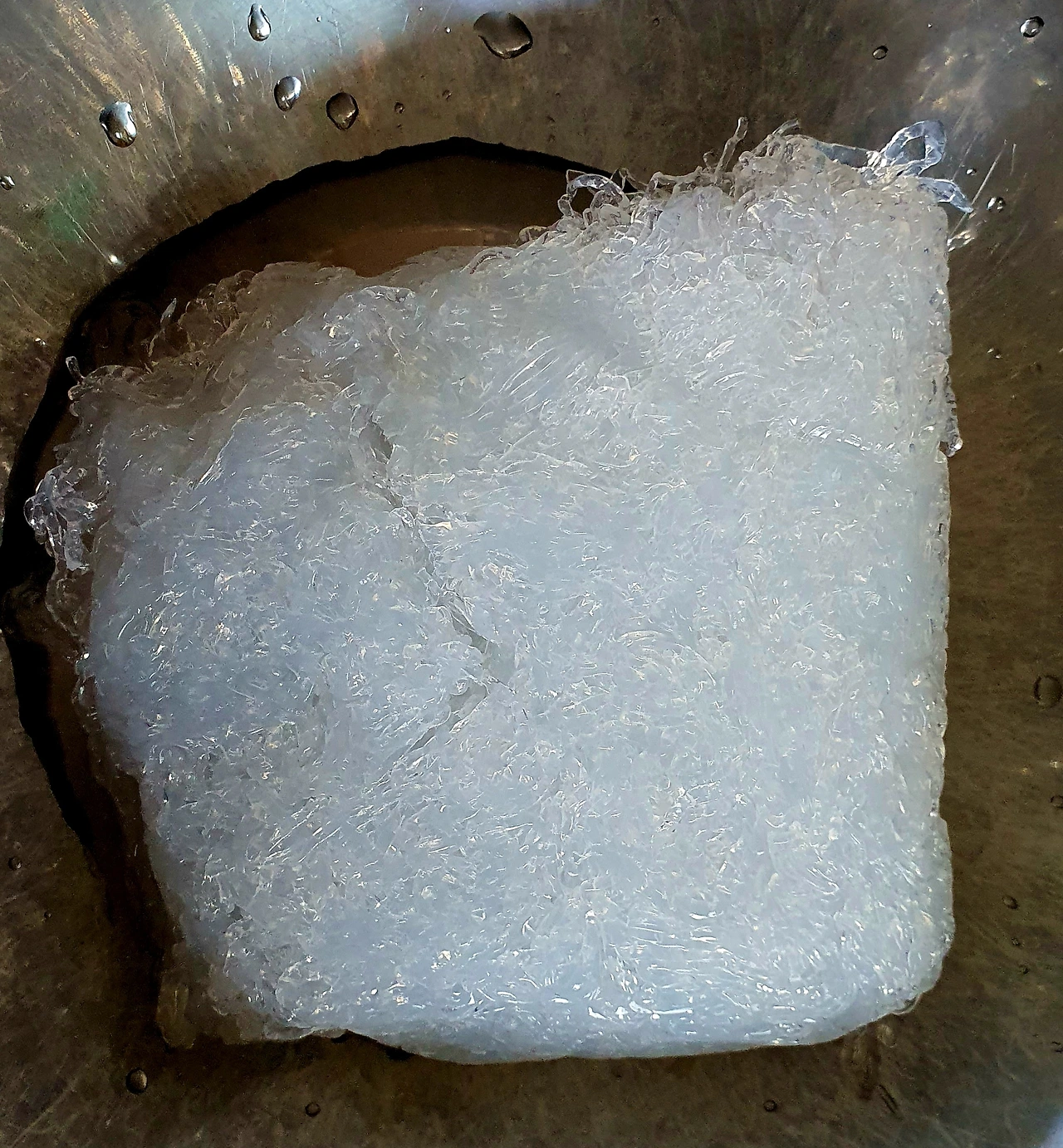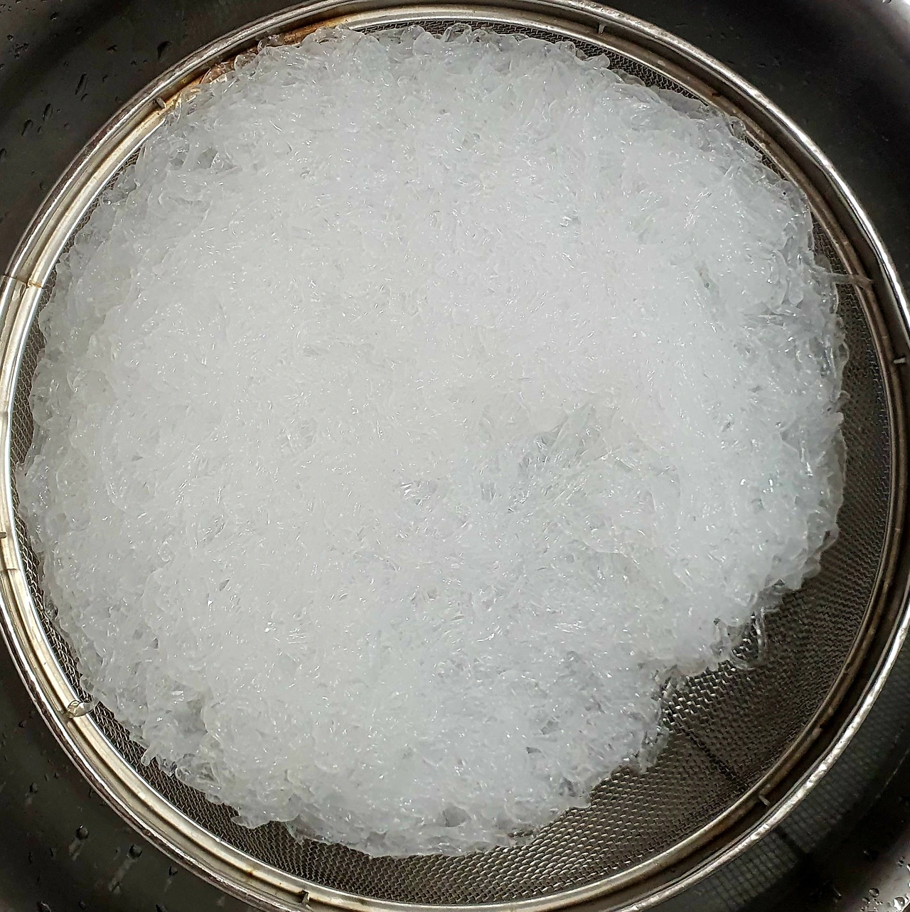 • 천사채가 당면처럼 변하면 흐르는 물에 5~6번 정도 씻어 베이킹소다를 빼준 후에 물기를 빼 준다.