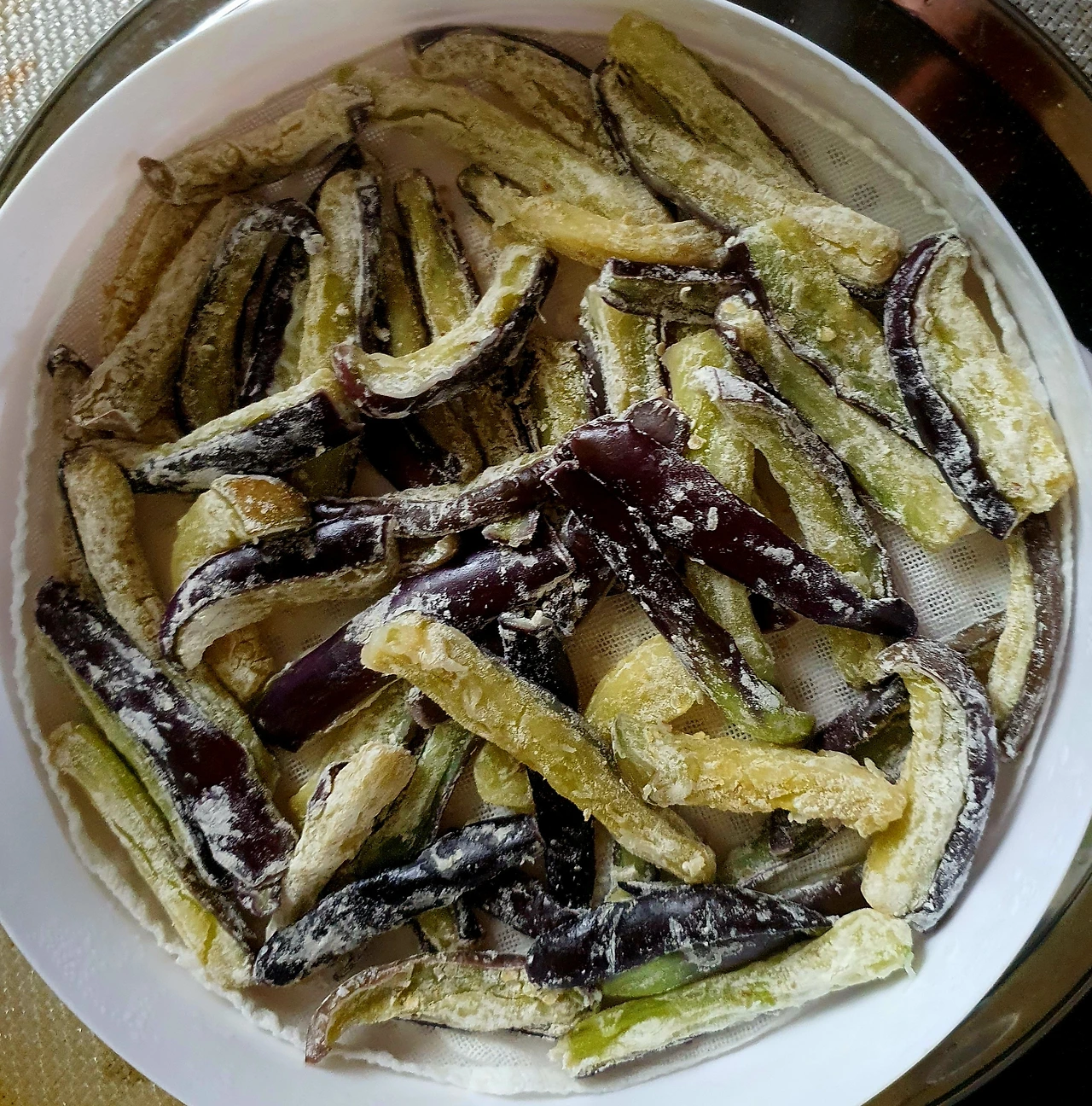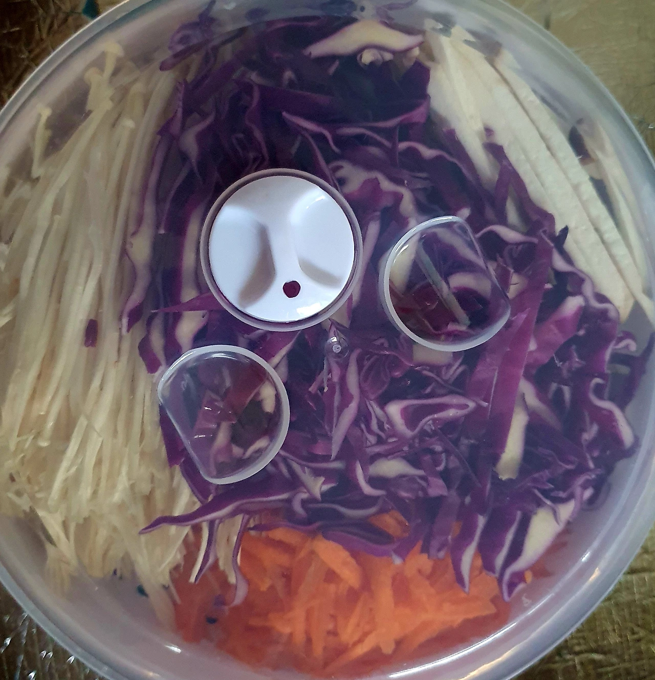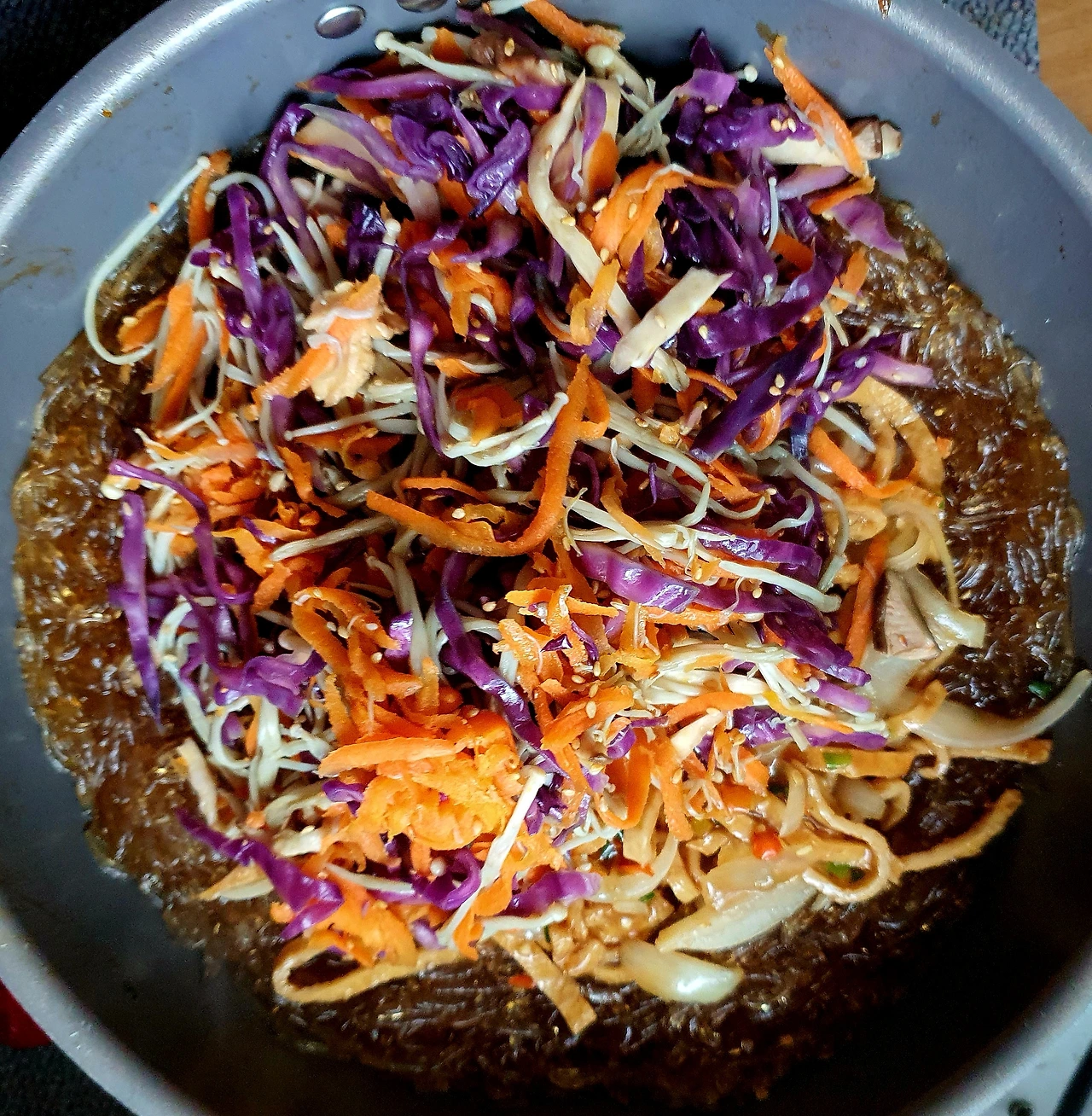 ■ 재료 : 당근 조금, 가지 2개, 양파 ⅓개, 자색양배추 조금. 천사채 1인분. 깨소금 ½큰술. 삶은 달걀 1개. 찹쌀가루 2큰술