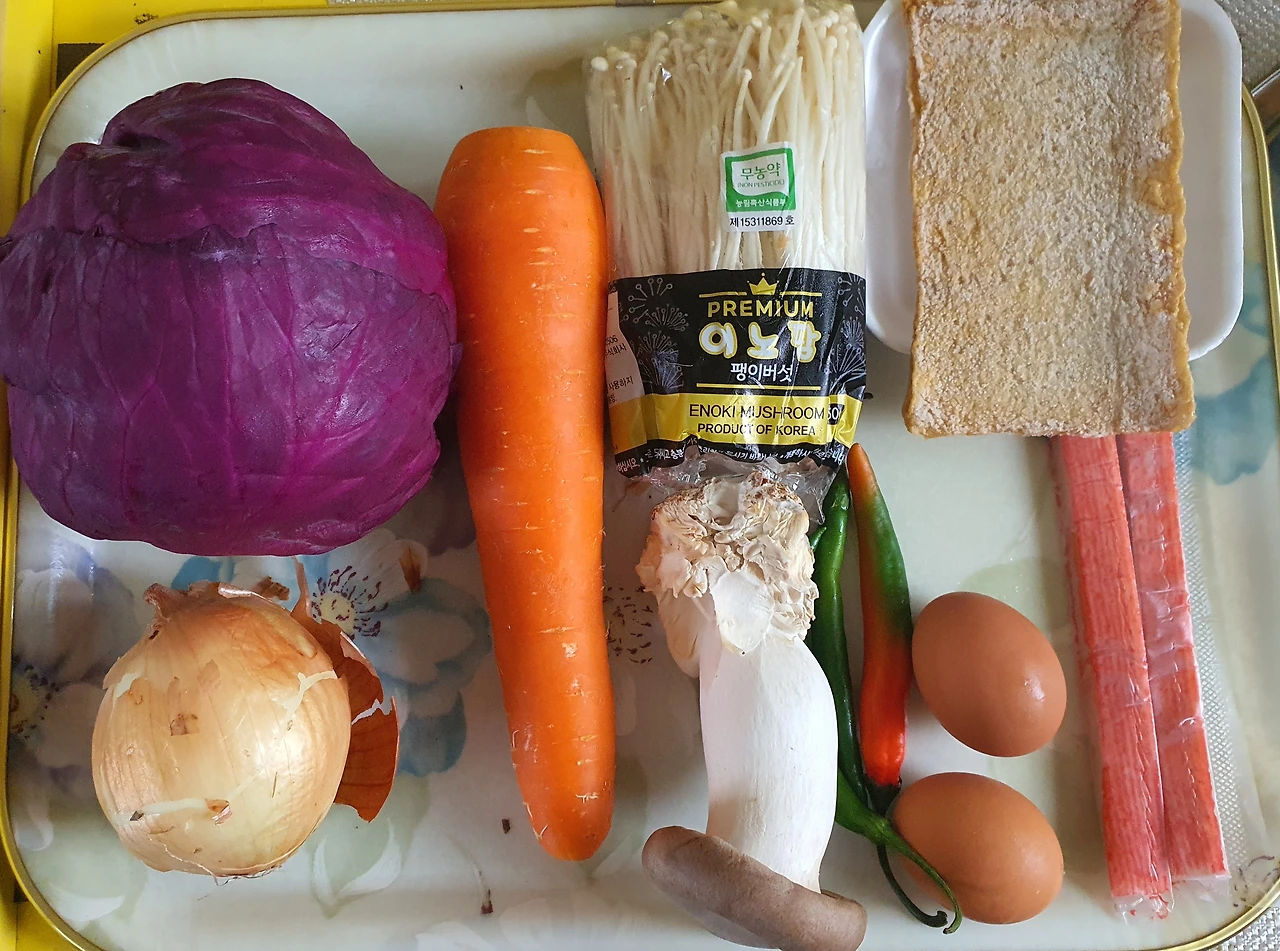 ■ 재료 : 천사채 500g. 어묵 4장. 맛살 2개. 팽이버섯 1봉. 양파 ½개. 새송이버섯 1개. 청양고추 3개. 당근 ½개. 적채 1컵. 달걀 2개