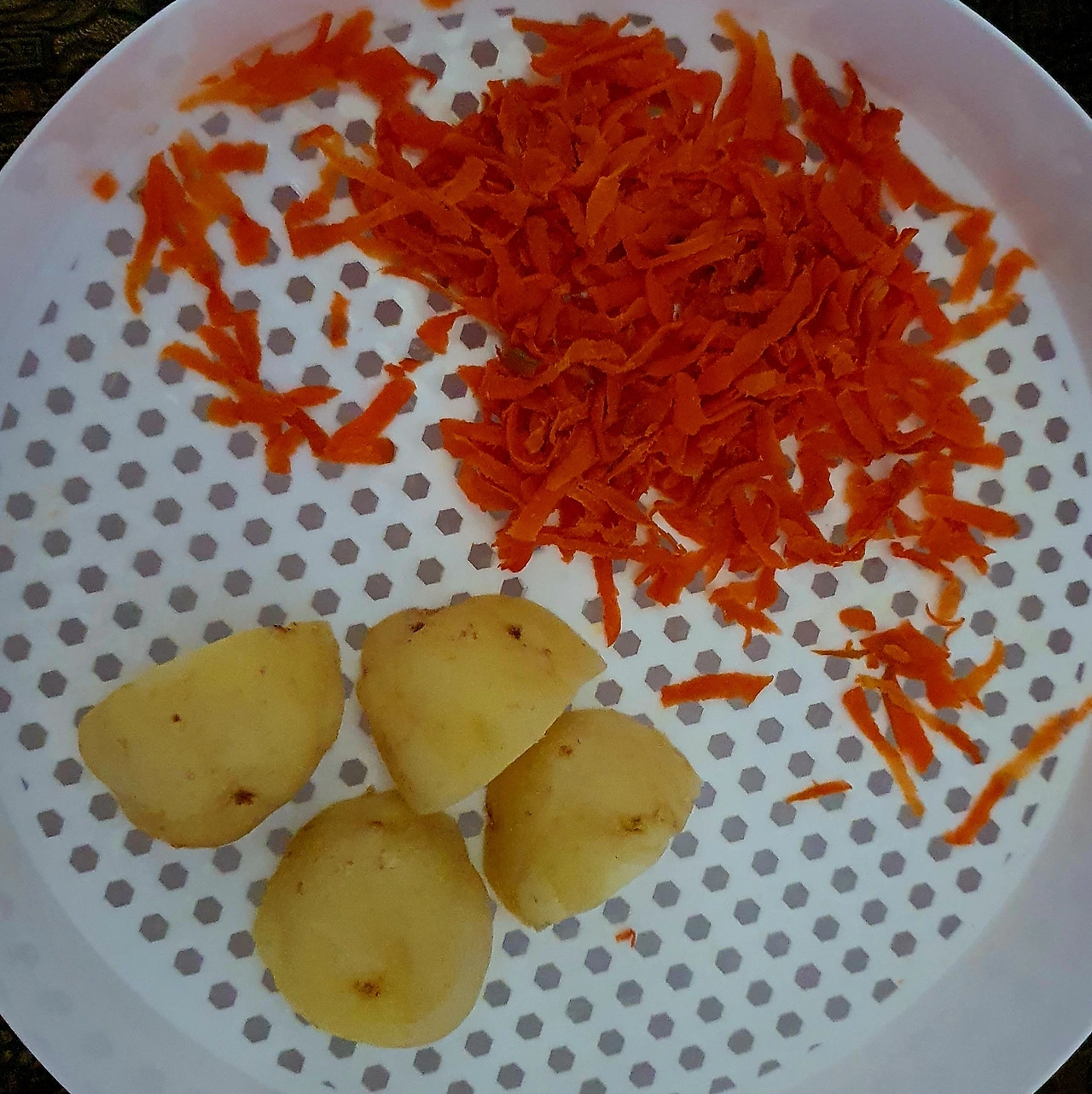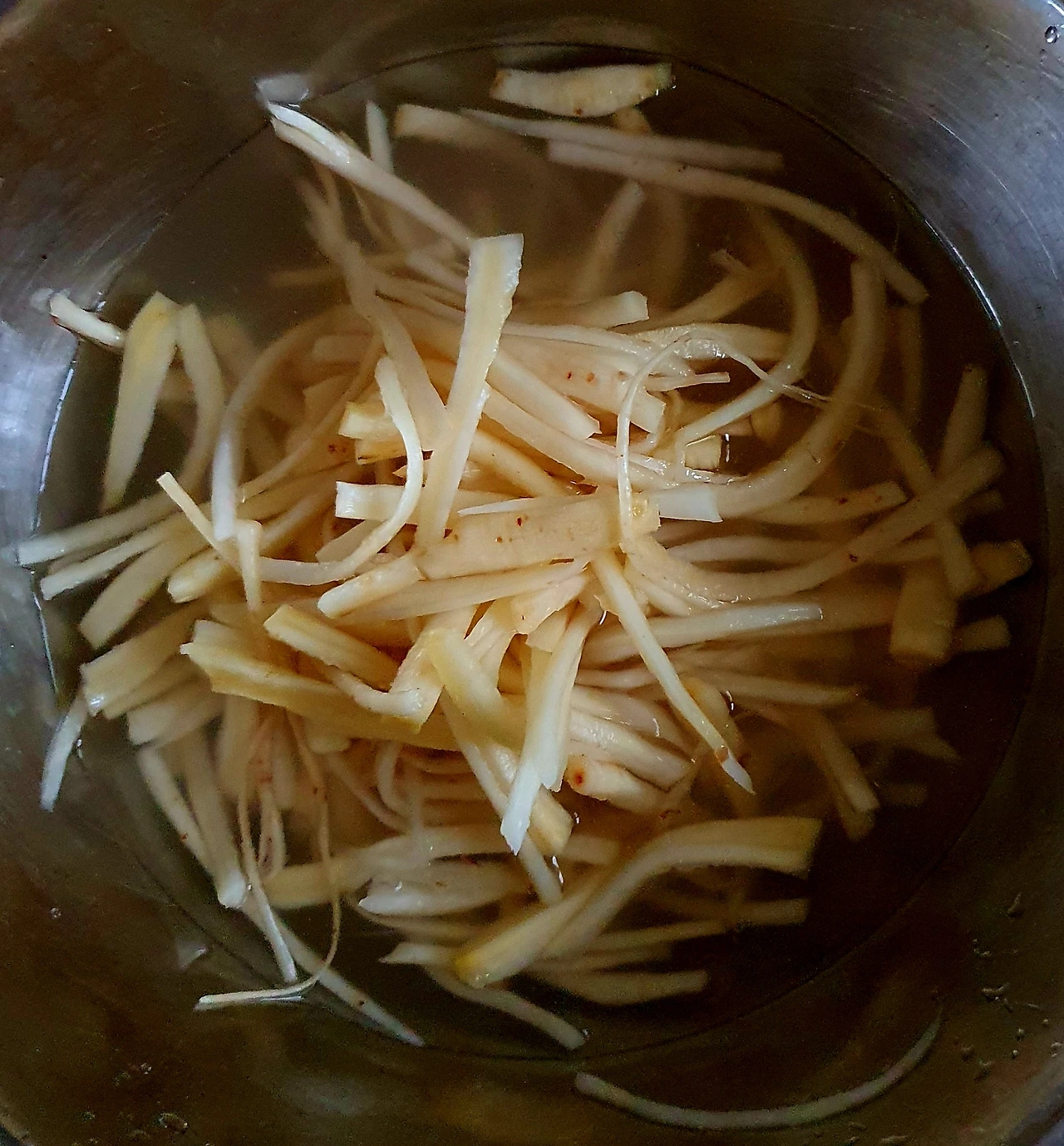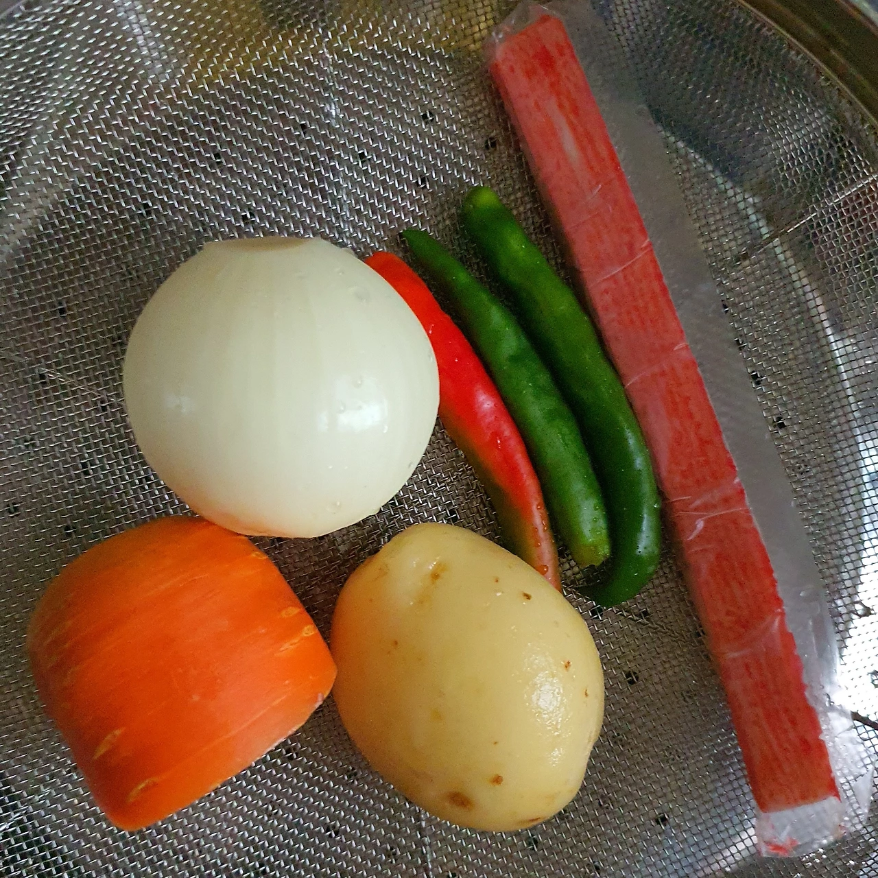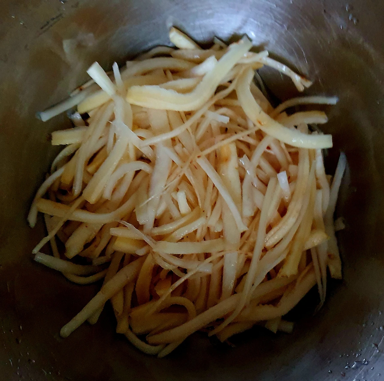 • 감자는 4등분으로 자르고 당근은 채를 썰어 전자랜즈에 돌려 삶아 주고, 맛살은 잘게 찌져서 준비하고, 무 장아찌는 잘게 다져서 준비한다.