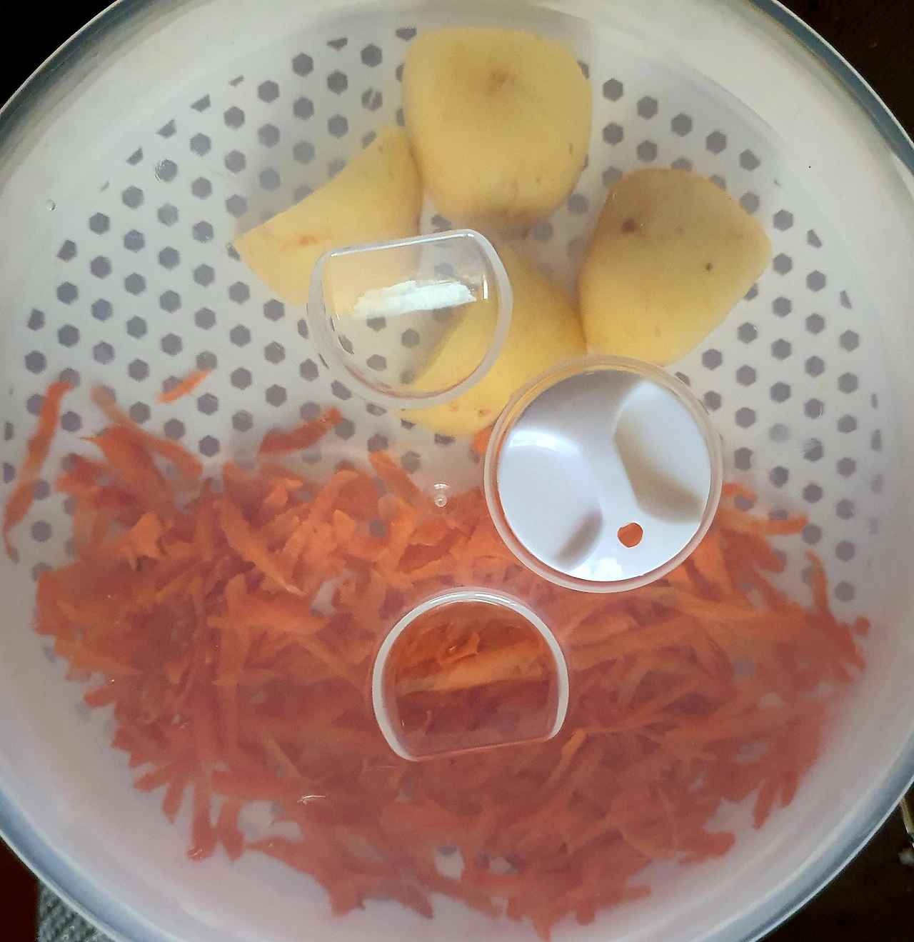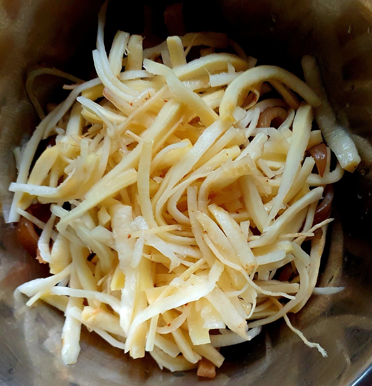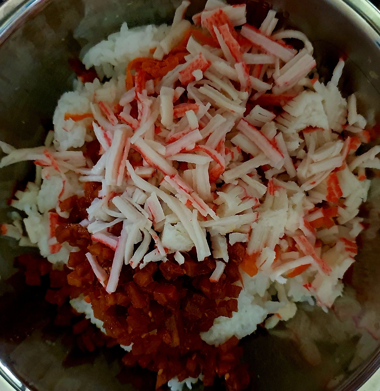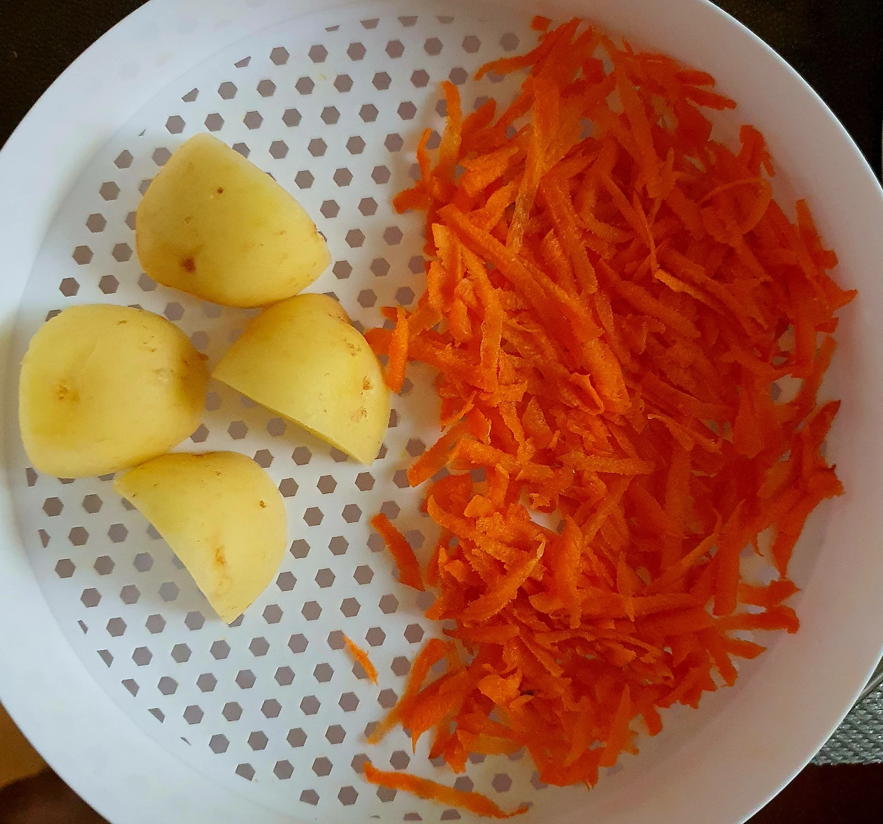 • 감자는 4등분으로 자르고 당근은 채를 썰어 전자랜즈에 돌려 삶아 주고, 맛살은 잘게 찌져서 준비하고, 무 장아찌는 잘게 다져서 준비한다.