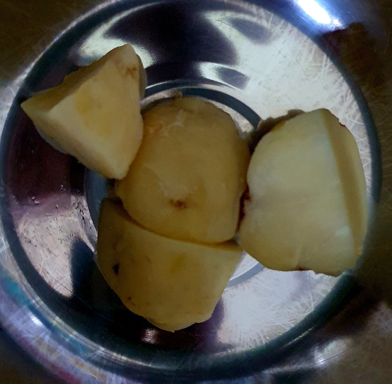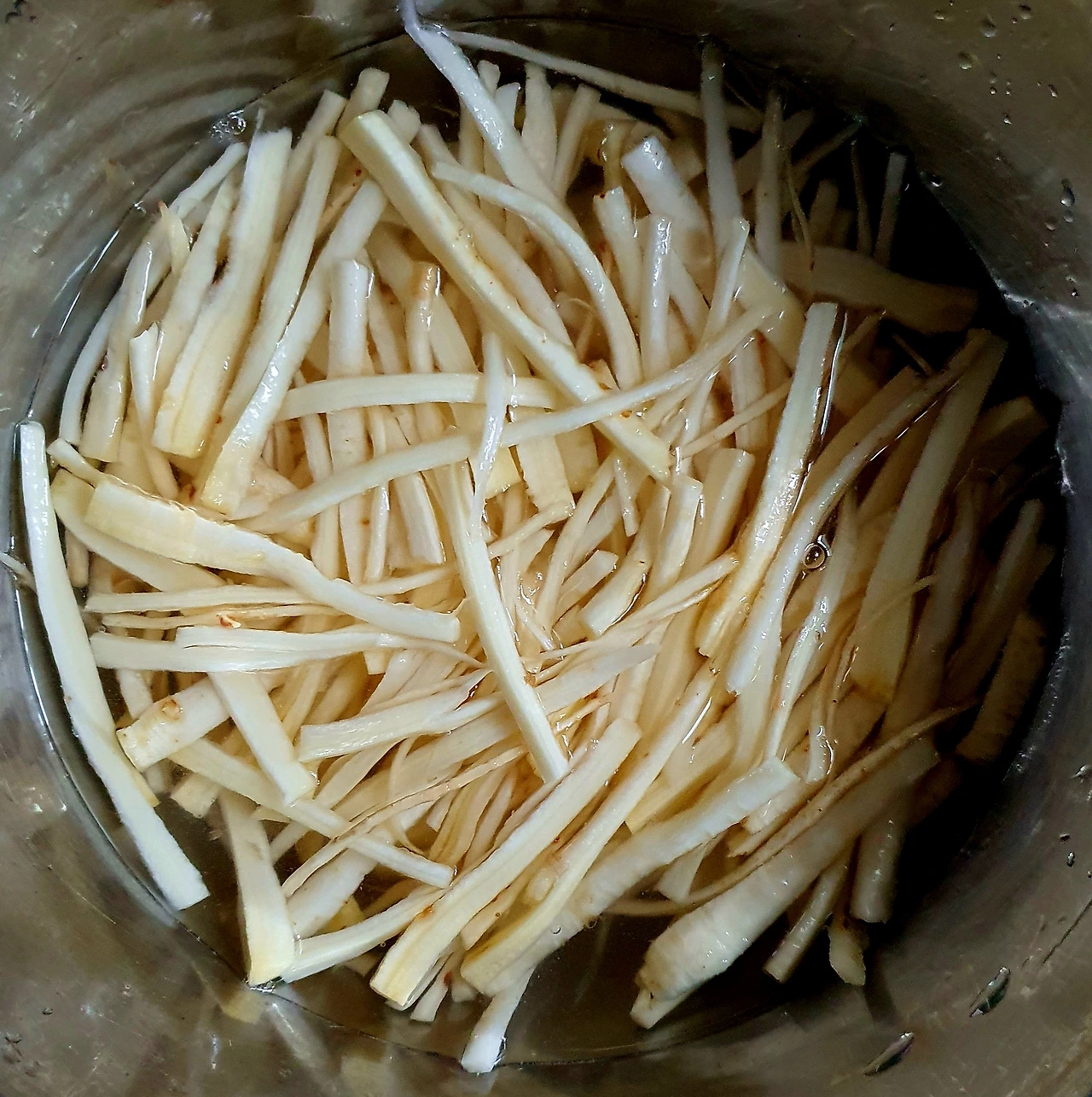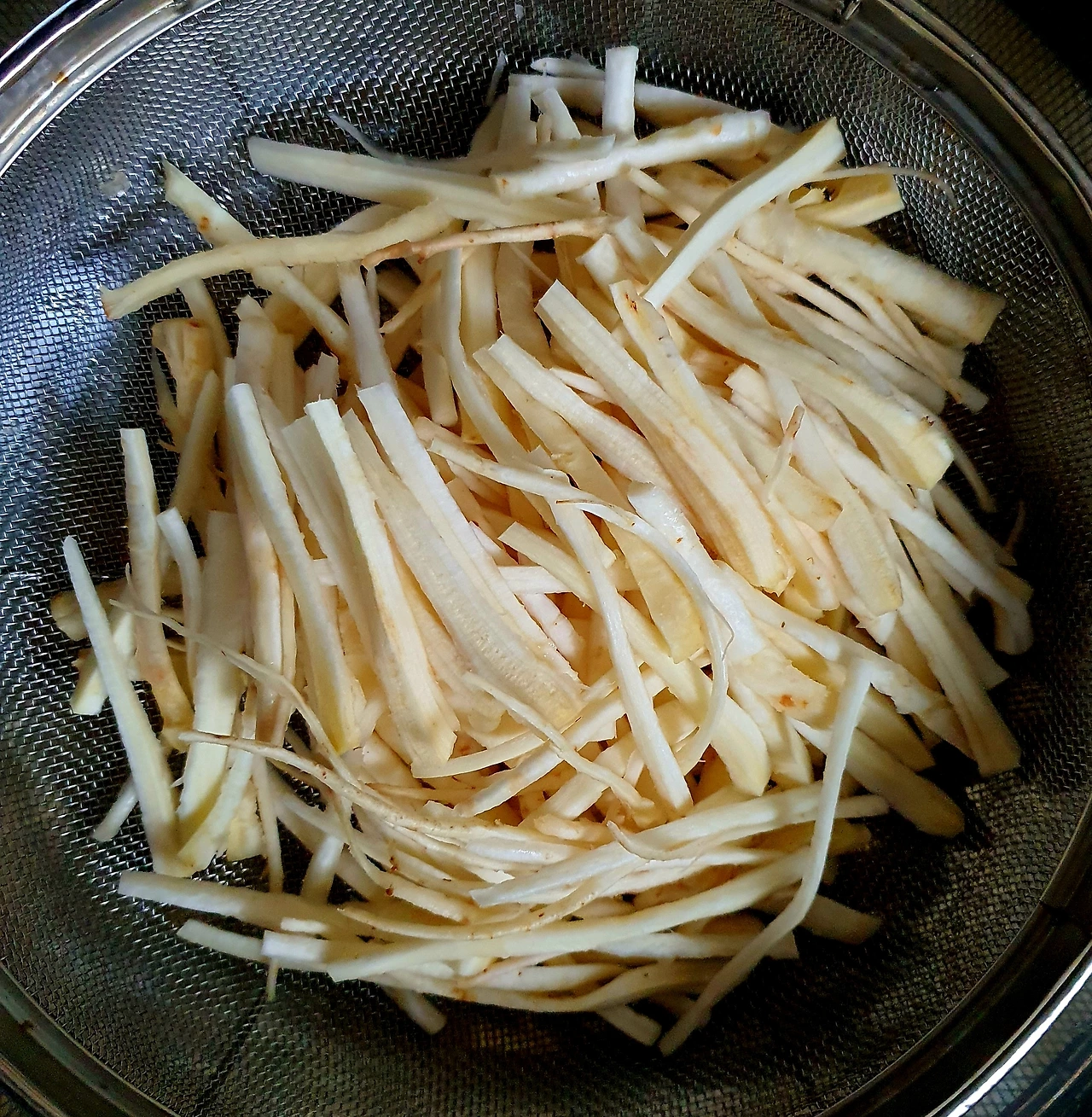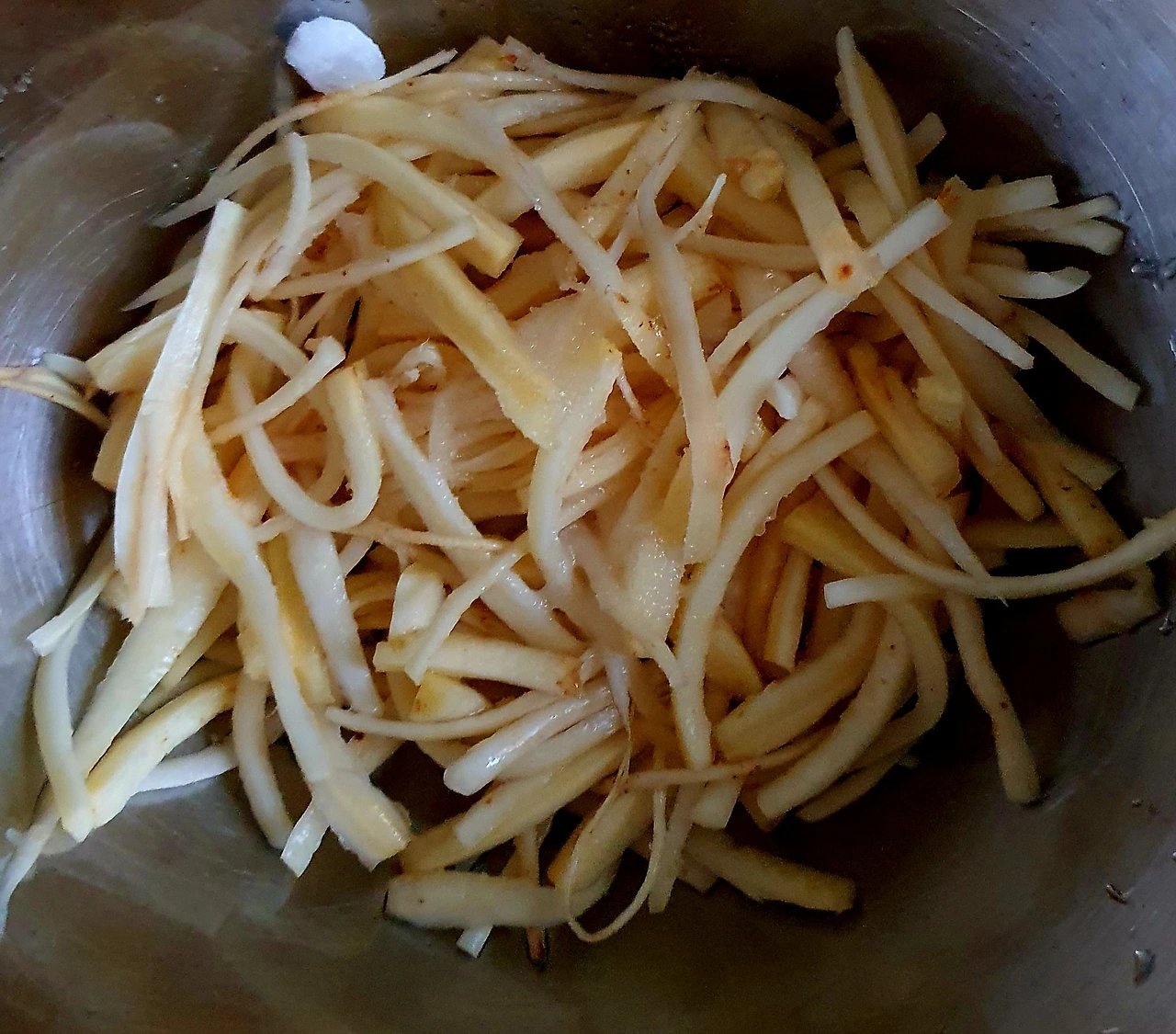 • 감자는 4등분으로 자르고 당근은 채를 썰어 전자랜즈에 돌려 삶아 주고, 맛살은 잘게 찌져서 준비하고, 무 장아찌는 잘게 다져서 준비한다.