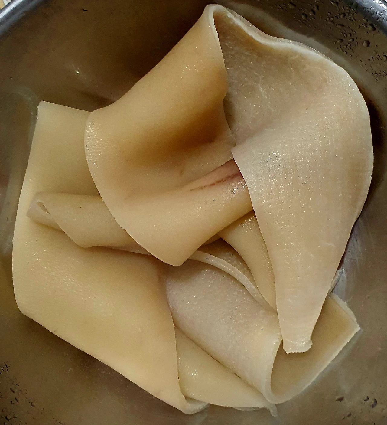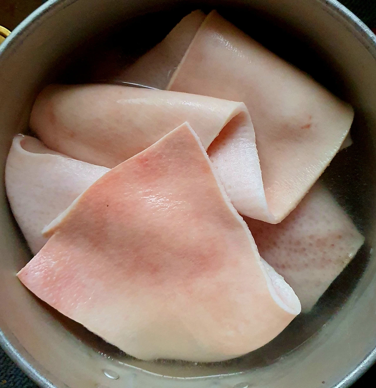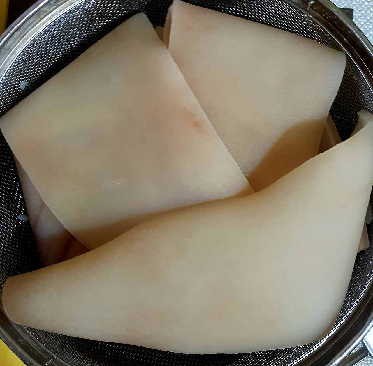 • 돼지껍질은 끓는 물에 4~5분 정도 데쳐서 안쪽에 남은 기름기를 칼로 긁어 모두 제거하고 깨끗이 씻어내면 특유의 돼지 냄새가 없어진다.