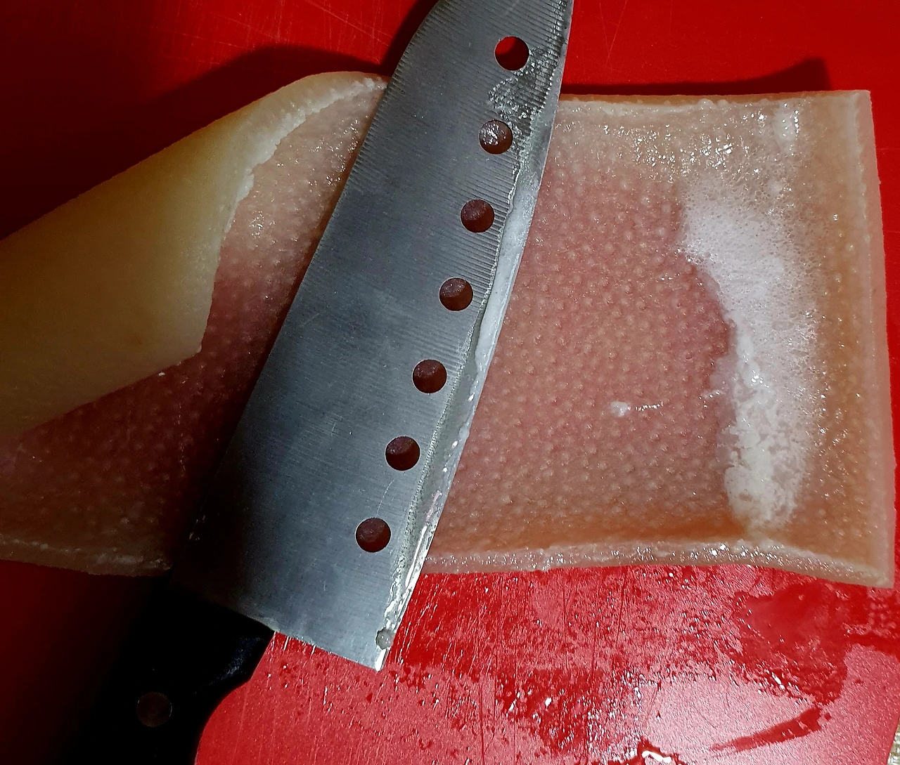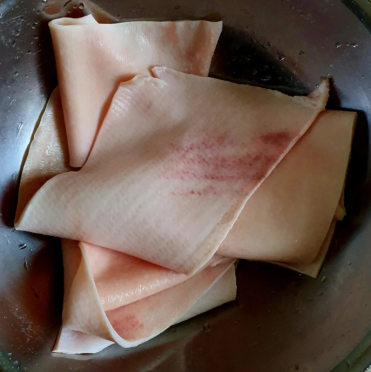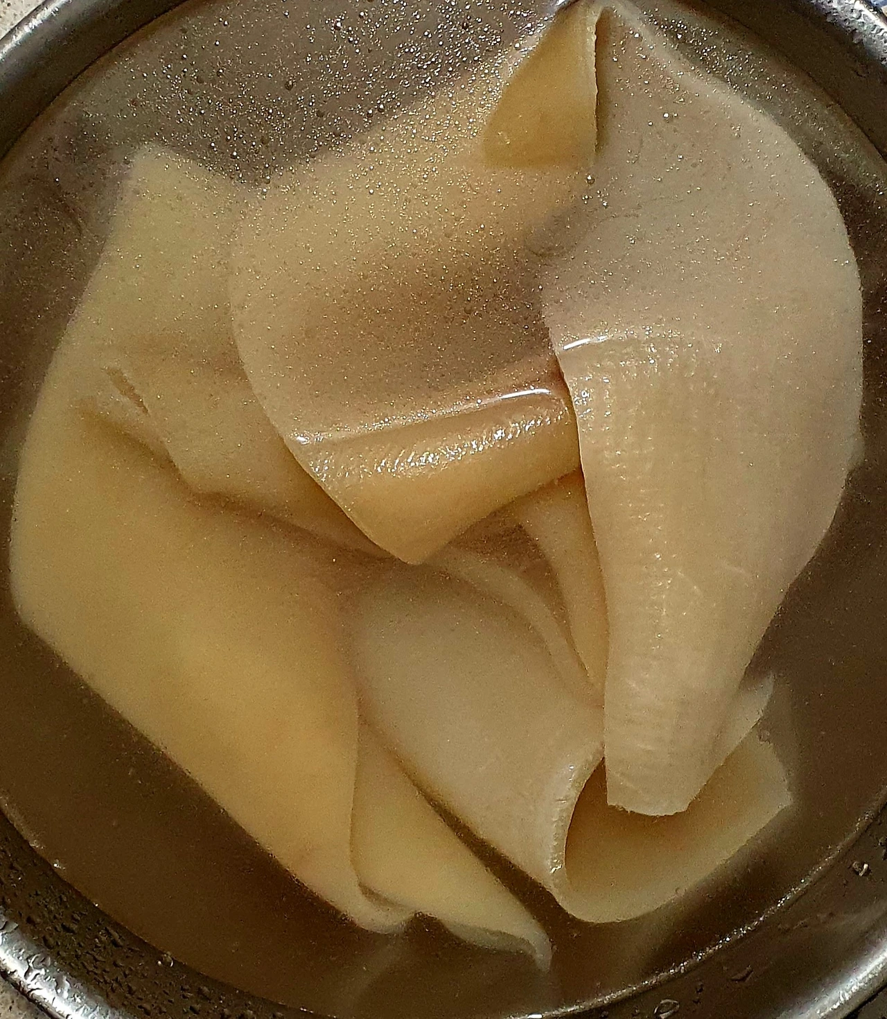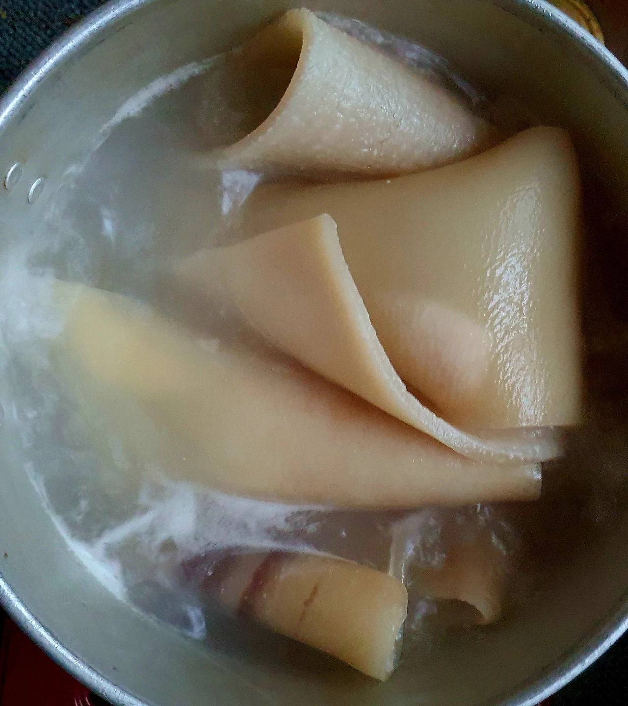 • 돼지껍질은 끓는 물에 4~5분 정도 데쳐서 안쪽에 남은 기름기를 칼로 긁어 모두 제거하고 깨끗이 씻어내면 특유의 돼지 냄새가 없어진다.