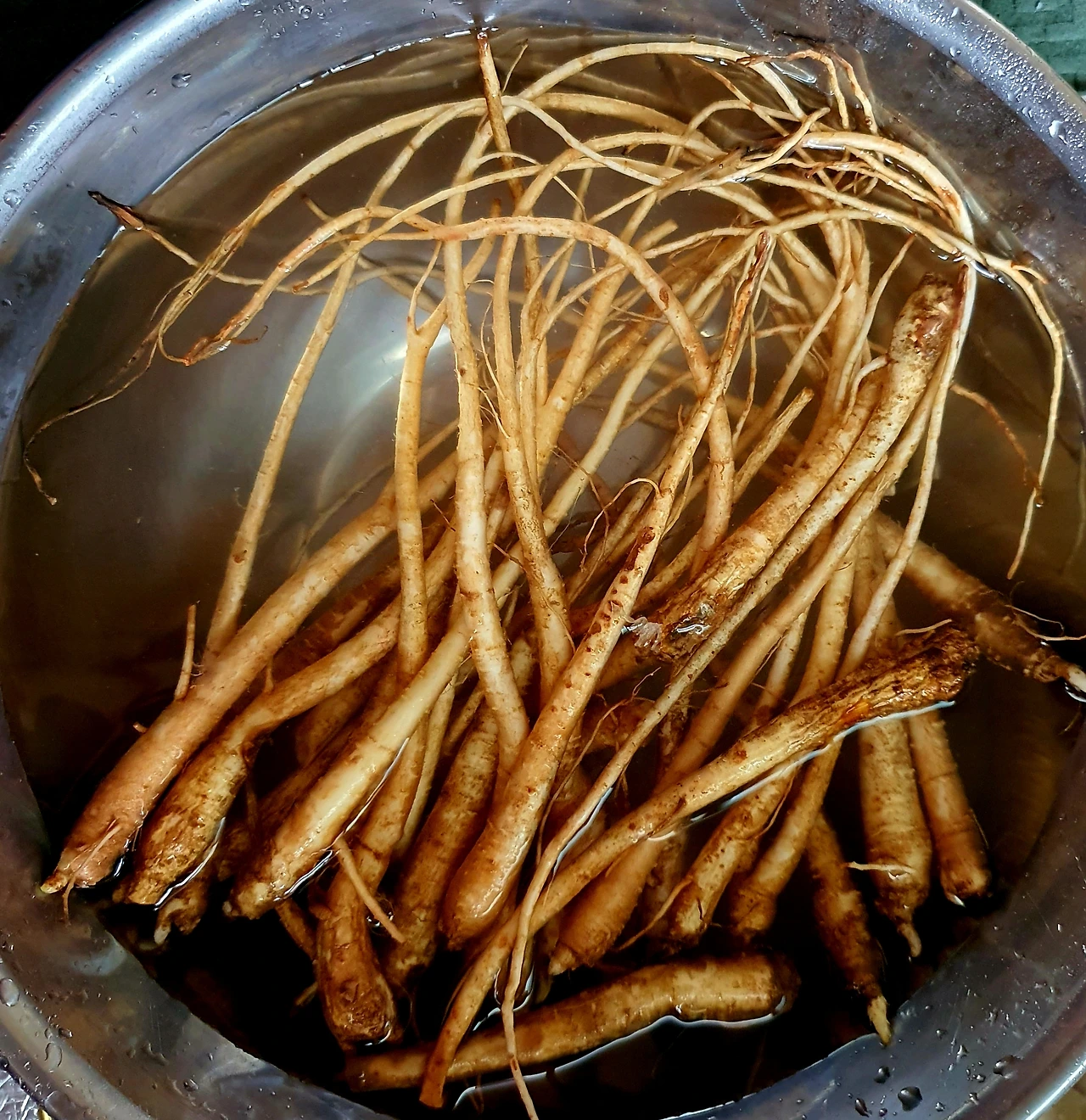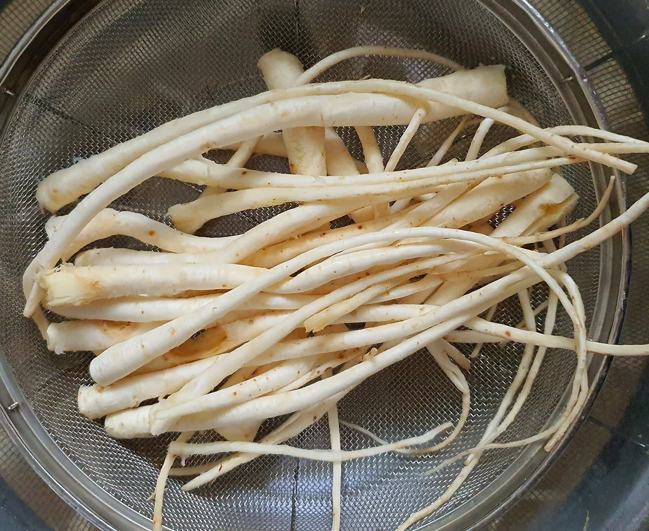 • 도라지는 잔뿌리를 떼어내고 칼등으로 긁어 껍질을 벗긴 다음 먹기 좋은 굵기로 찢어서 굵은소금을 약간 넣은 물에 30분에서 1시간 정도 담가주면서 주물러 쓴맛을 제거하고 부드럽게 만든다.