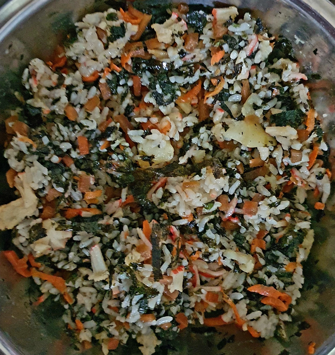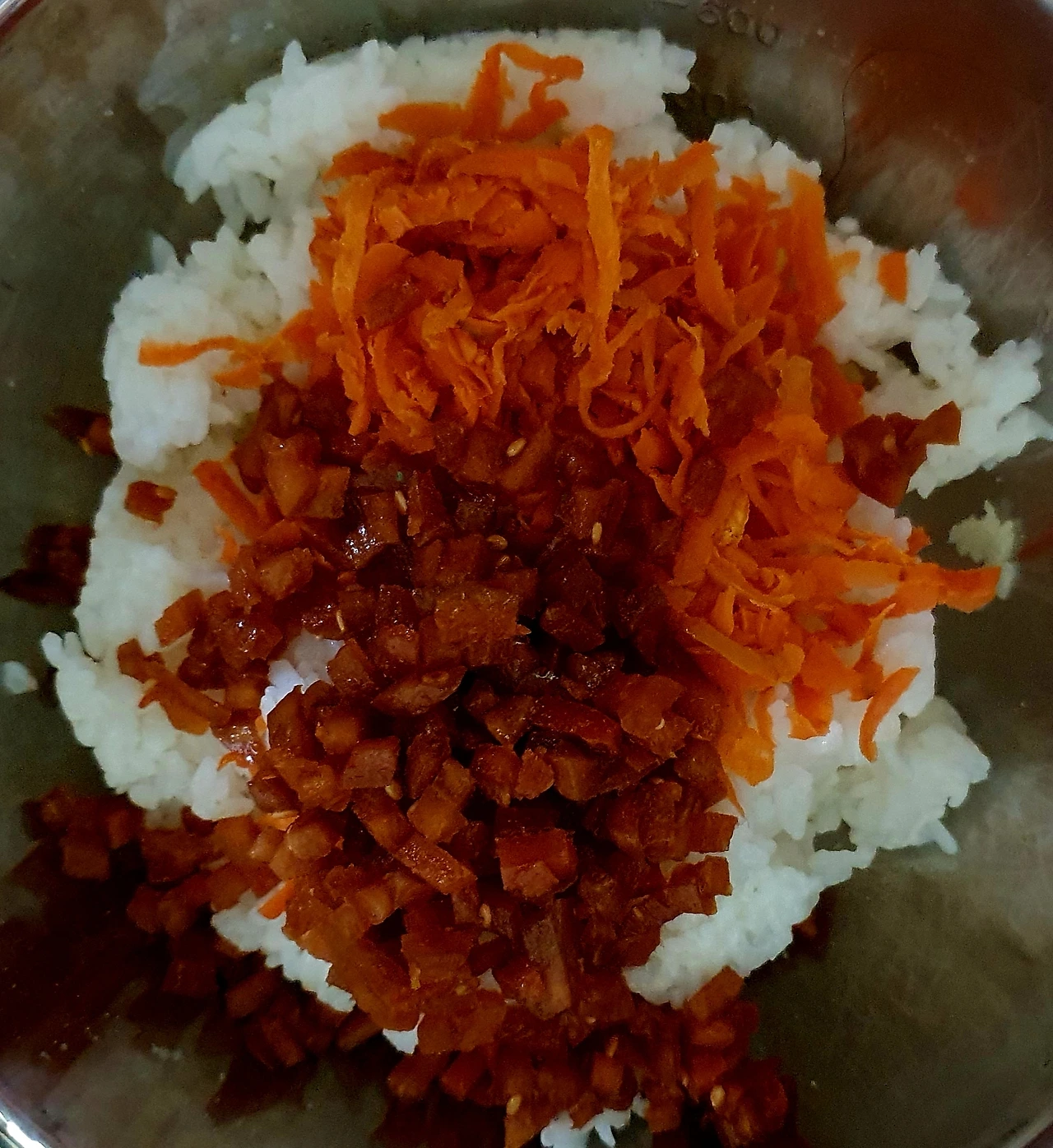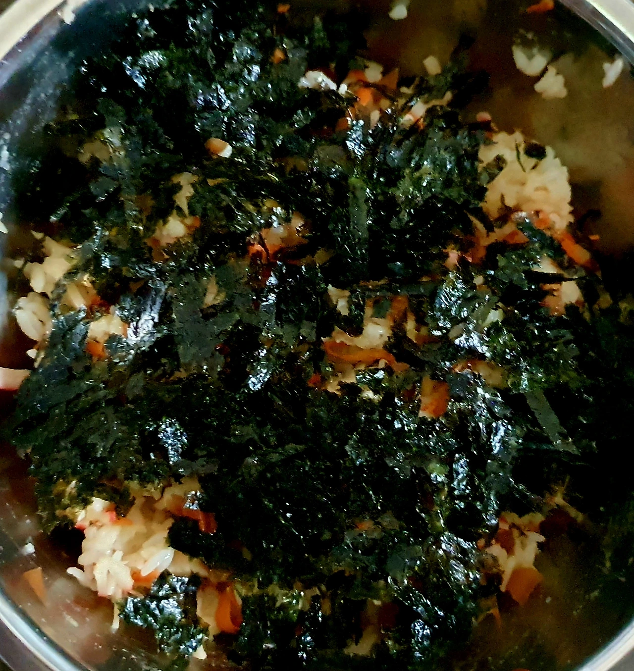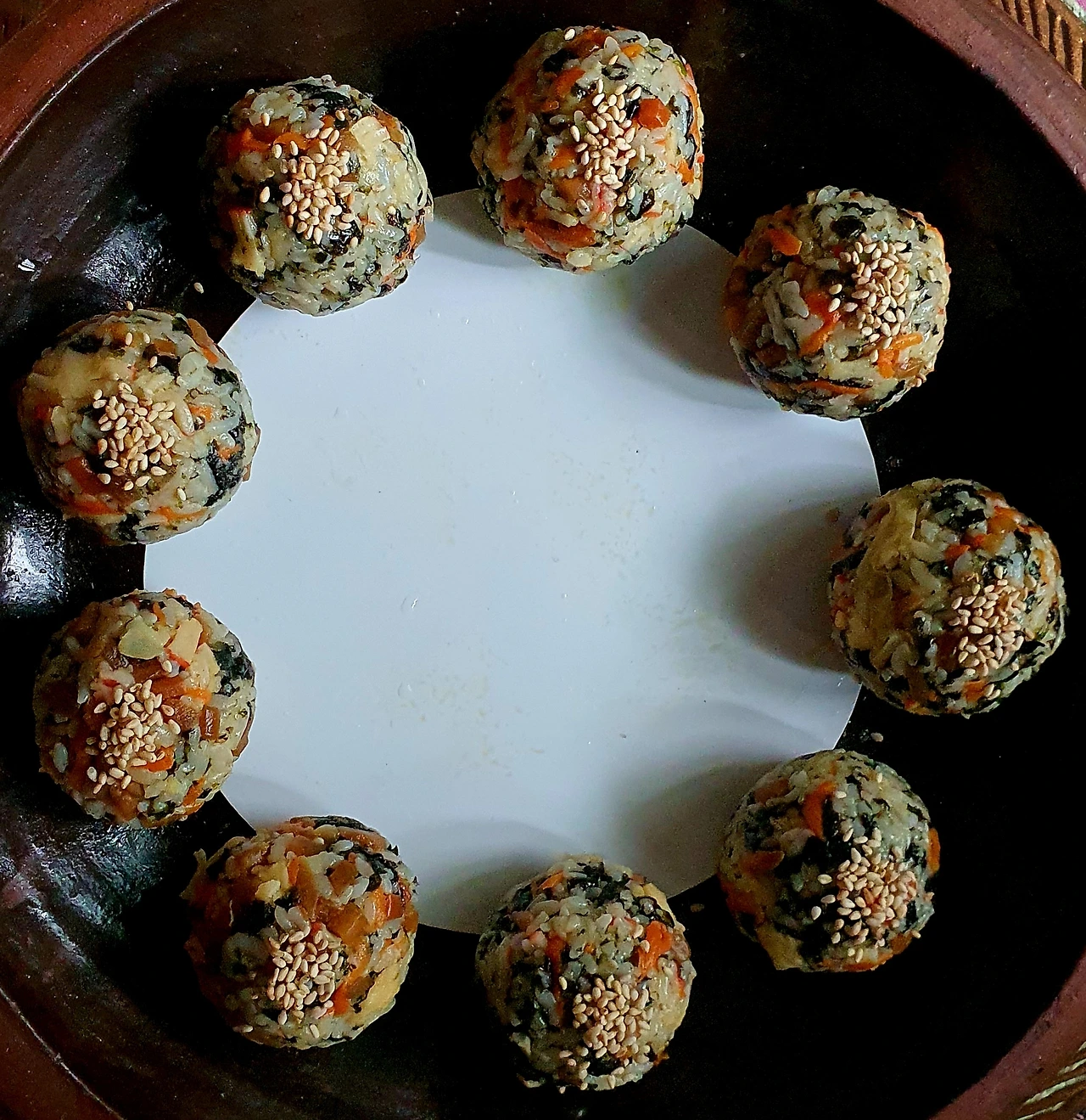 • 밥 한 공기와 삶은 감자. 당근과 다진 무장아찌. 맛살. 참기름. 김가루를 넣고 주먹밥을 만들어 준다.