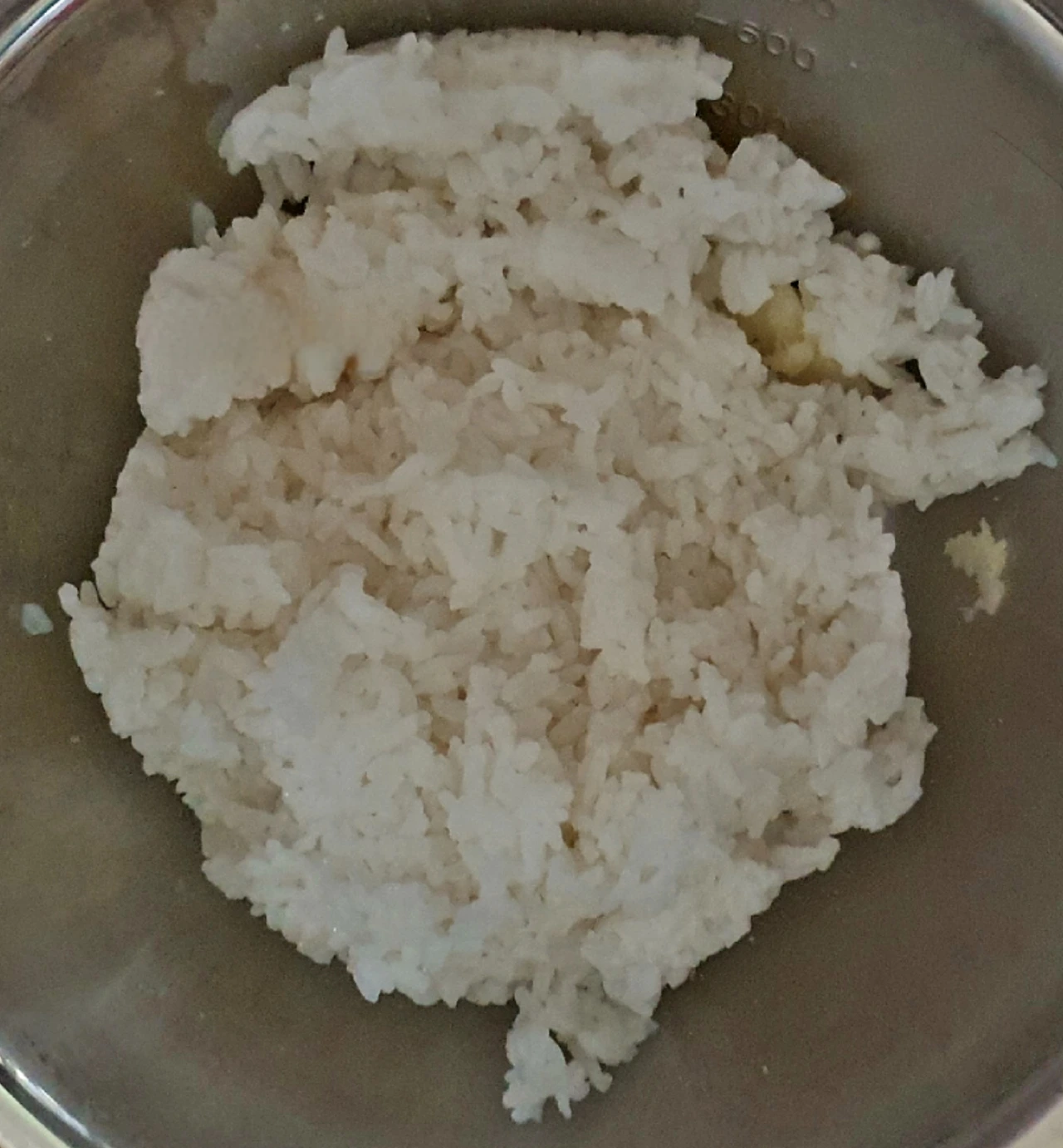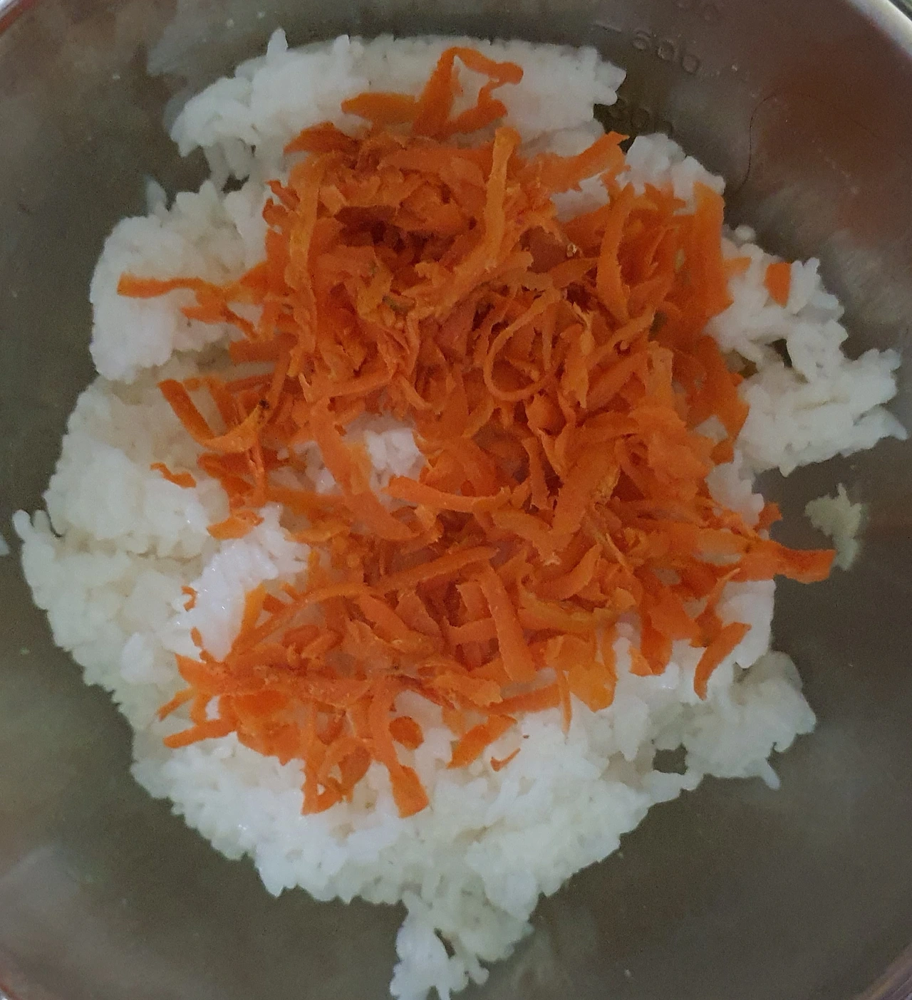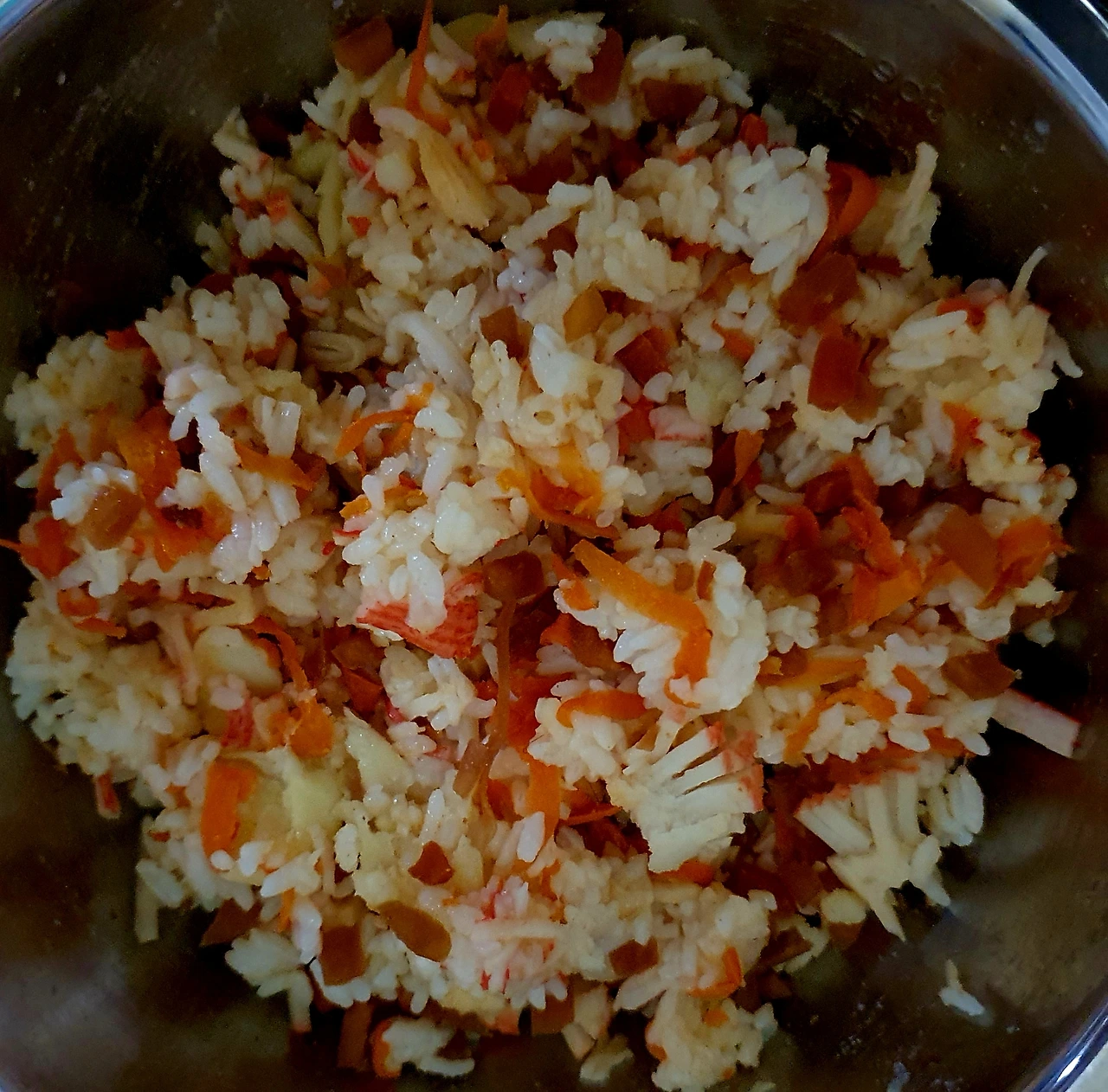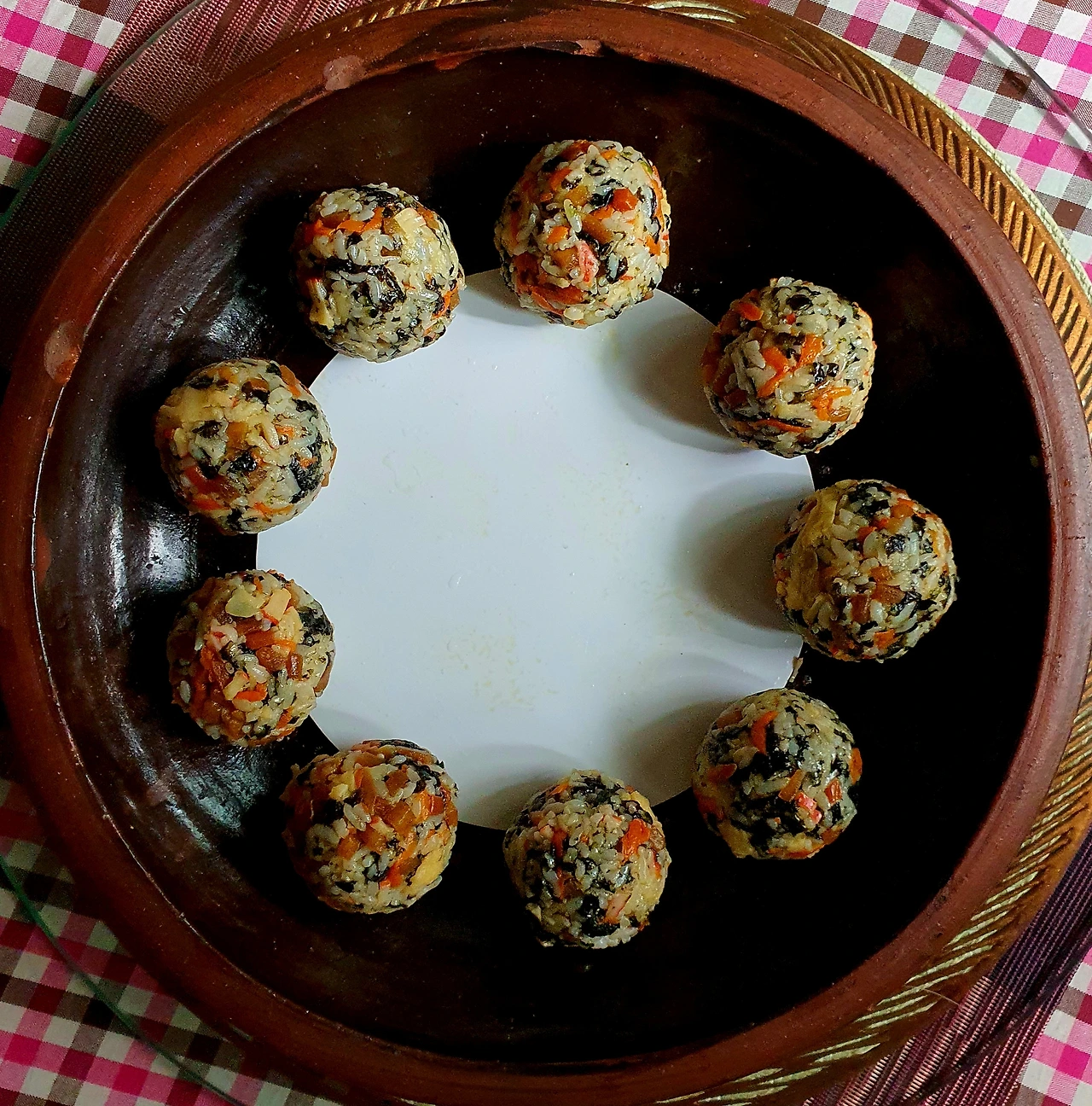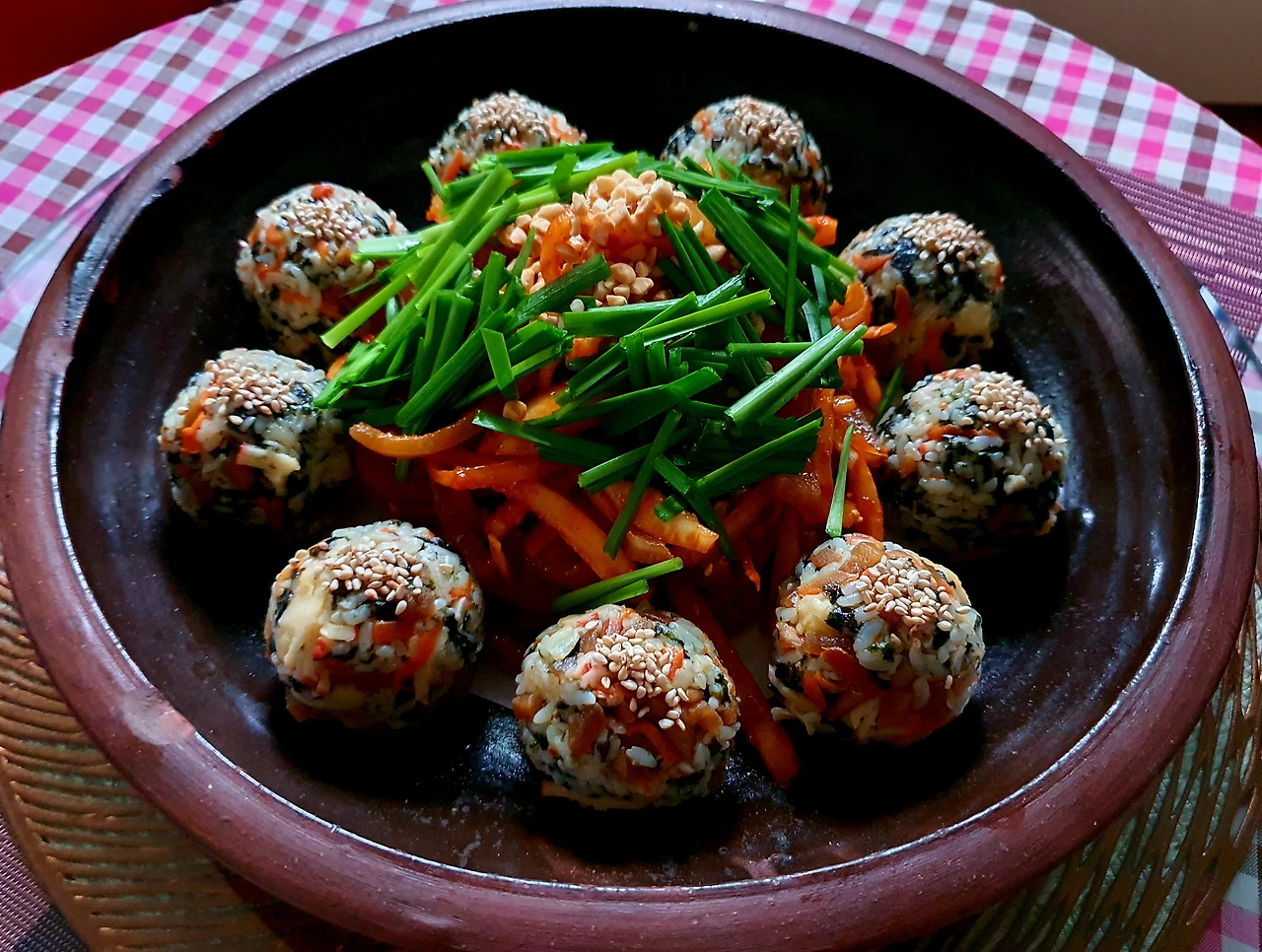 • 밥 한 공기와 삶은 감자. 당근과 다진 무장아찌. 맛살. 참기름. 김가루를 넣고 주먹밥을 만들어 준다.