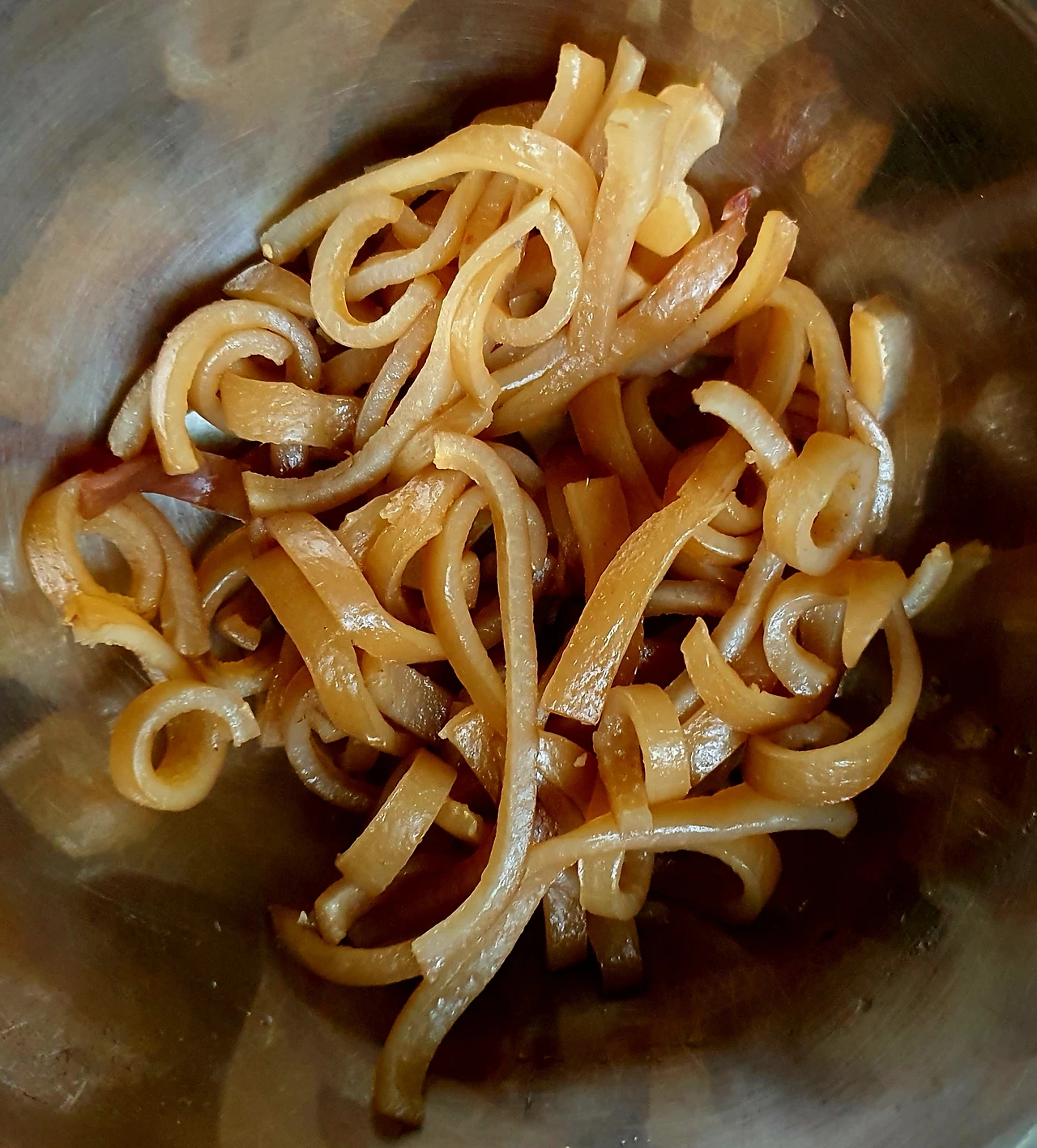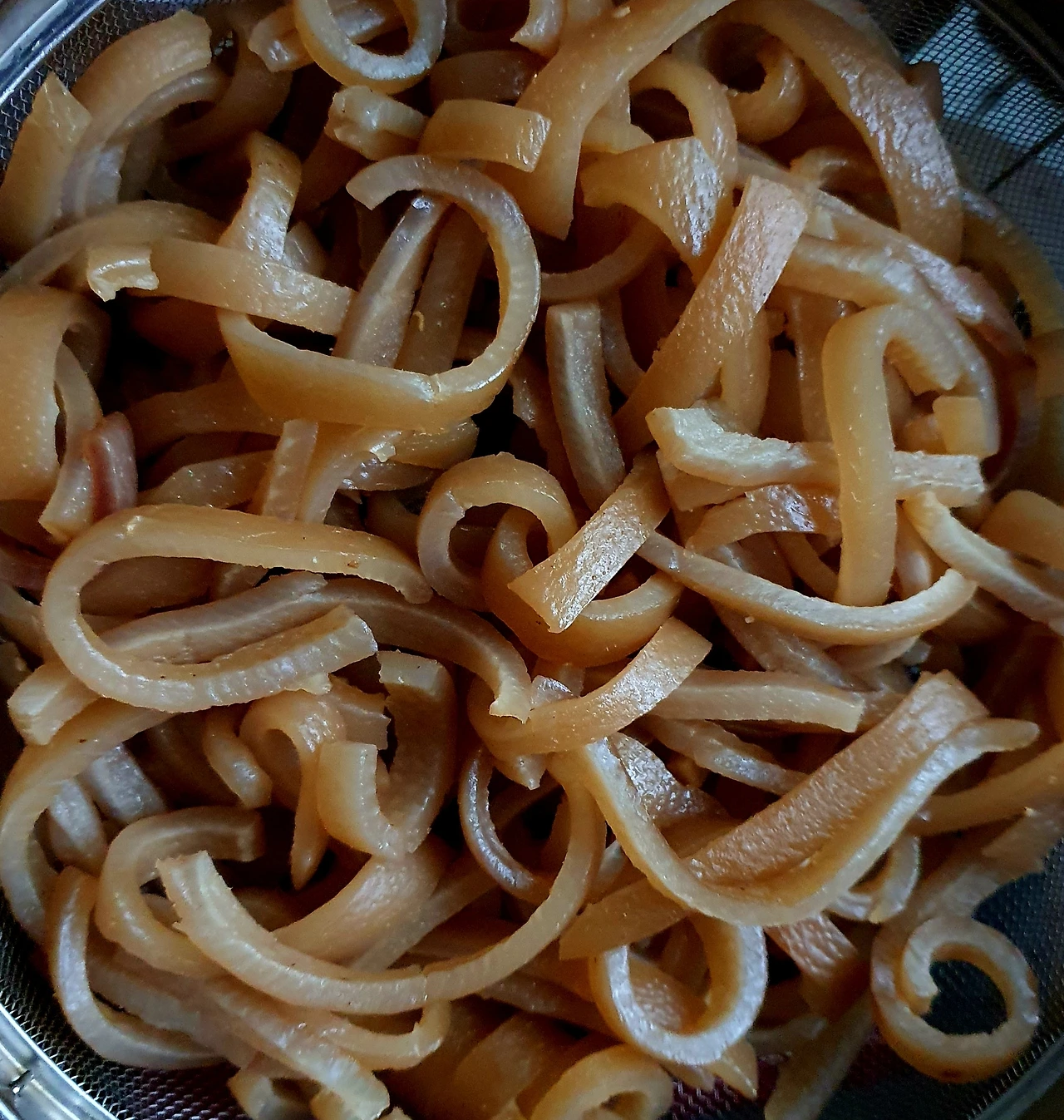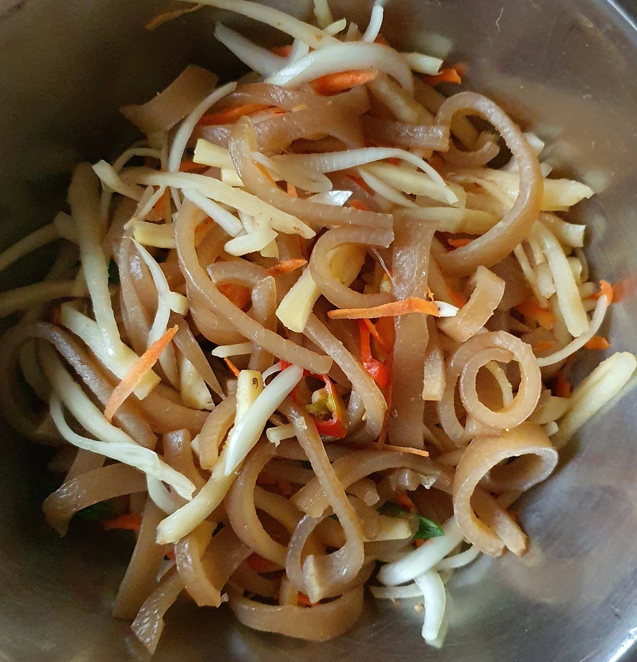 • 삶아진 껍데기는 쫄깃한 식감을 위해 채에 받쳐 수분을 제거한 후 먹기 좋은 크기로 잘게 채를 썰어 실온에서 식혀준다.
