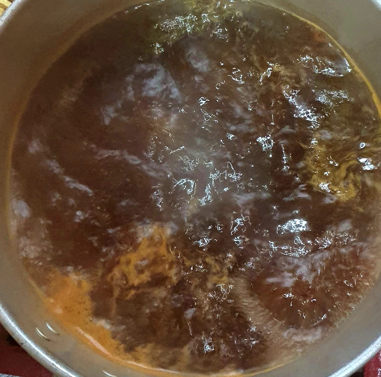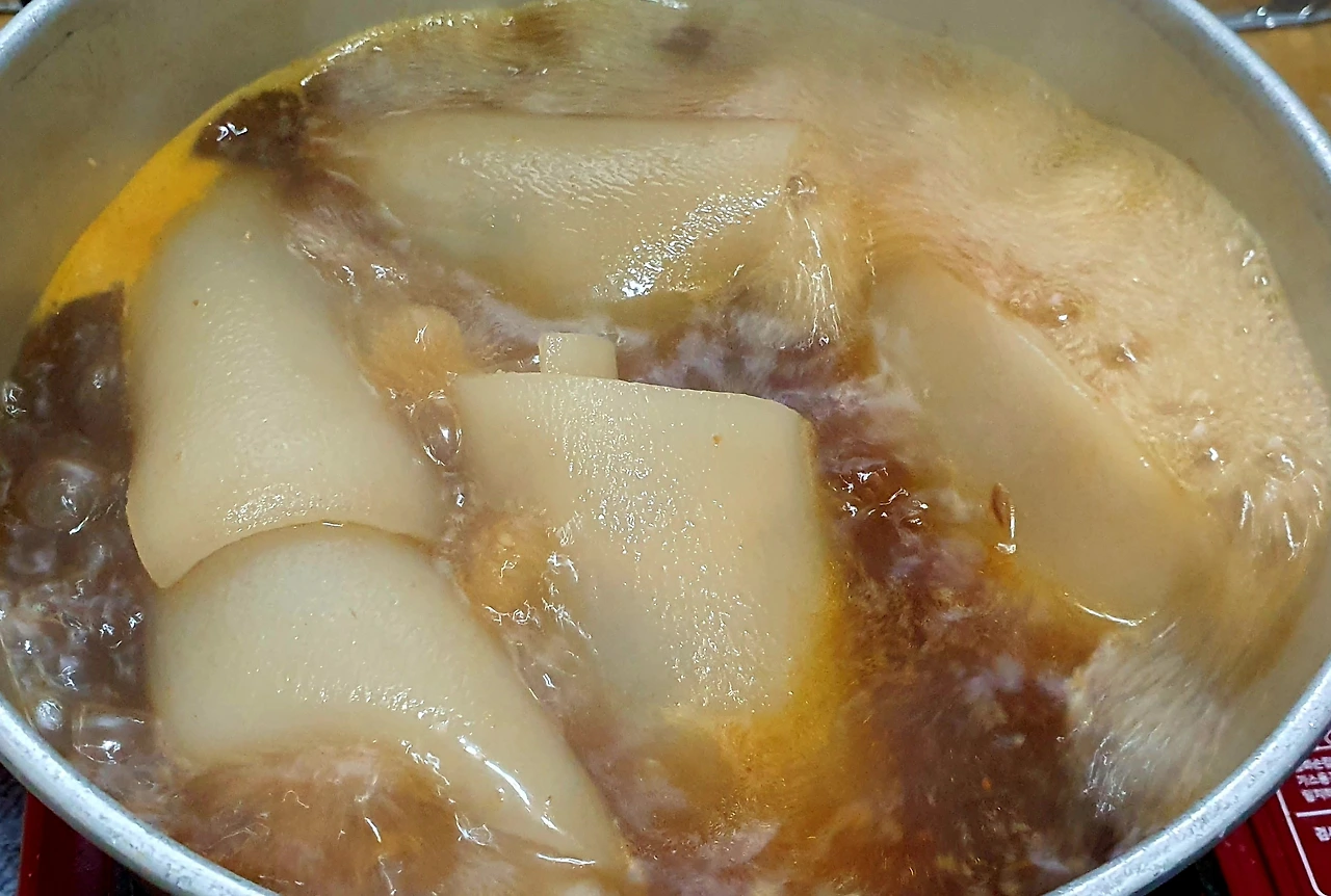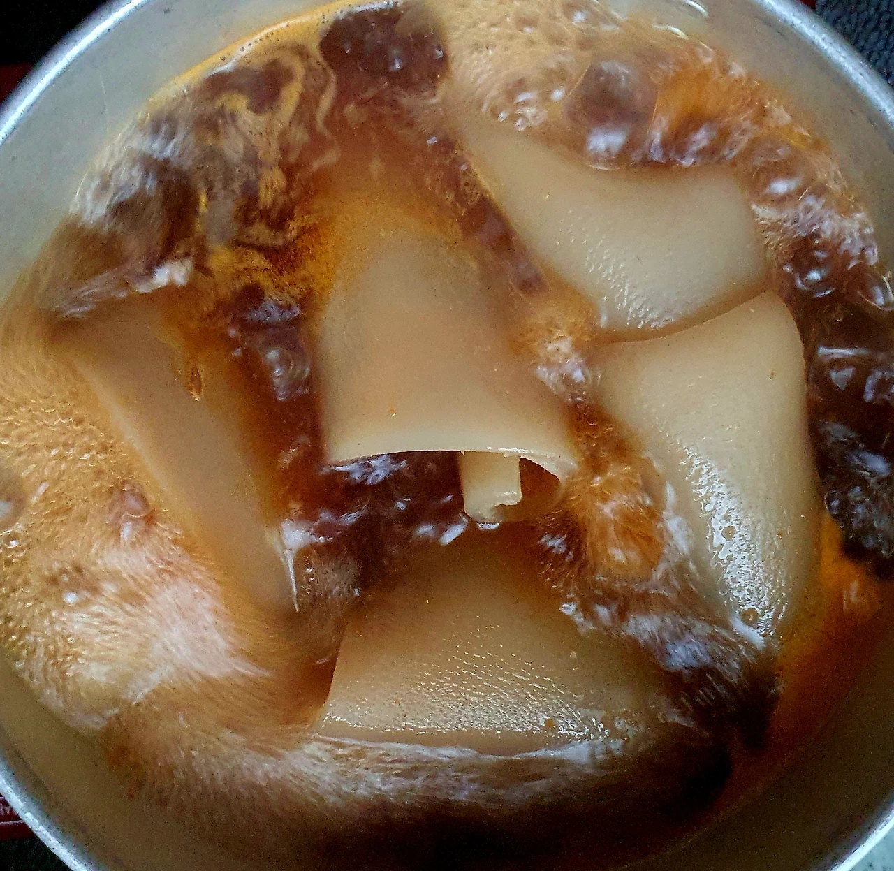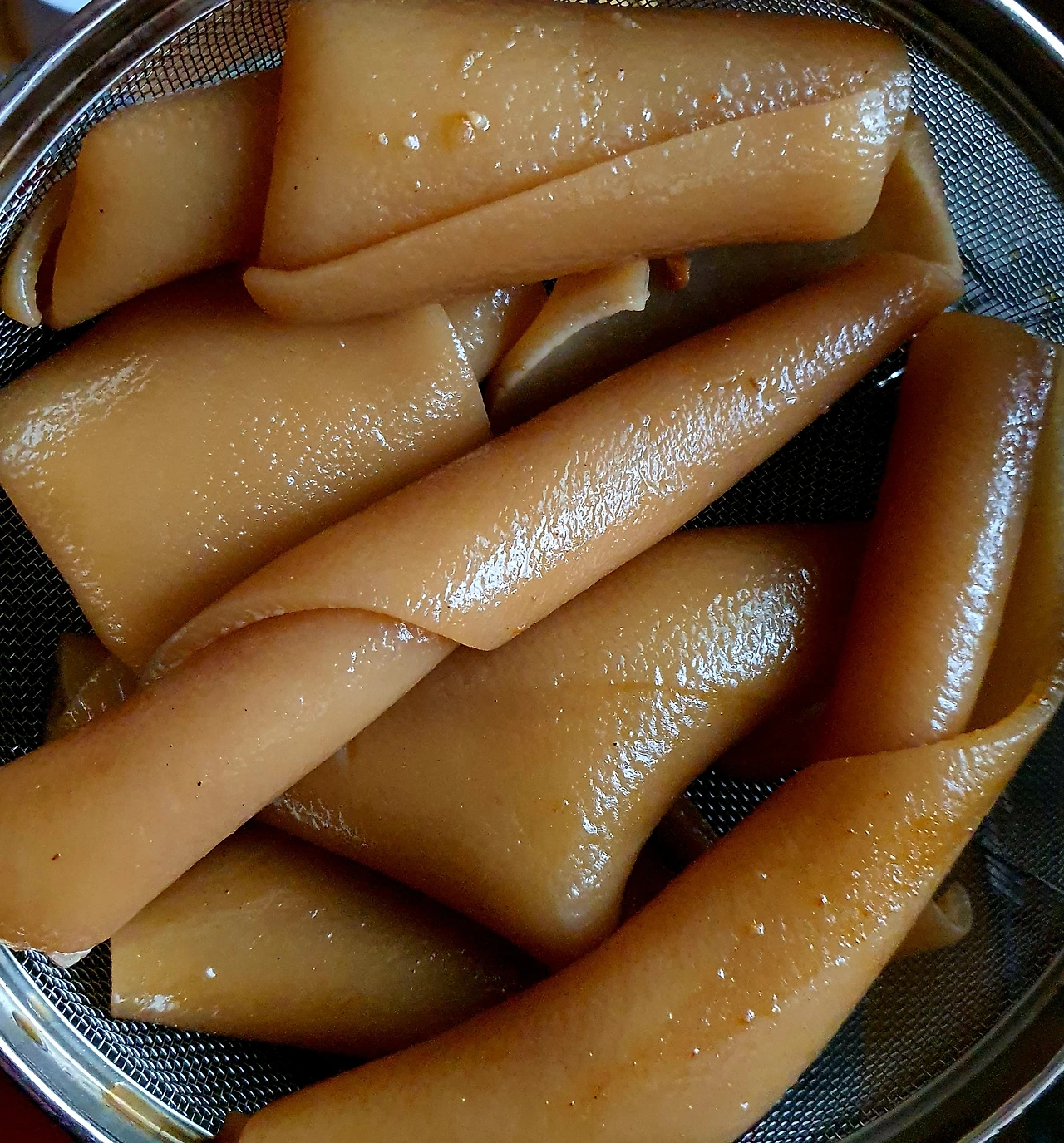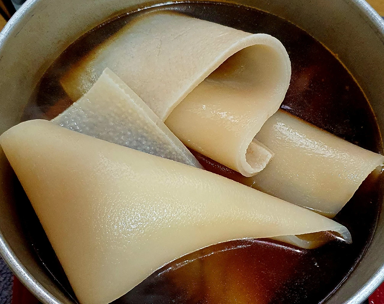 • 돼지껍질은 설탕½컵. 간장½컵. 국물진다시⅓컵. 된장 1큰술. 커피 1큰술. 물 10컵. 매실청 2큰술. 소주 1컵을 넣고 20분 정도 삶아준다.