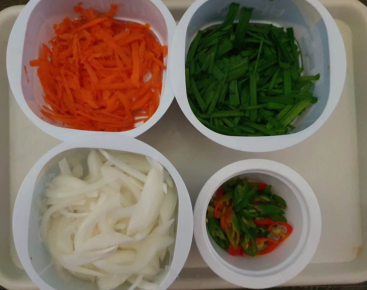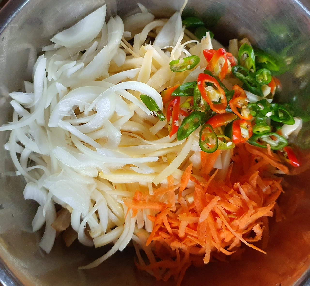 • 밑간에 버무린 도라지는 20분 정도 재웠다 도라지의 물기를 꼭 짜서 준비하고, 청양고추는 어슷 썰어 준비한다. 당근. 양파는 채를 썰어 준비한다. 부추는 고명용으로 썰어둔다.