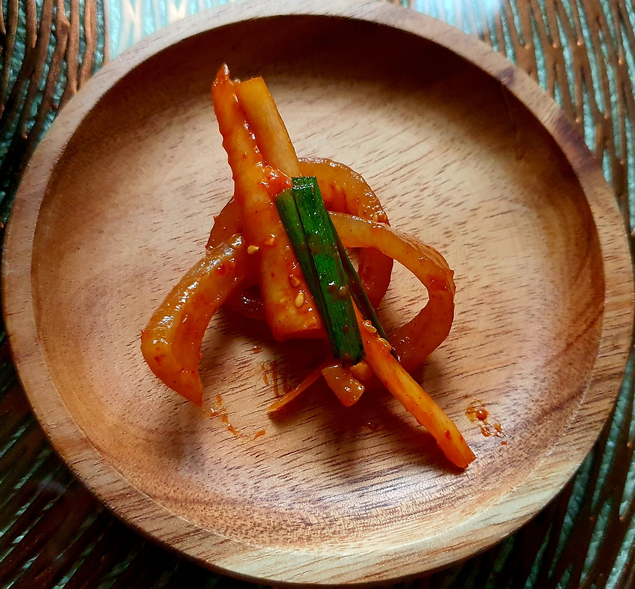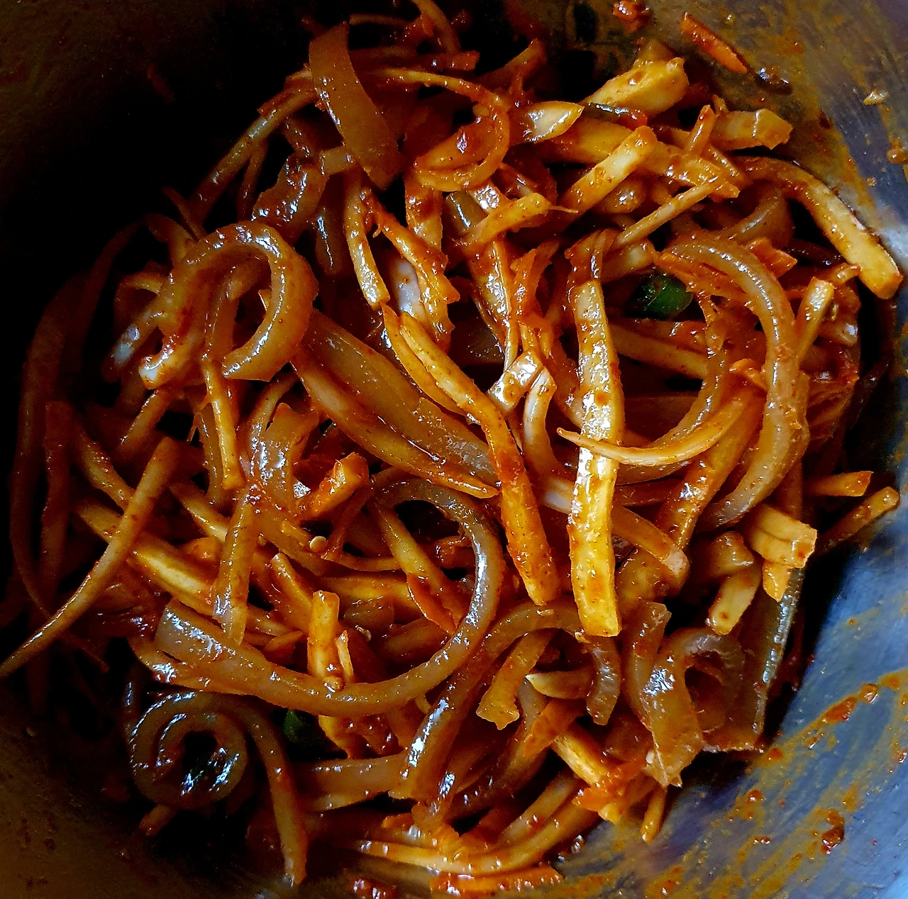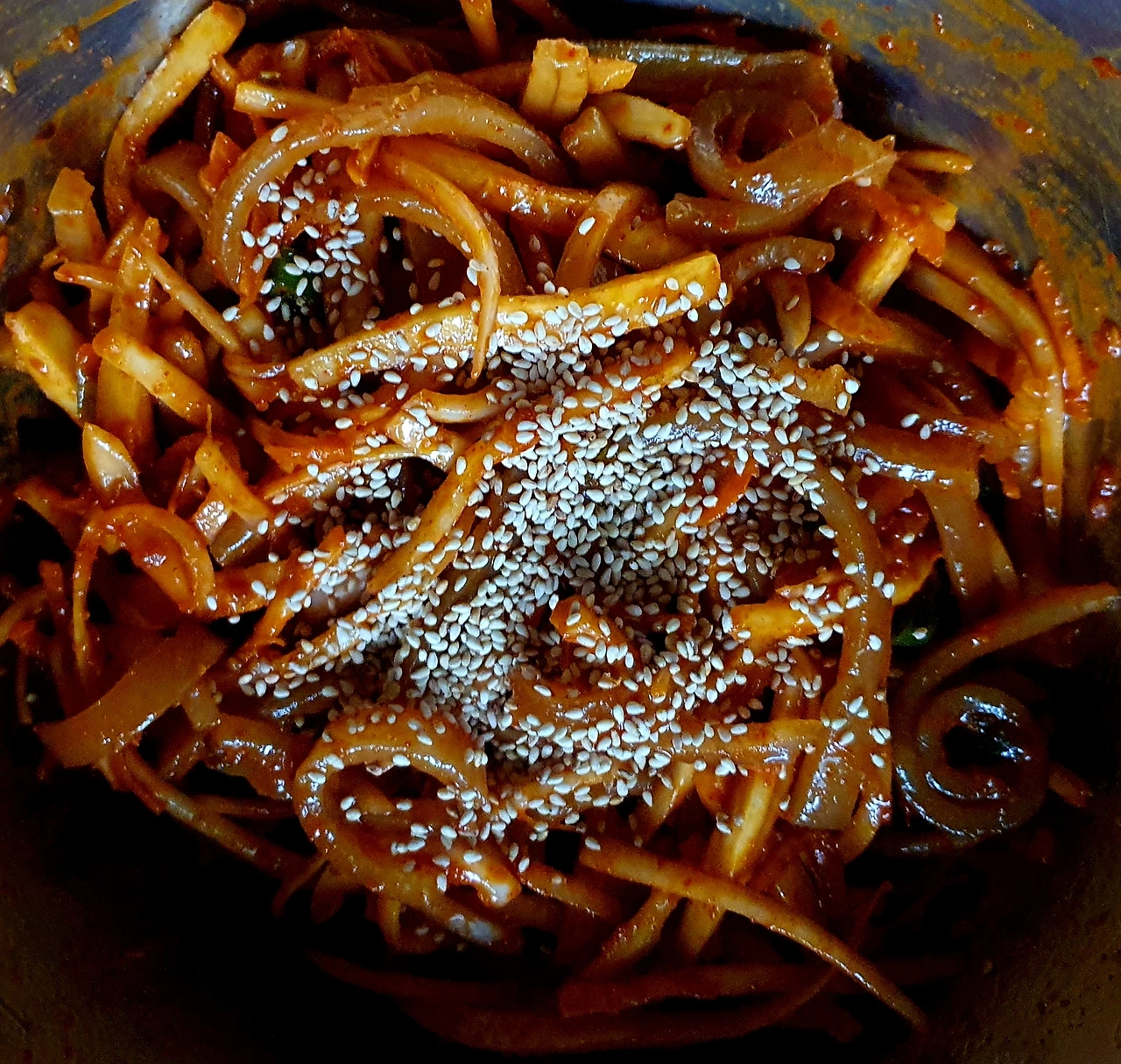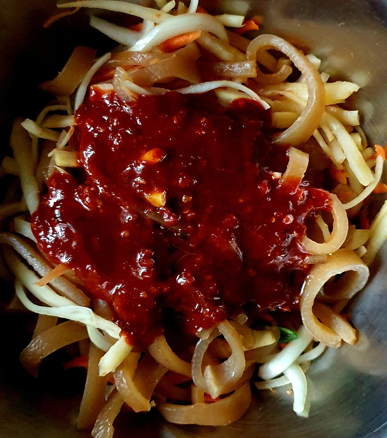 ■ 양념 : 시판초고추장 2큰술. 고추장 ½큰술. 고춧가루 2큰술. 간장 1큰술. 진다시 ½큰술. 감식초 3큰술. 간 마늘 2큰술. 원당 1큰술. 고추냉이 1큰술. 요리당 1큰술. 매실청 2큰술. 참기름 2큰술. 통깨 1큰술
