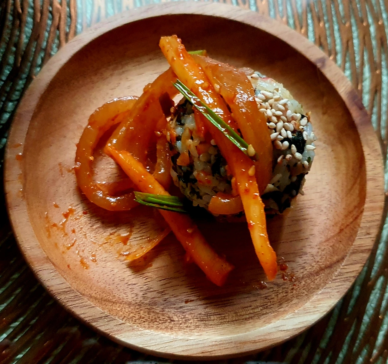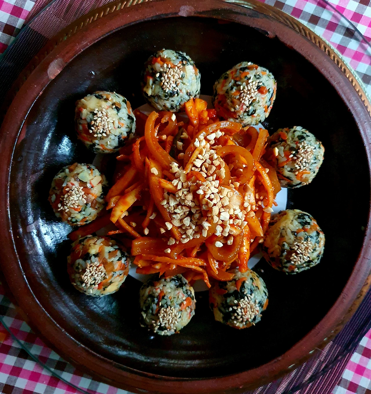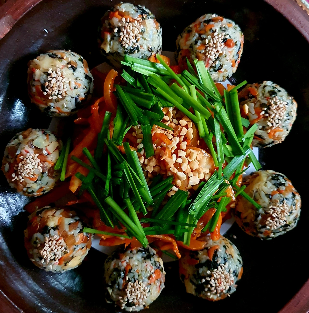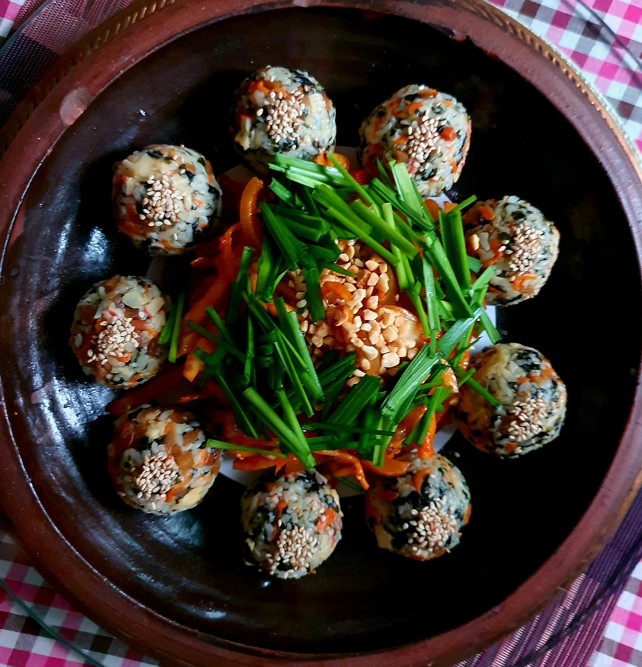 • 항아리뚜껑에 주먹밥을 돌려 감고 가운데 껍데기 초무침을 올려주고 마무리로 부추를 보기 좋게 올려주고, 땅콩가루와 통깨를 살살 뿌려주면 껍데기 도라지무침 완성.