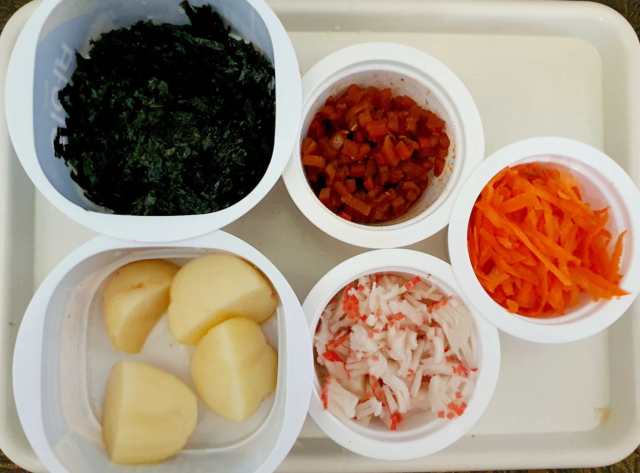 ■ 곁들임 : 밥 1공기. 감자 1개. 무장아찌 조금. 당근 조금. 맛살 1줄. 참기름. 김가루