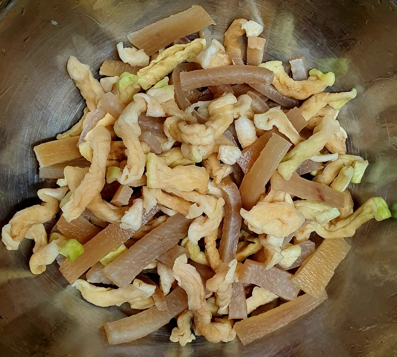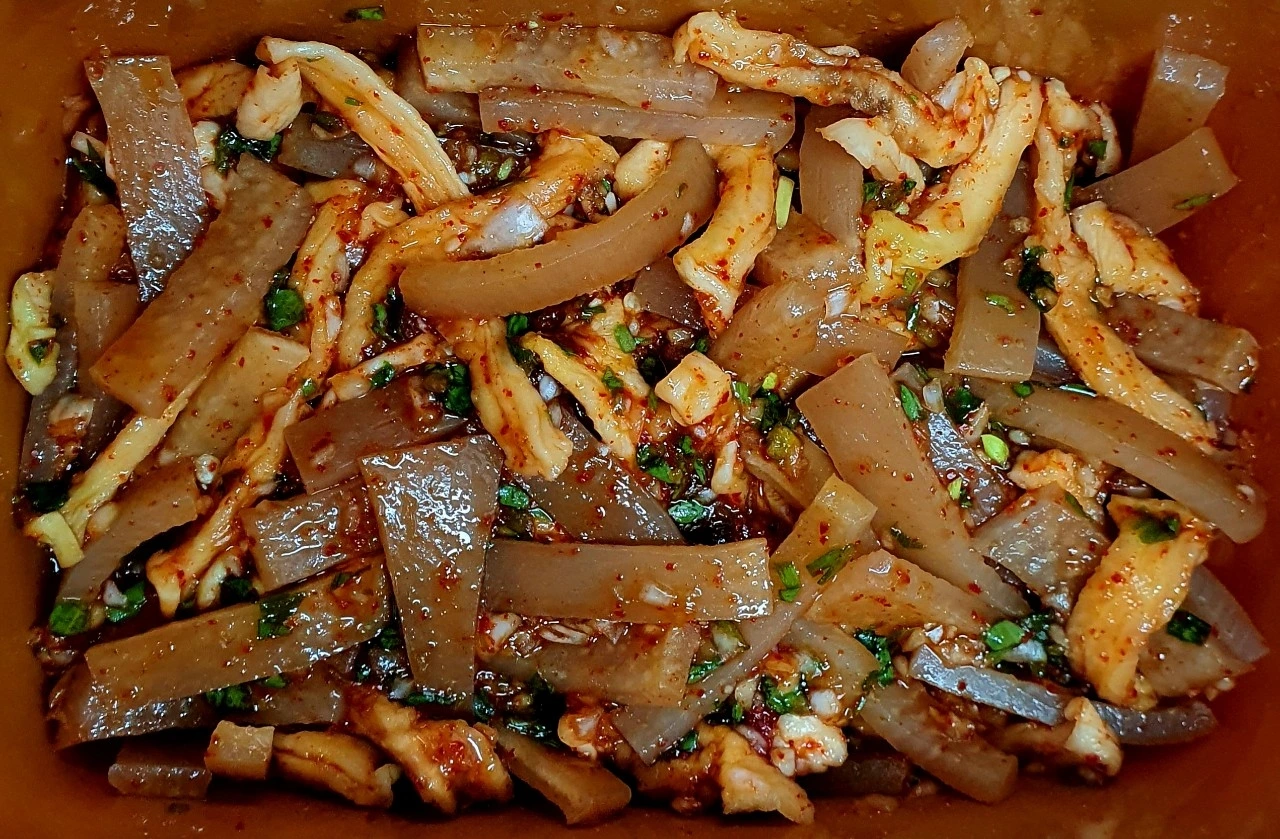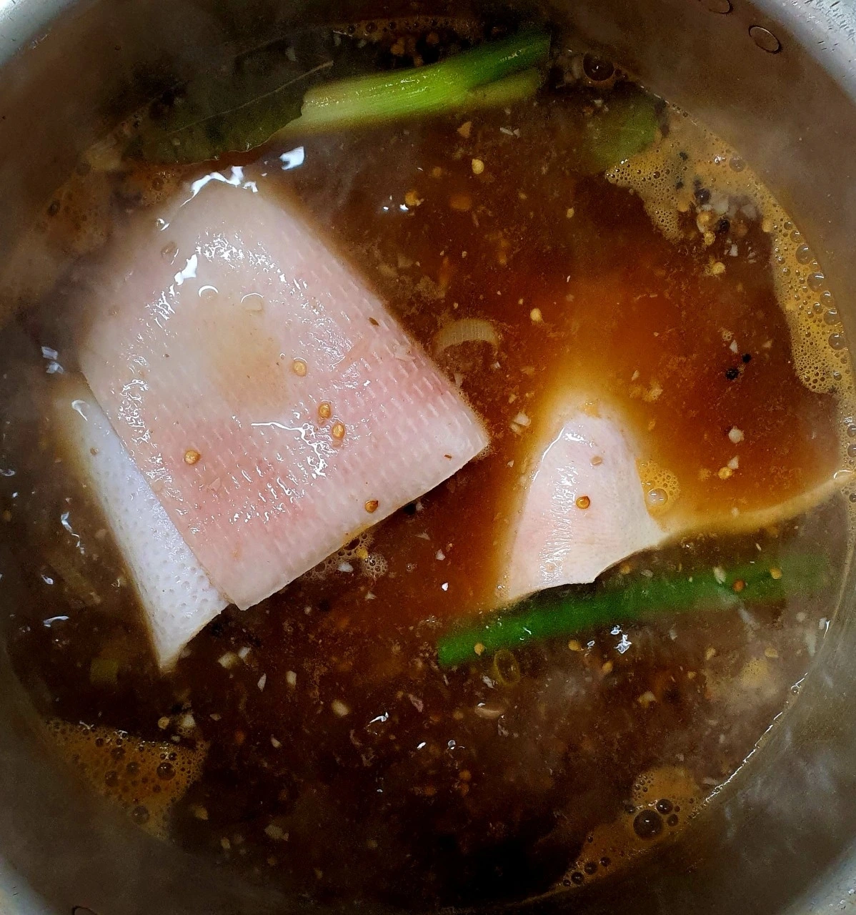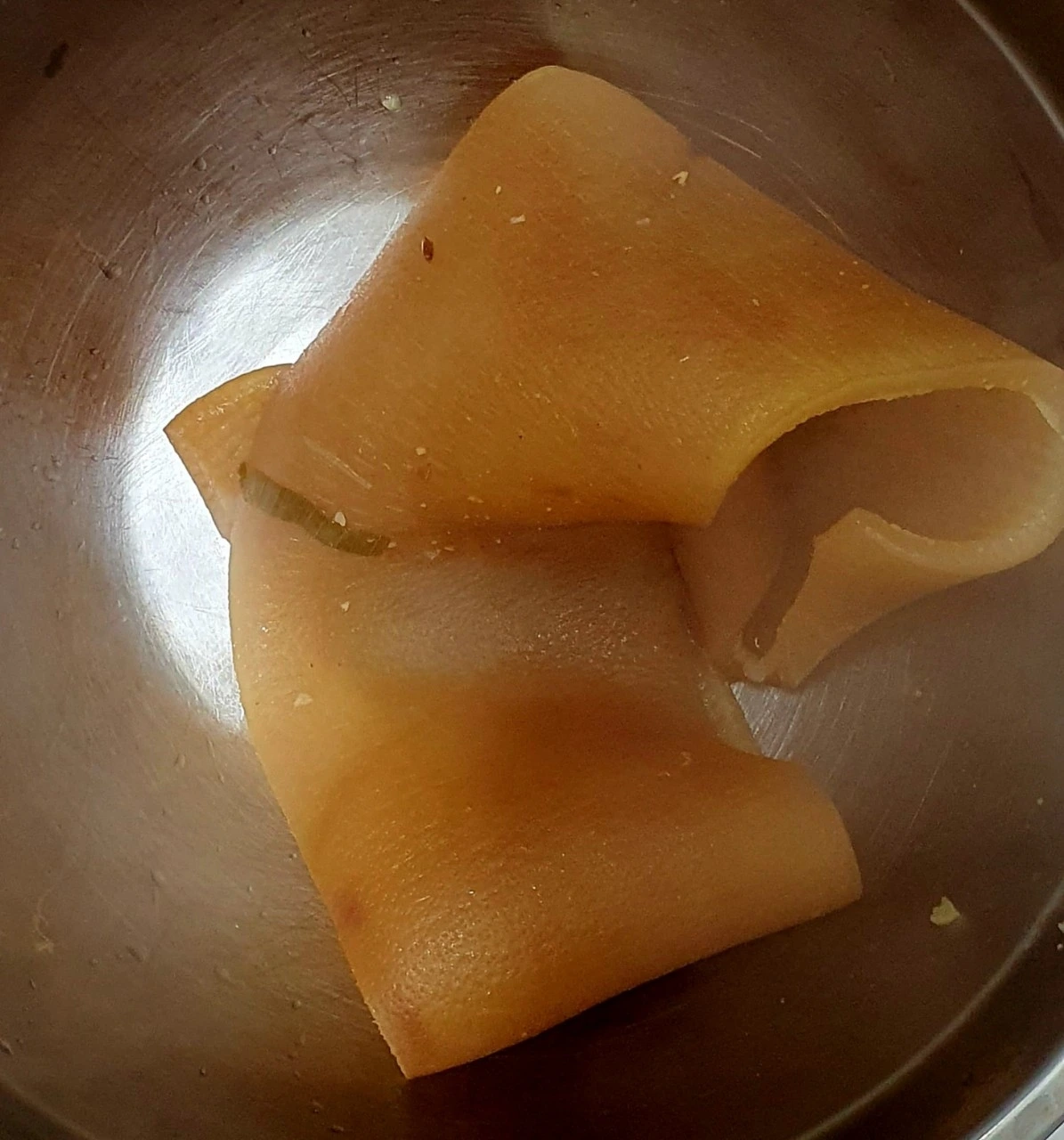 ◈ 돼지껍질 효능 : 탄수화물이 전혀 없고 쫄깃쫄깃한 콜라겐 덩어리인 돼지껍질은 다이어트와 피부미용에 효과적이다. 무는 비타민C. K, 칼슘, 칼륨 등 다양한 영양소를 함유하고 있어 면역력 강화와 혈압조절에 도움이 되며 식이섬유가 풍부하게 포함되어 있어 소화와 변비 예방에 도움이 된다.