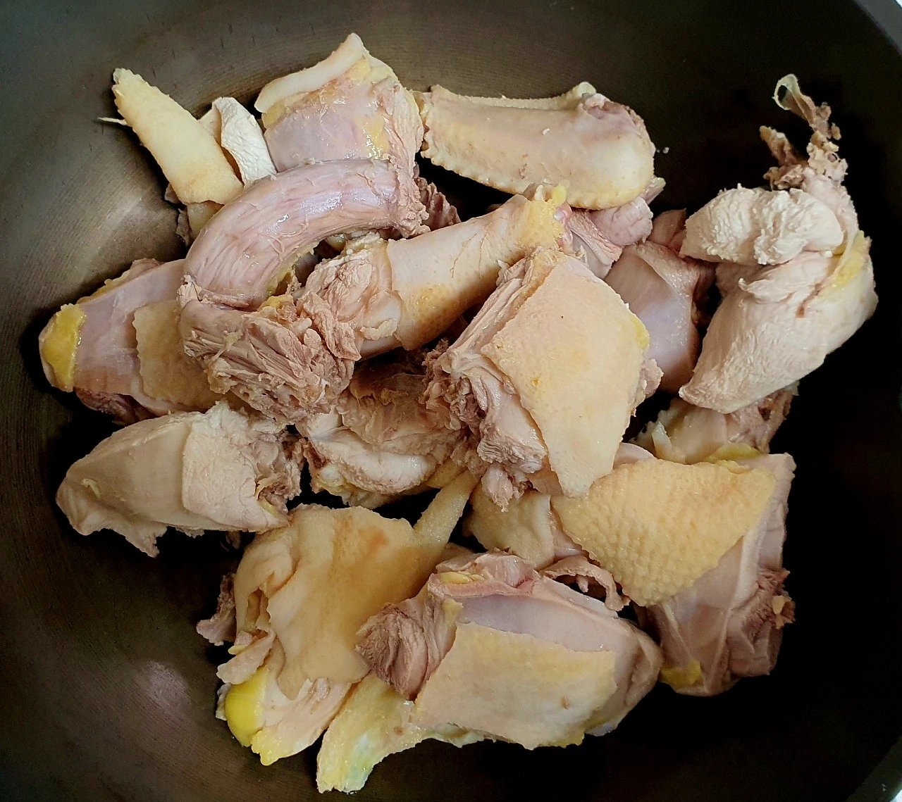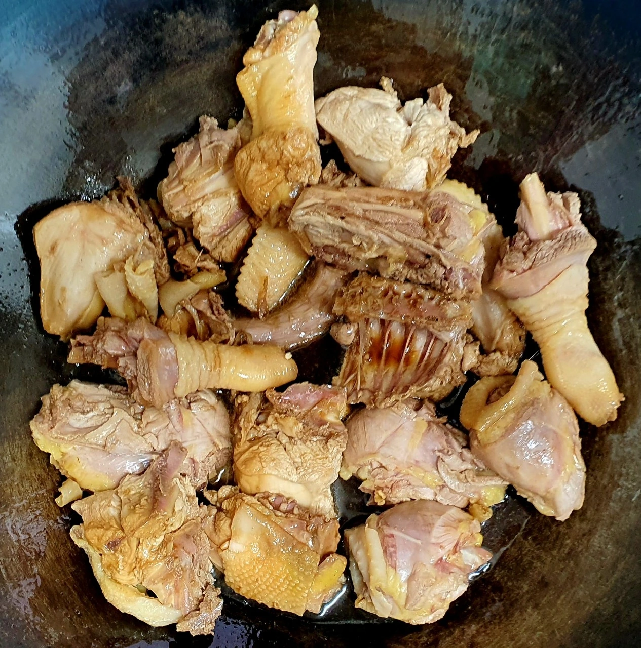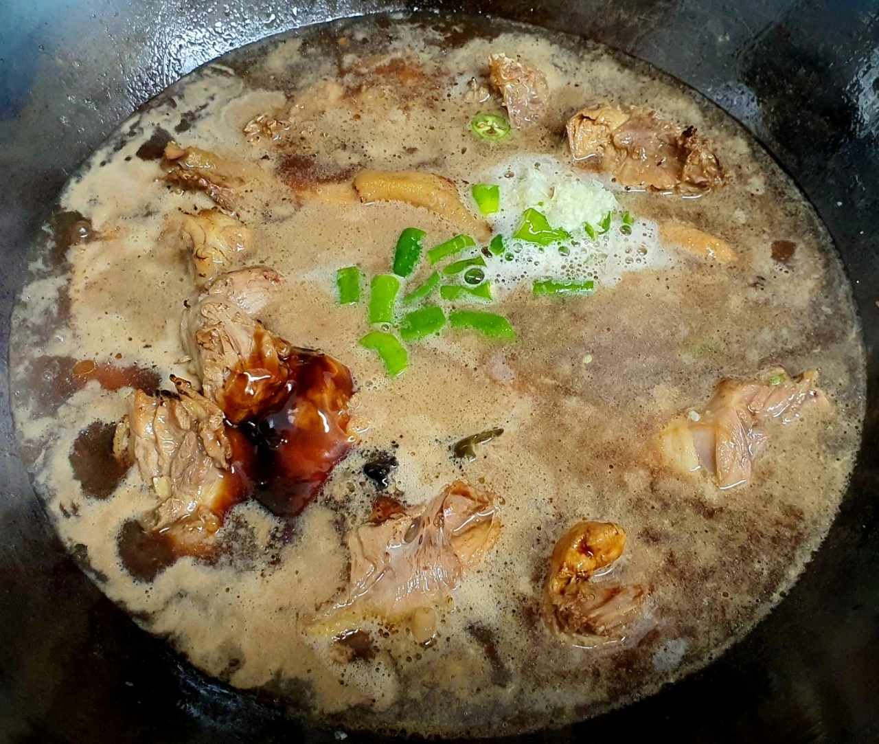 ① 웍에 압력솥에서 꺼낸 닭을 넣고 양념장과 육수 3컵을 넣고 노계 이므로 충분히 끓여 준다.
