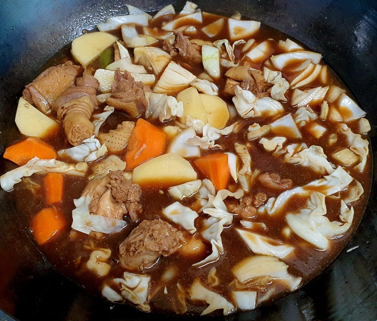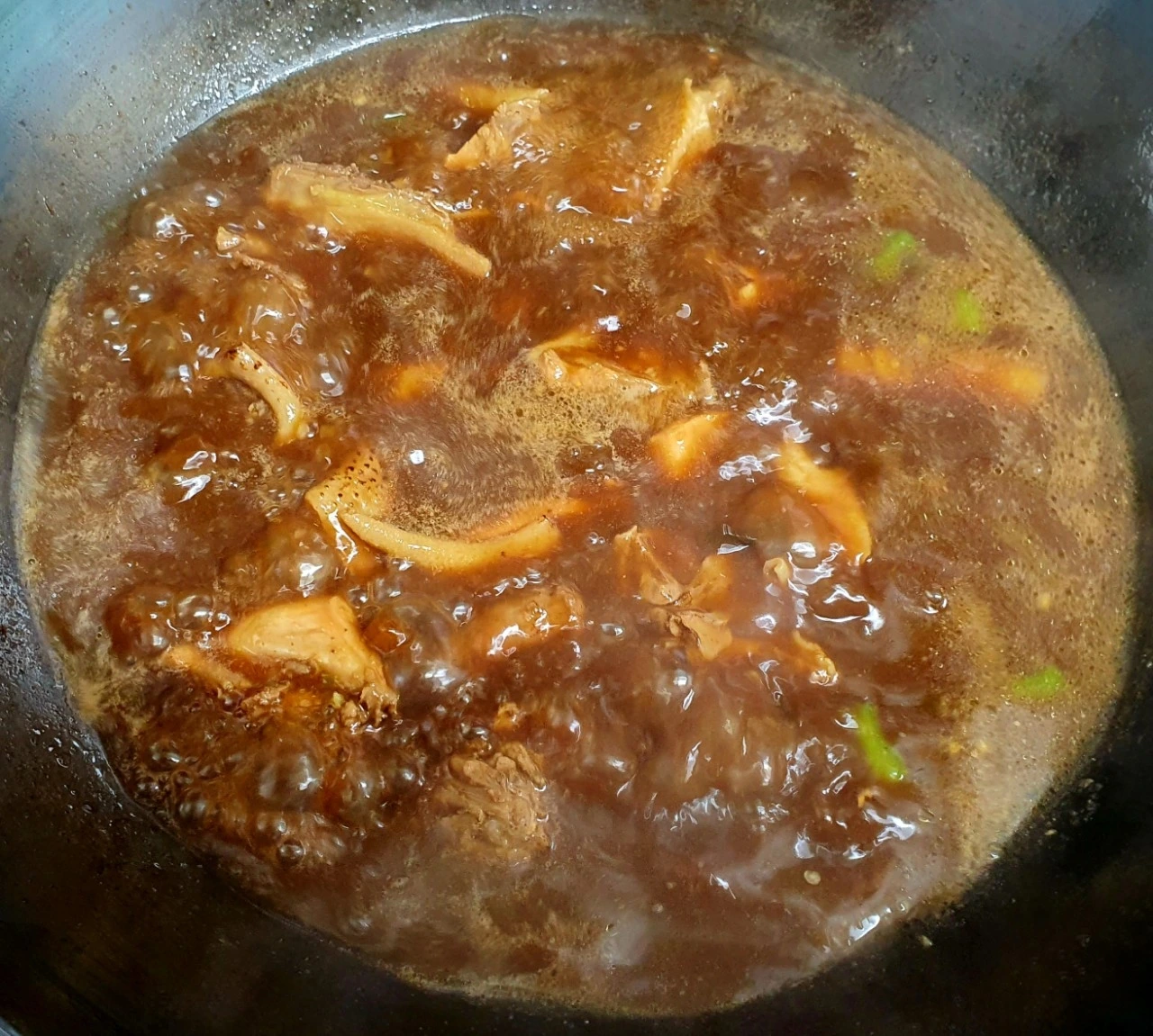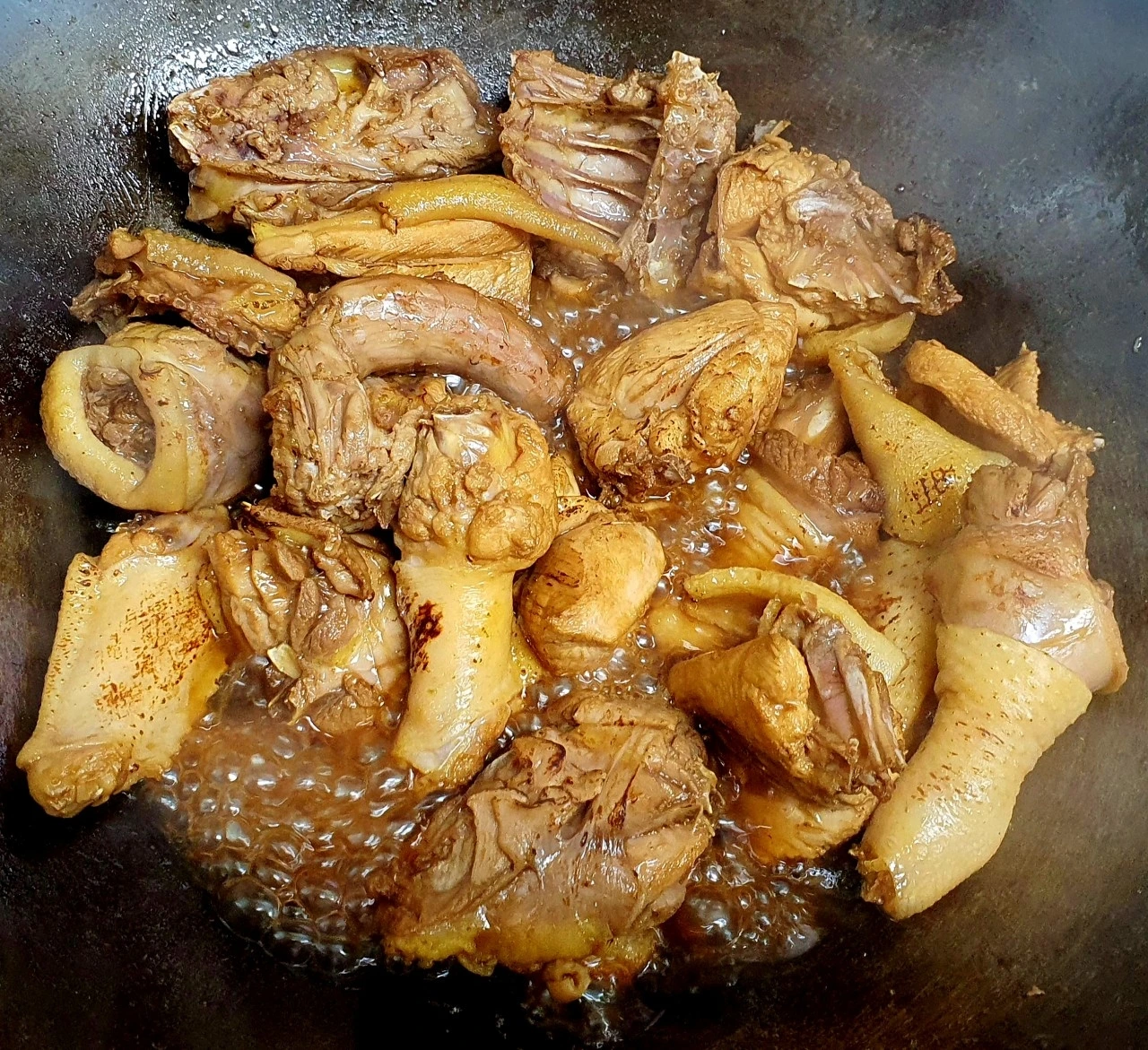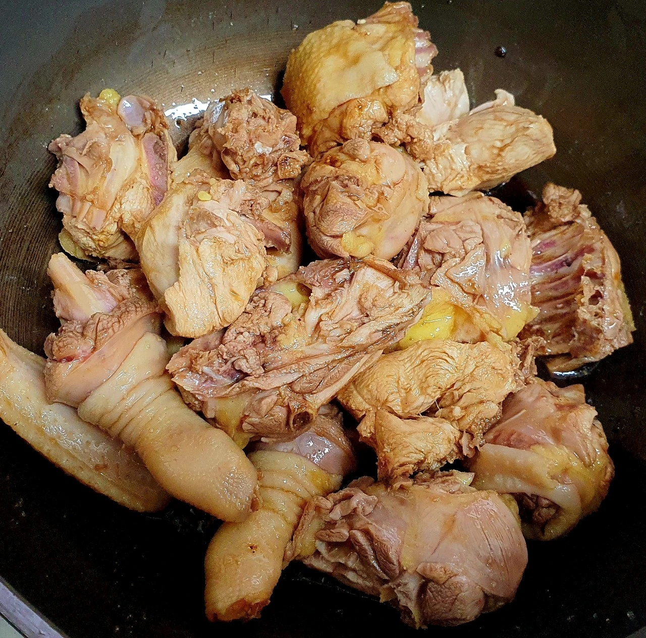 ① 웍에 압력솥에서 꺼낸 닭을 넣고 양념장과 육수 3컵을 넣고 노계 이므로 충분히 끓여 준다.