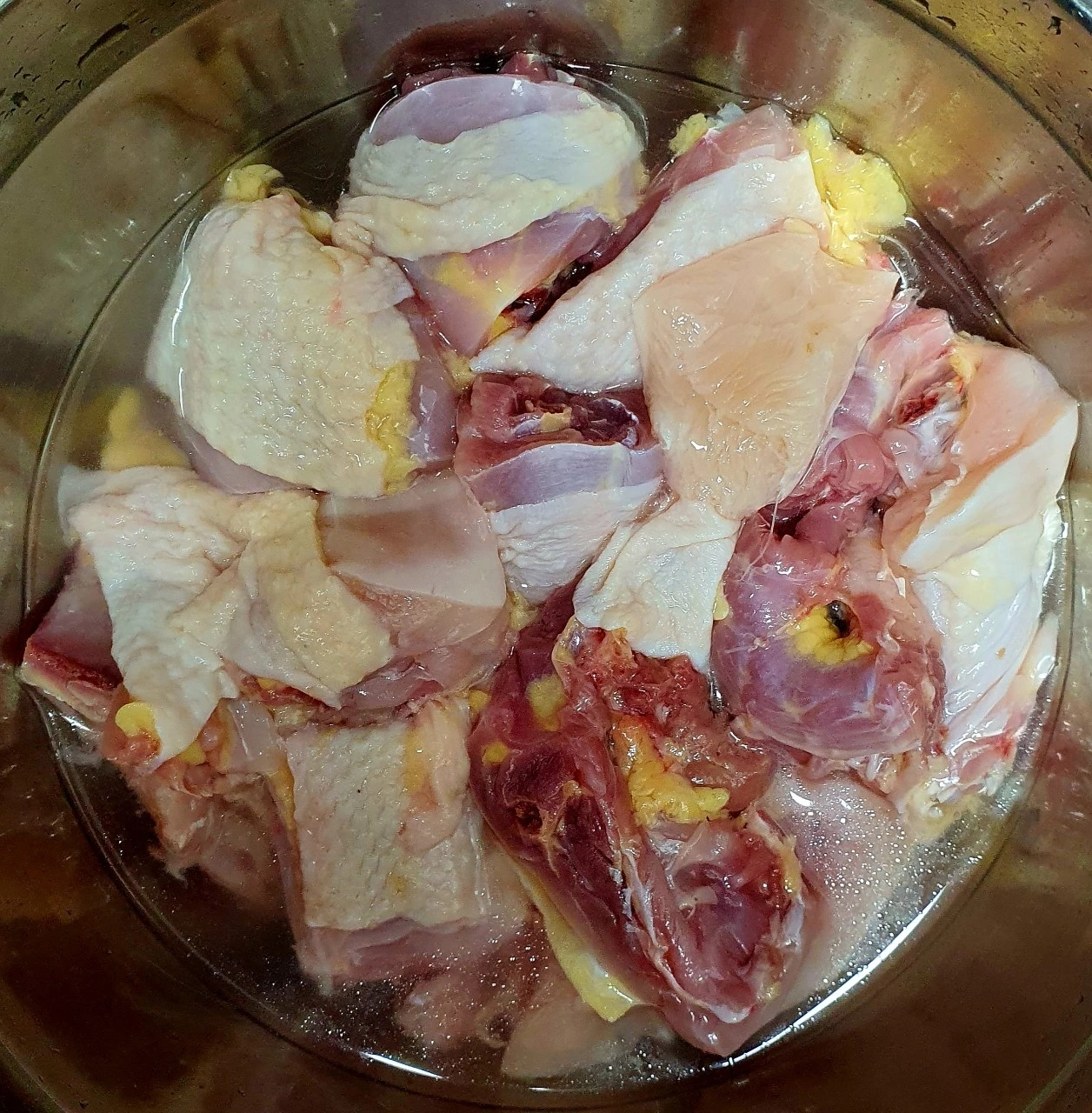 ❶ 닭의 내장과 꽁무니 쪽과 엉덩이 쪽 지방이 모인 것 , 목의 기름기를 제거한다. 닭볶음탕 할 때 토막 내는 닭의 크기와 다르게 얇고 길게 자른다. 찜닭용은 바로 조리는 거라서 살이 많은 부분은 간이 잘 배도록 길고 얇게 자른다.