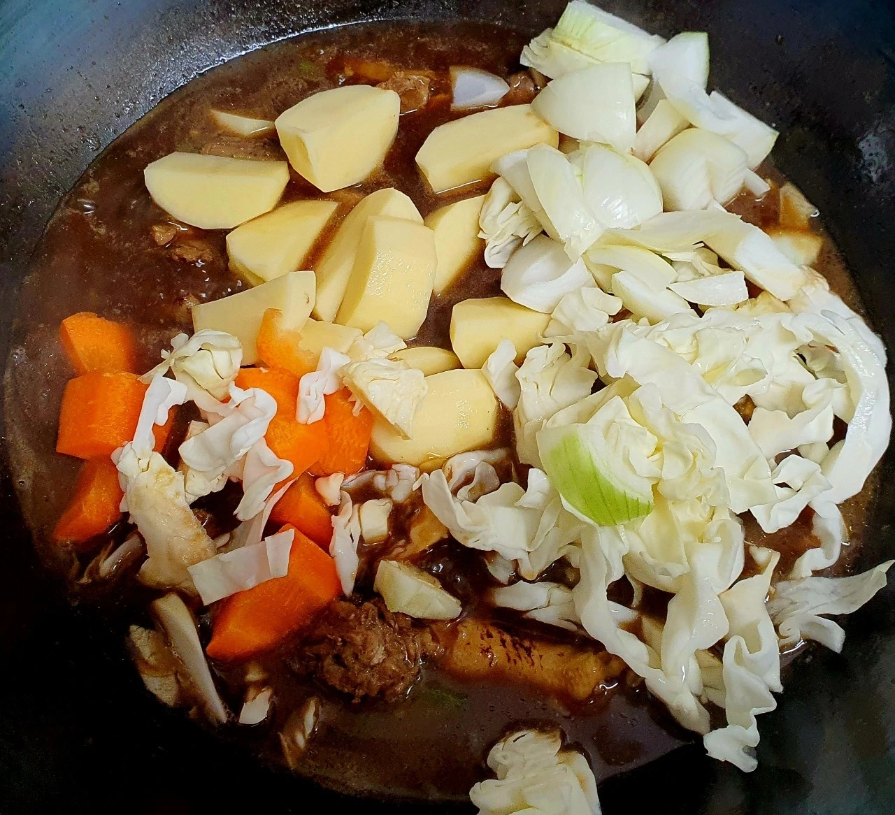 ② 고기가 충분히 익으면 감자와 당근을 넣고 뚜껑을 덮어서 10분간 끓여 줍니다.