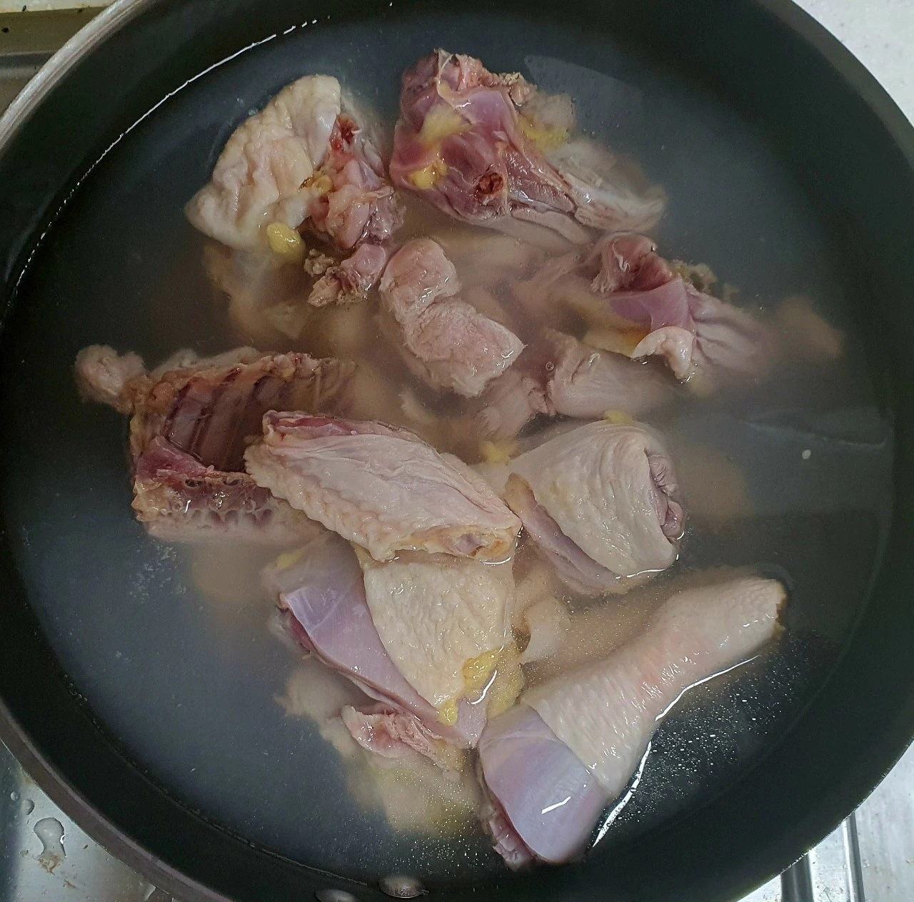 ❷ 준비한 닭을 끓는 물에 데쳐서 기름기를 어느 정도 제거한 다음 간장과 원당, 커피로 주물러 밑간을 해서 30분 정도 둔다.