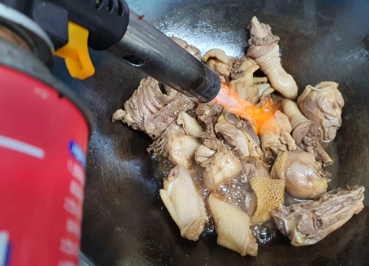 ❸ 달궈진 팬에 식용유를 살짝 두르고 닭고기를 노릇하게 구워내며 위에서는 토치로도 구워주며 불냄새를 내준 다음 압력솥에 넣고 수증기 빠지기 시작하면 15분 있다가 요리 진행을 하지 않으면 노계는 이도 안 들어감.