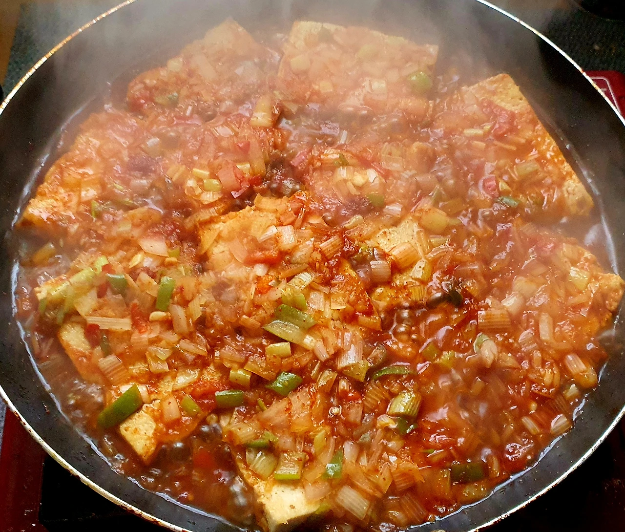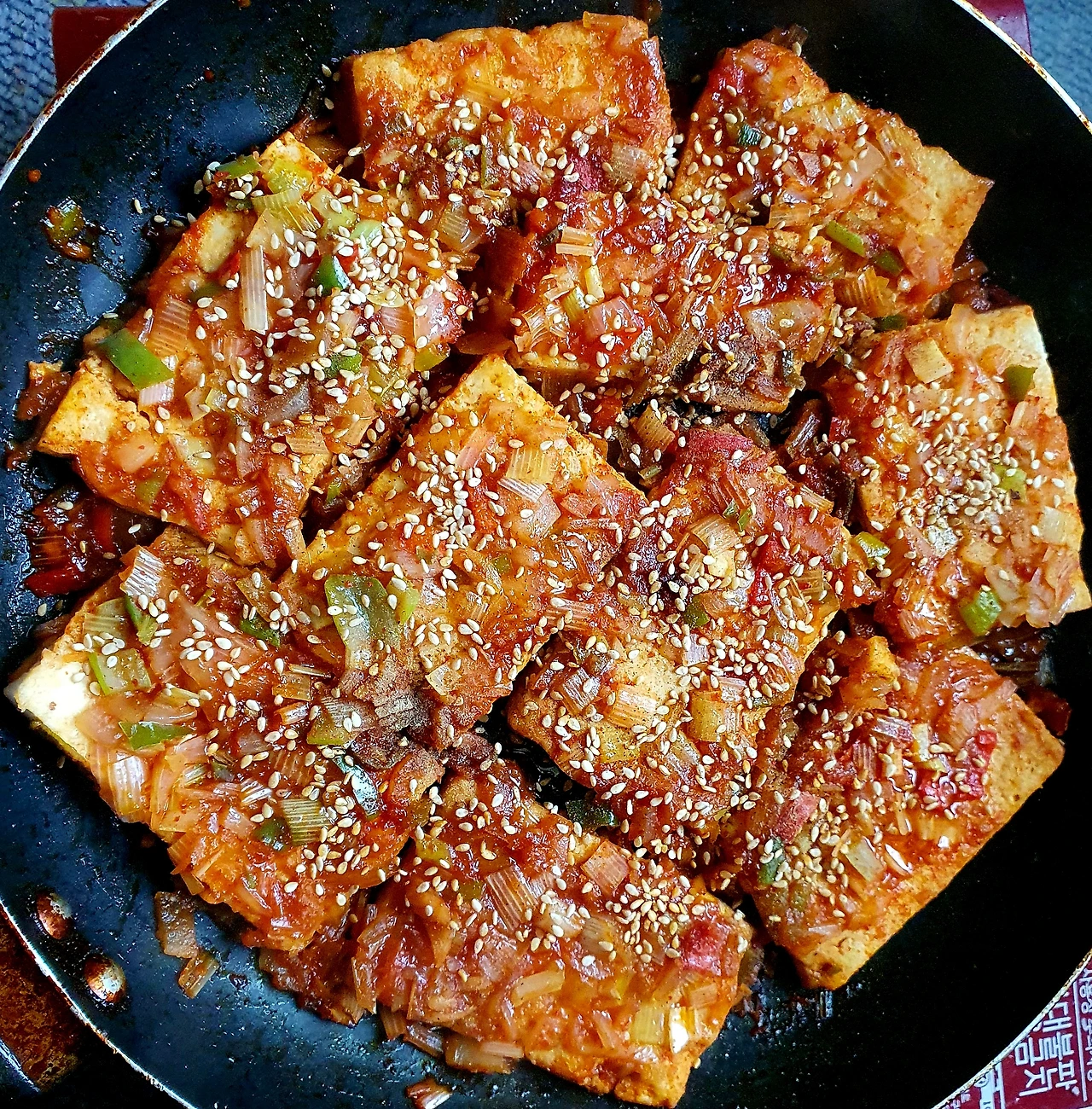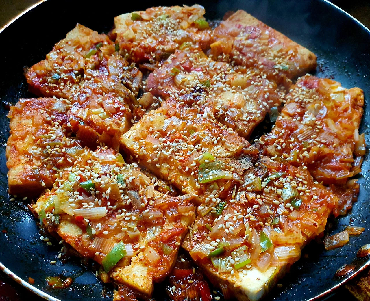 • 양념물이 거의 없어지면 불을 끄고 참기름. 후추. 통깨를 두부 위에 뿌려 주면 완성.
