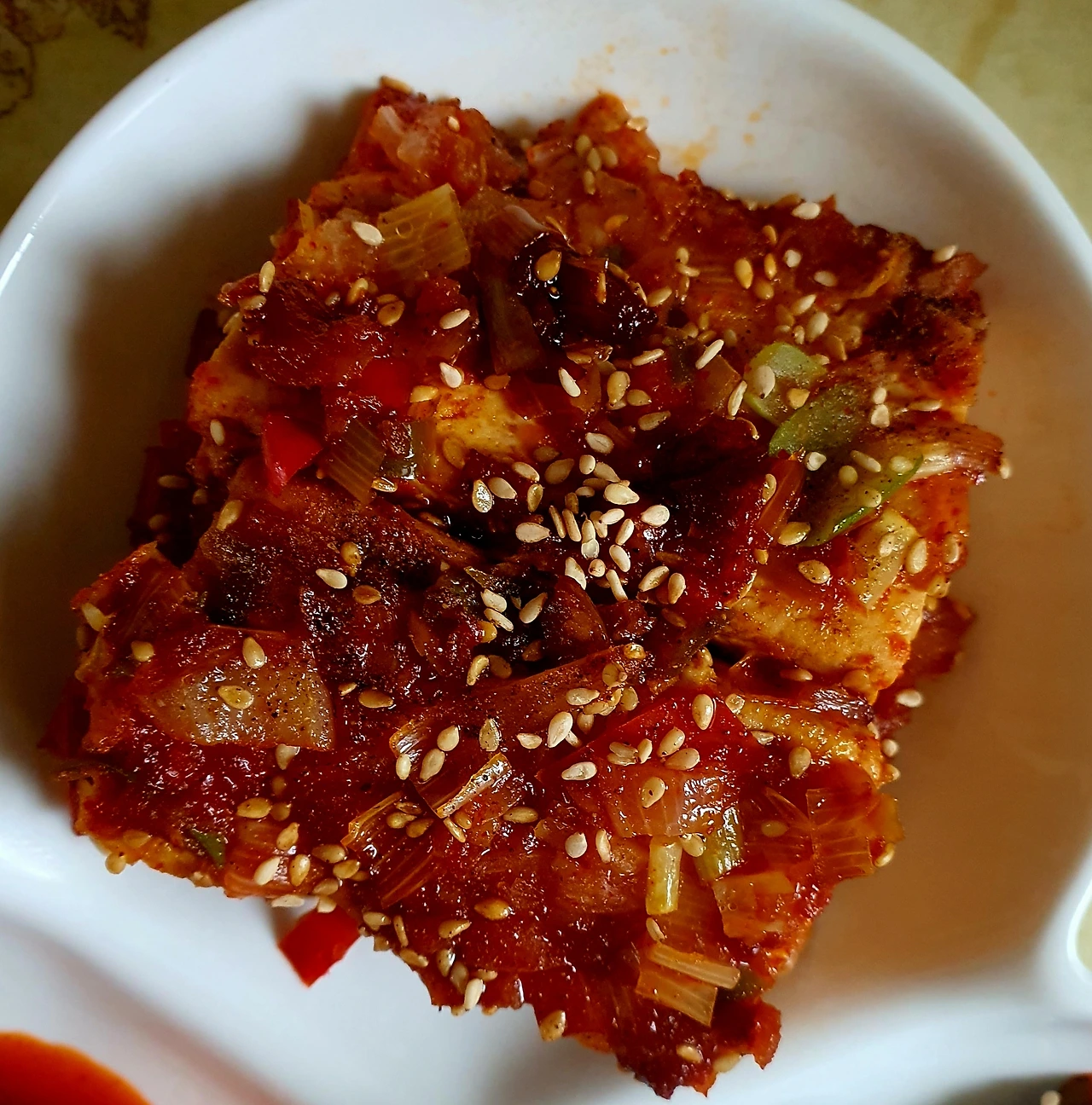 • 두부 수분을 빼는 동안 다진 마늘. 양파. 대파. 청양고추와 간장. 굴소스. 참치액. 맛술. 고춧가루. 생강청. 물엿. 육수(없으면 물)를 섞어 양념장을 만들어 준다.