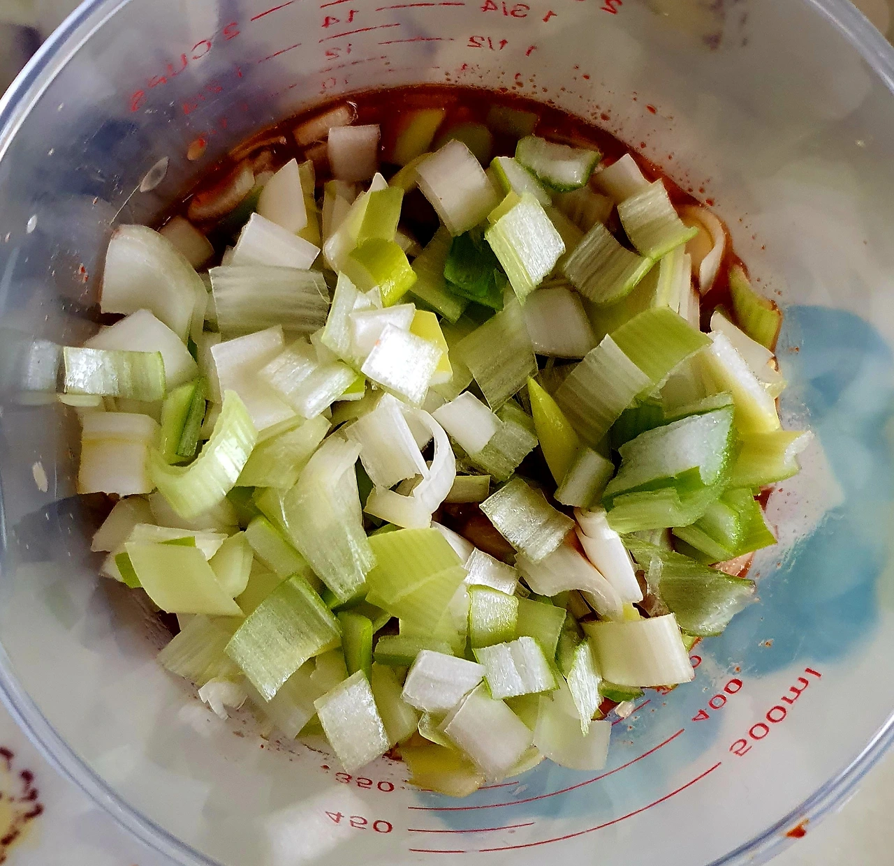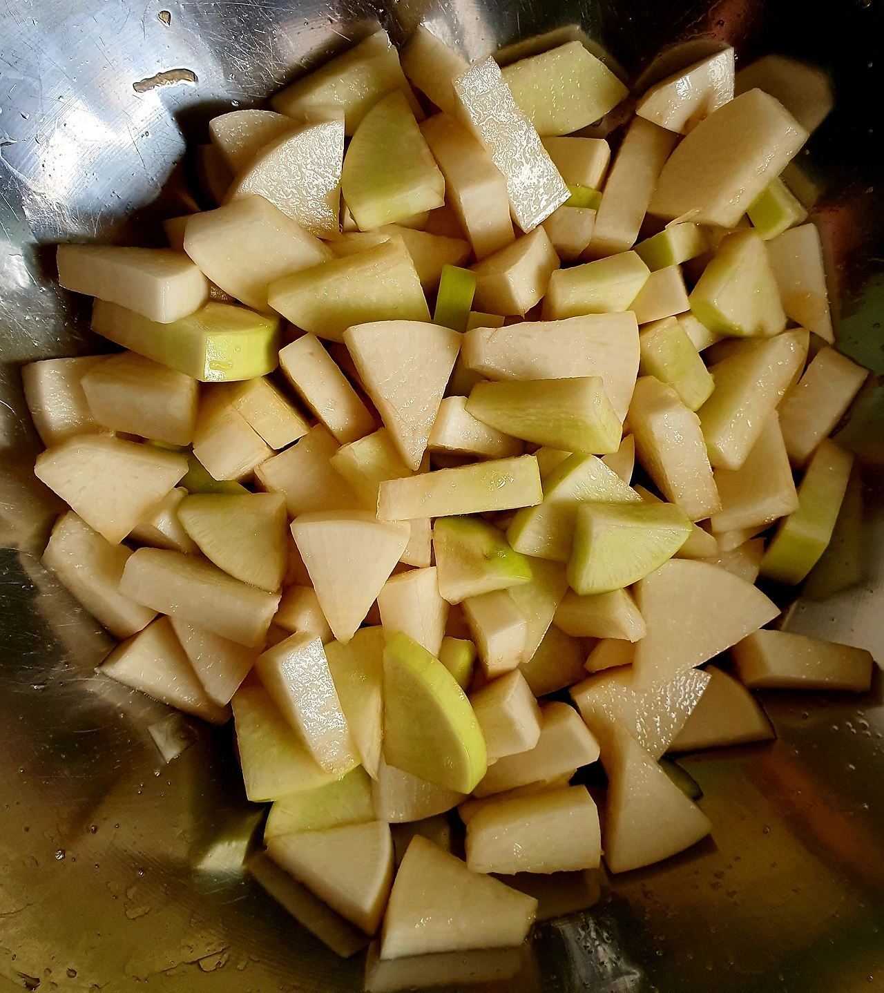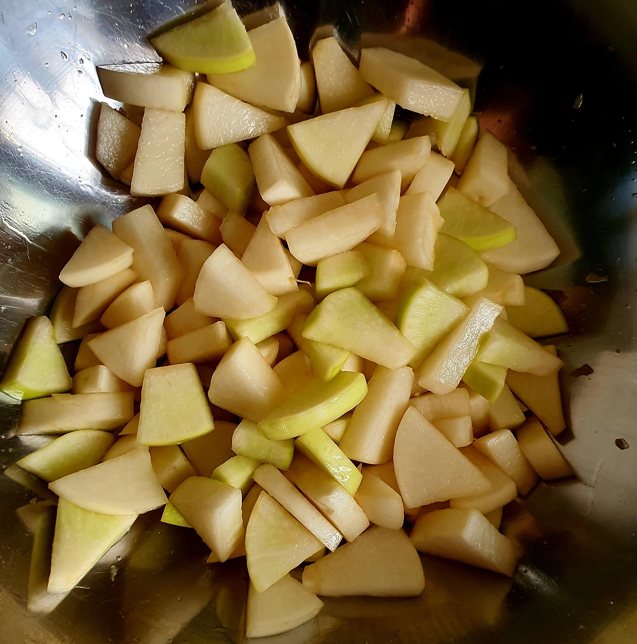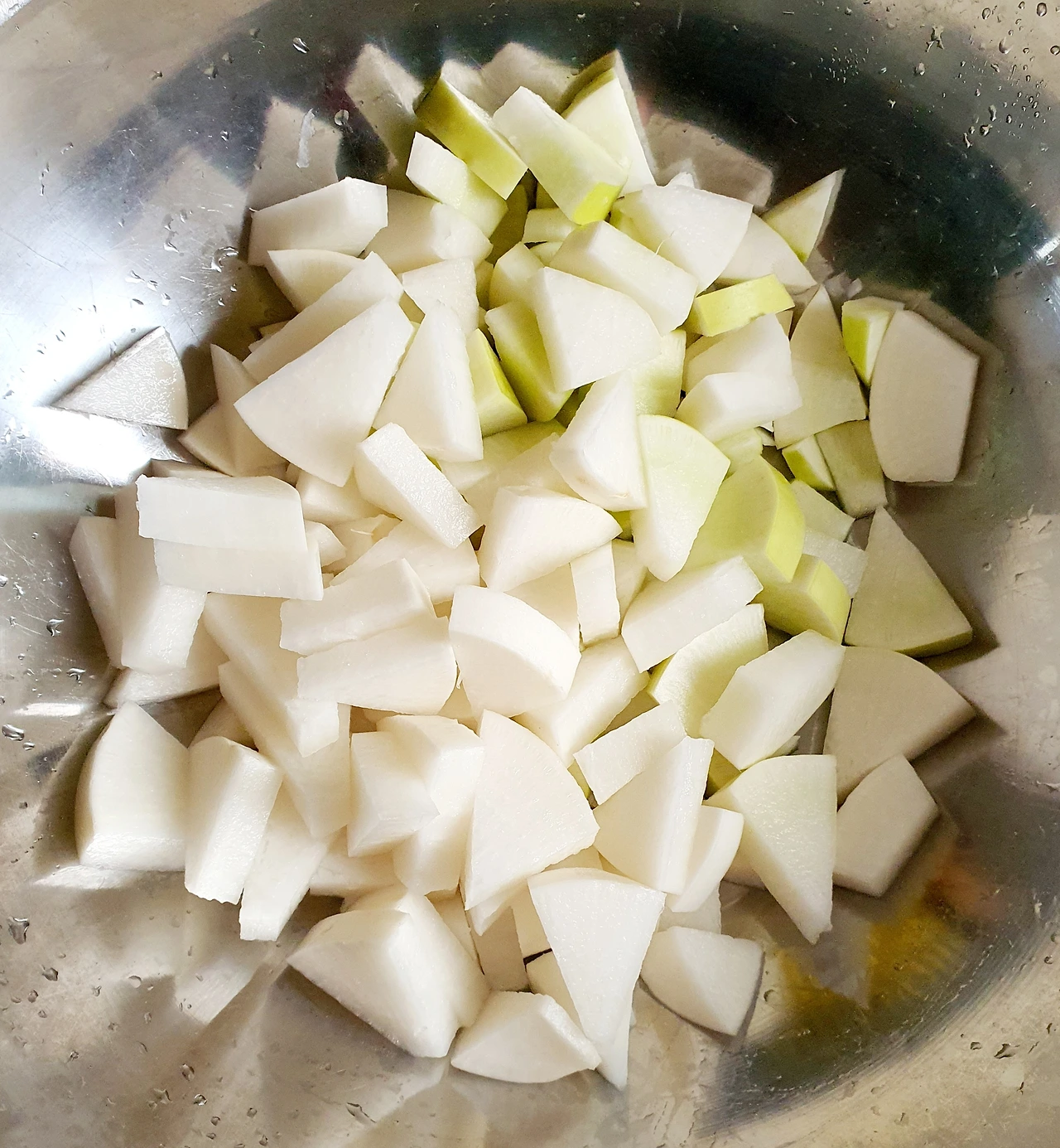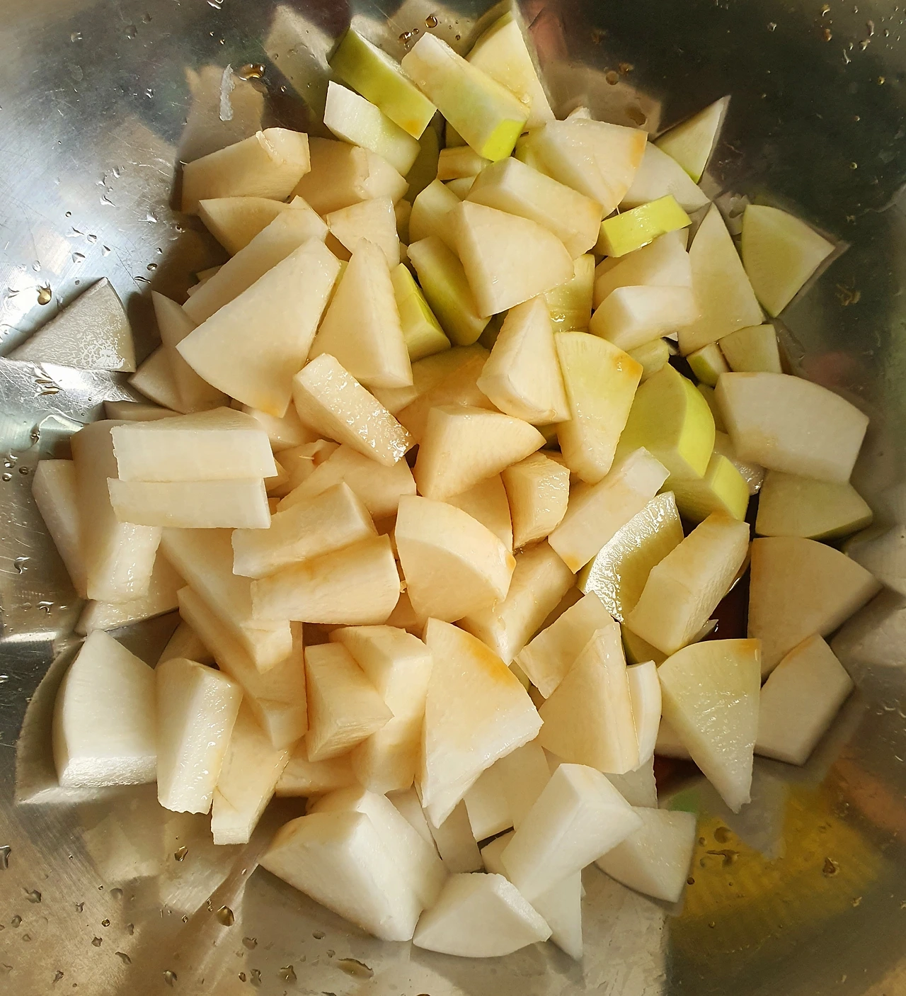• 무에서 빠진 물은 별도로 따라 양념장을 만드는 곳에 넣어두고 무는 그대로 커다란 볼에 둔다.