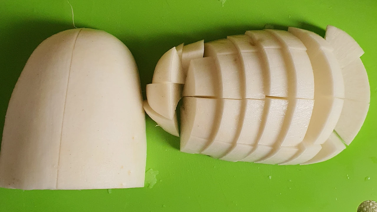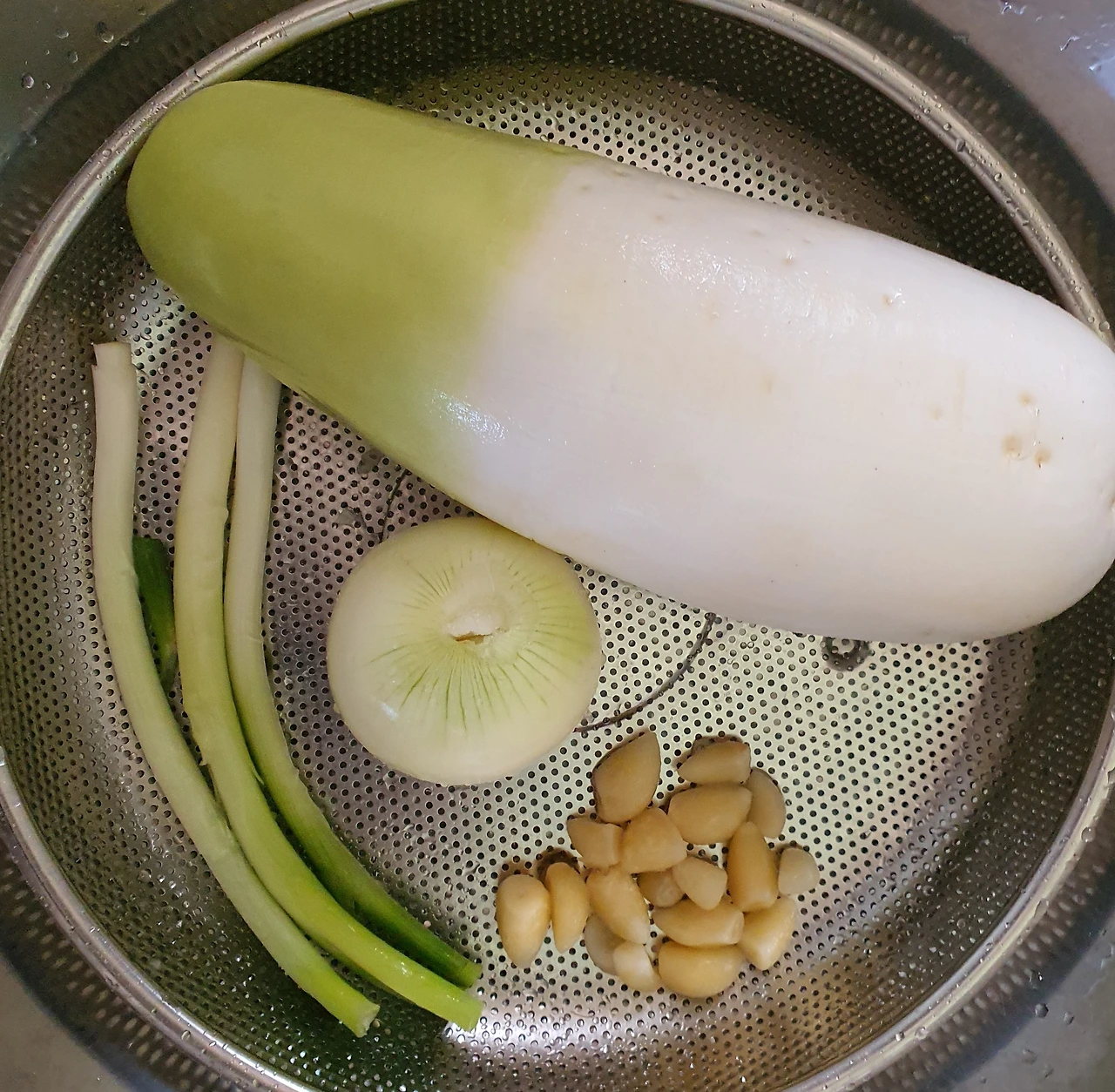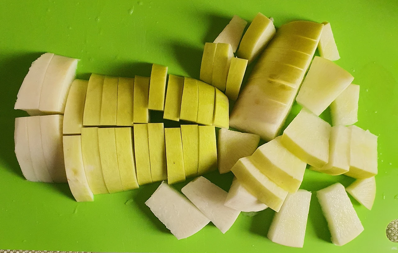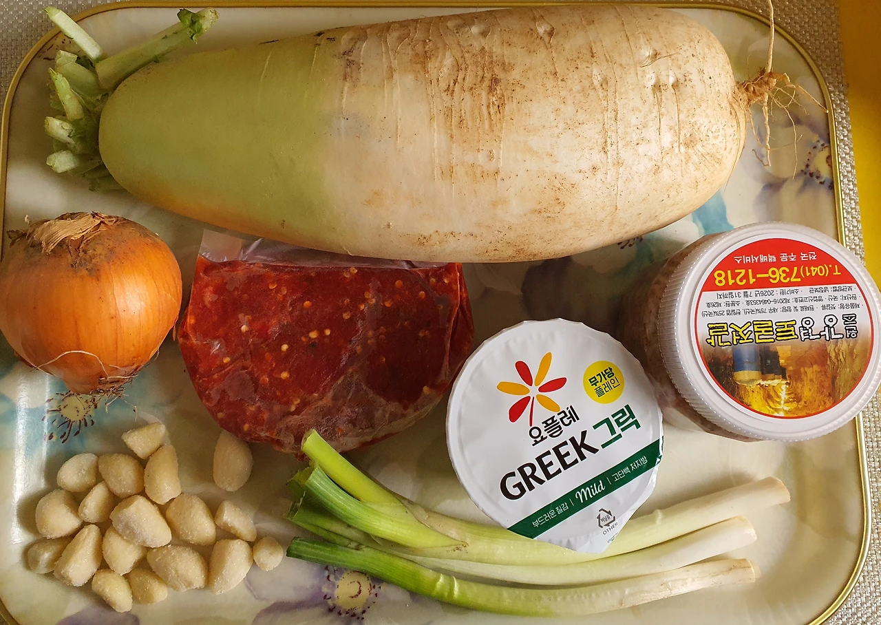 • 무. 양파. 대파. 마늘은 씻어 준비한다. 깨끗이 씻은 무는 납작하고 큼직하게 썰어 둔다.