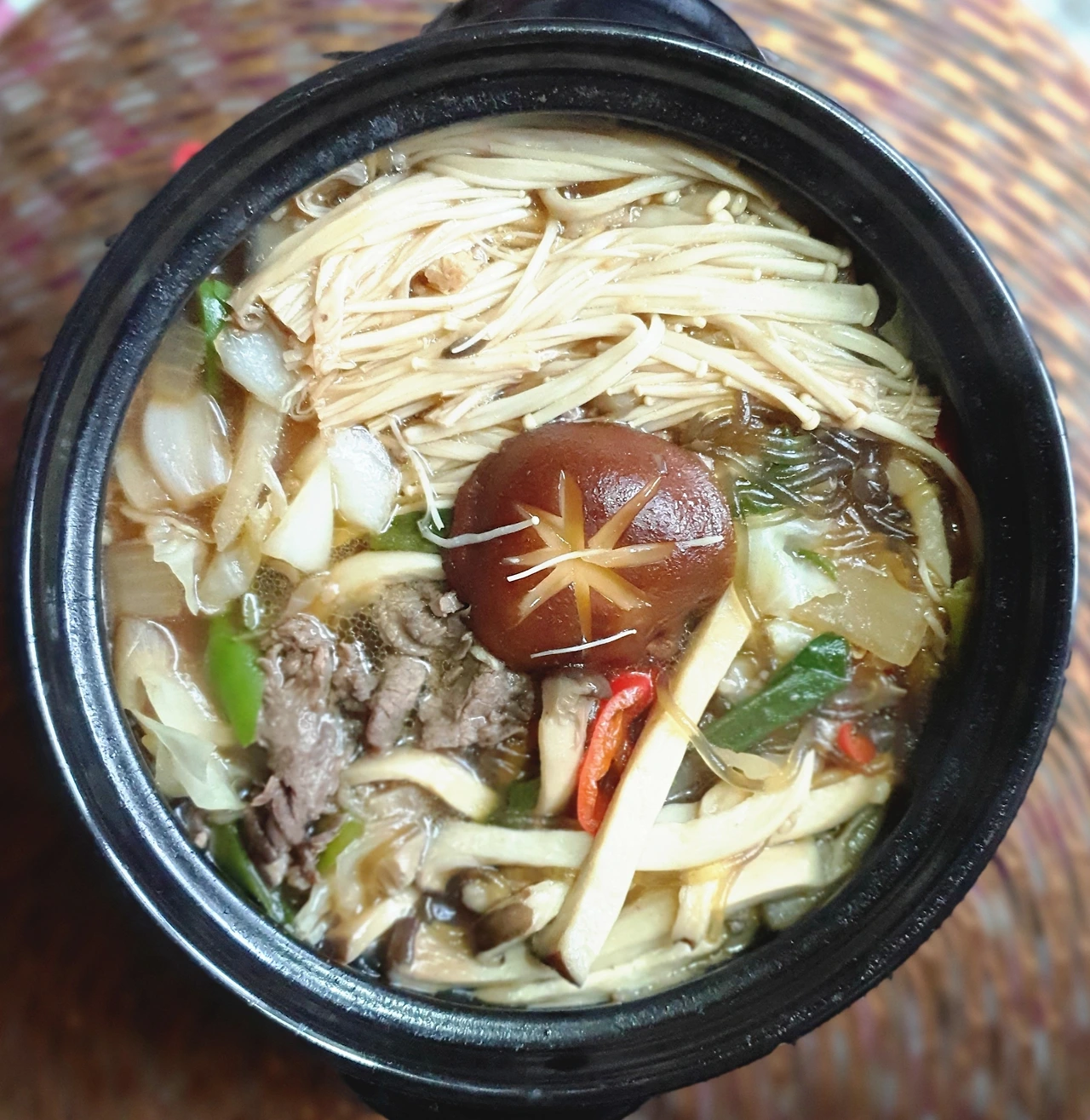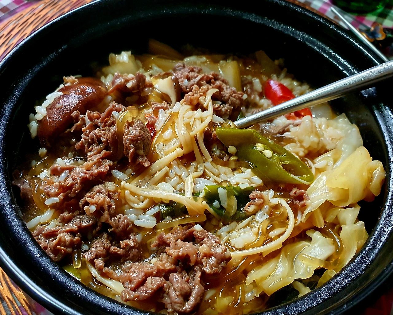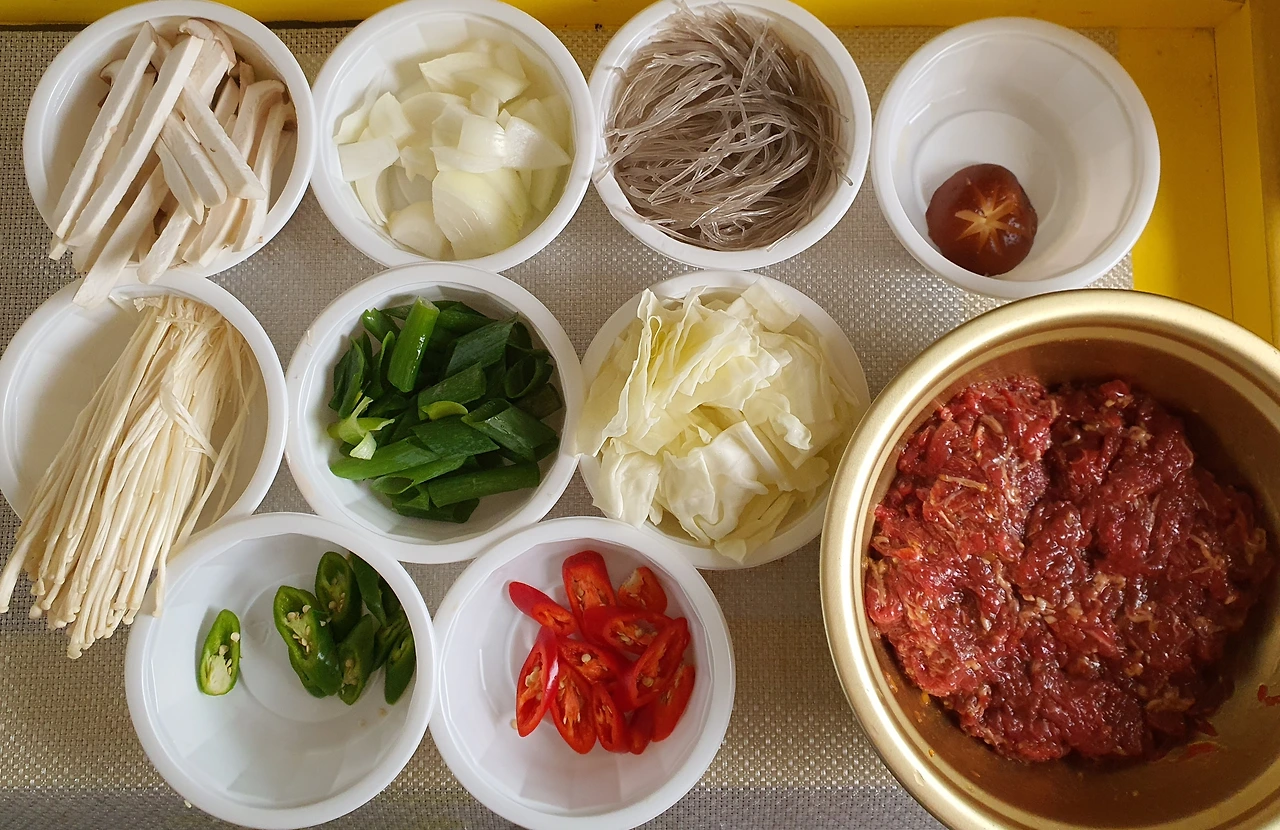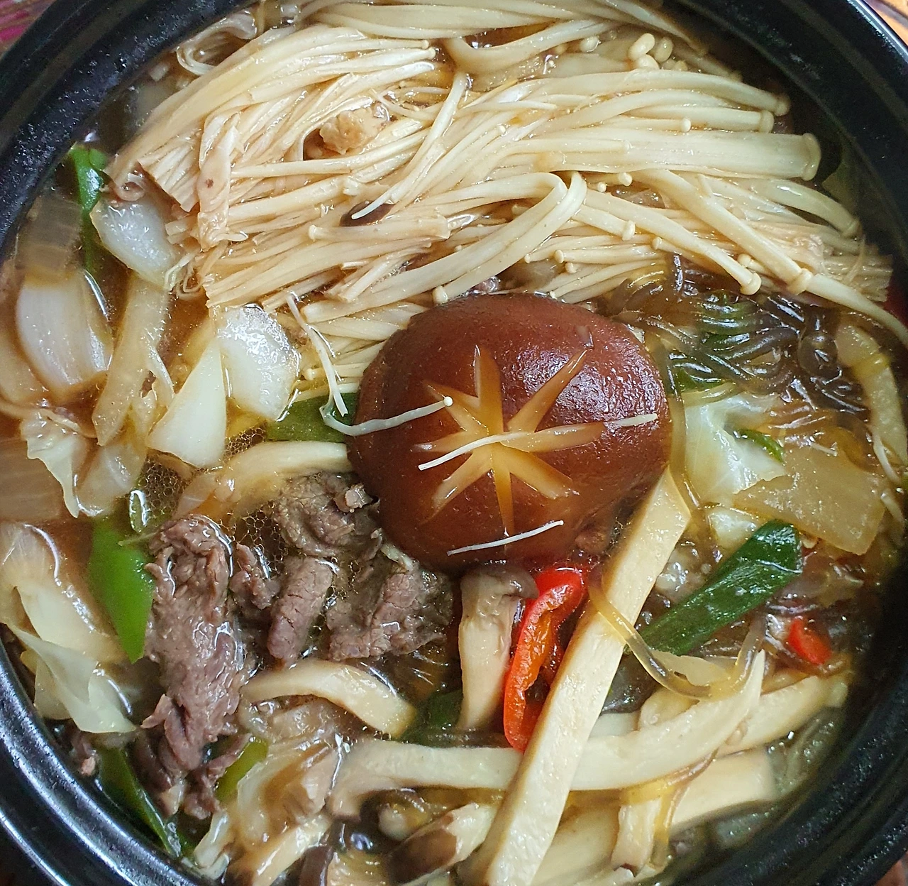 • 만들기 : 뚝배기에 양파를 넣고, 양배추. 당면. 소고기. 대파를 올리고 위에 팽이버섯과 새송이버섯. 청고추. 홍고추와 가운데 표고버섯을 올린 후에 다시마육수를 넣고 자작하게 끓인다.