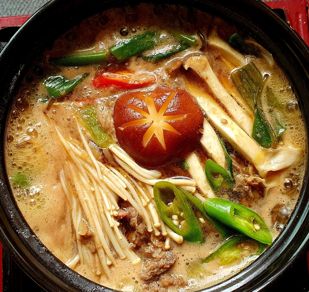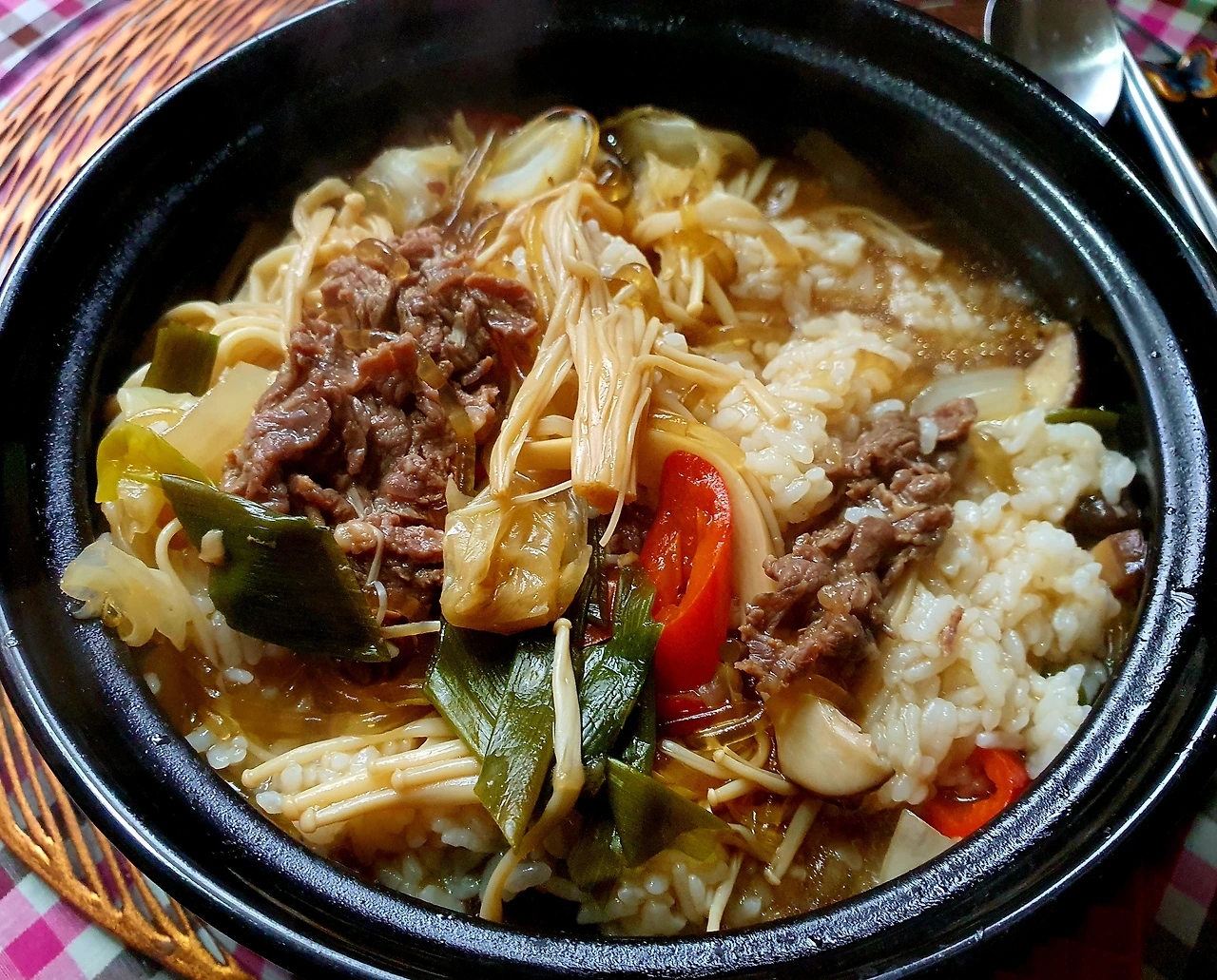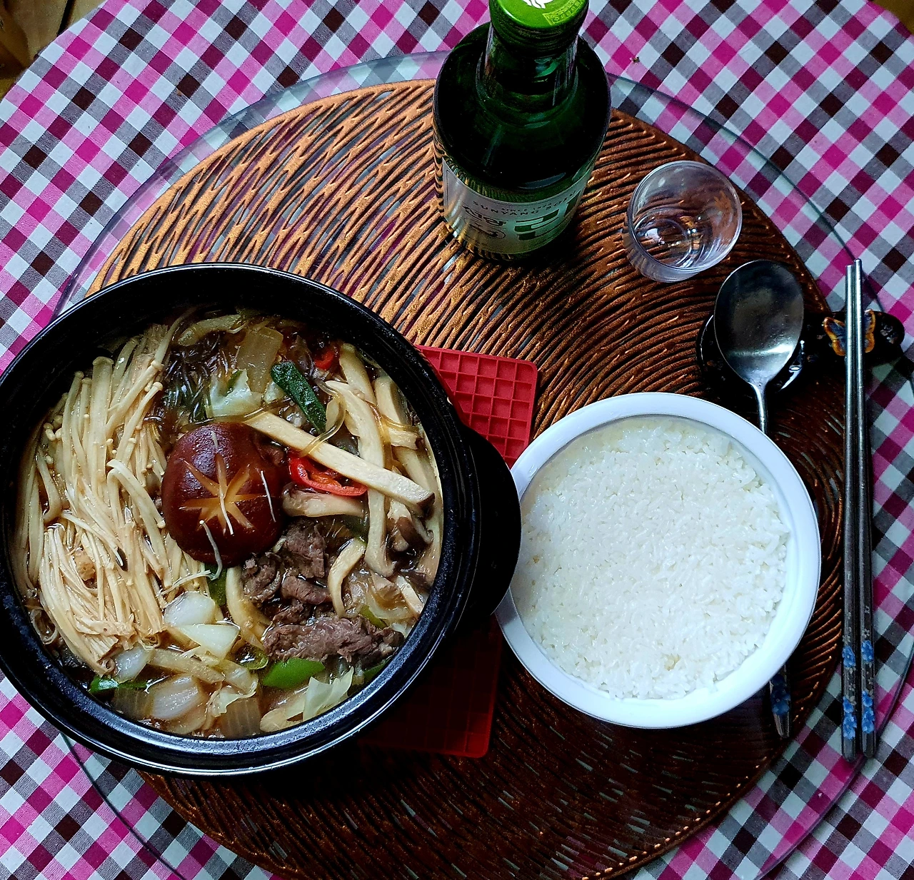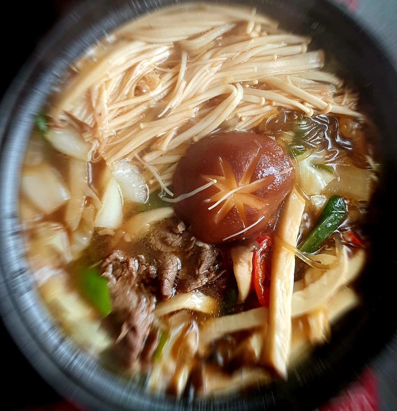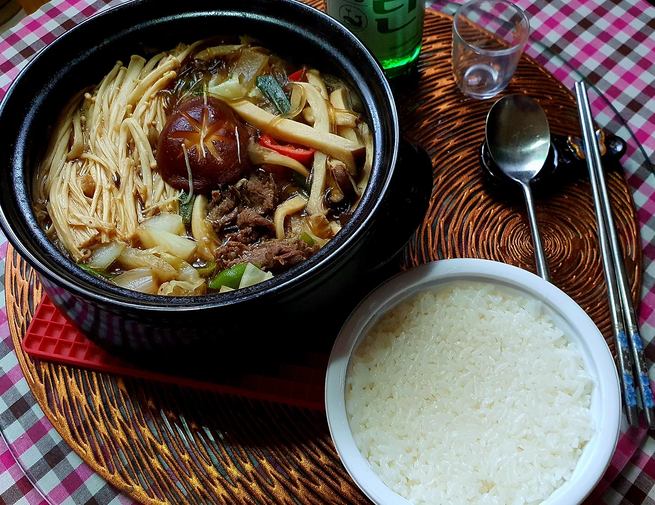 • 만들기 : 뚝배기에 양파를 넣고, 양배추. 당면. 소고기. 대파를 올리고 위에 팽이버섯과 새송이버섯. 청고추. 홍고추와 가운데 표고버섯을 올린 후에 다시마육수를 넣고 자작하게 끓인다.