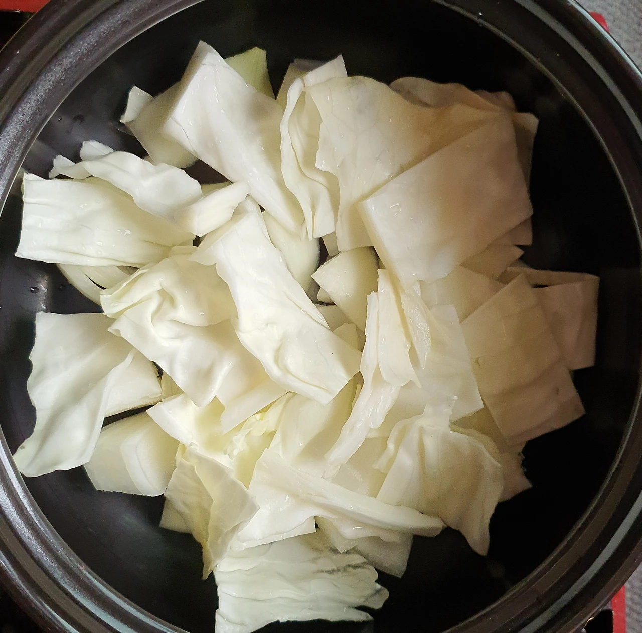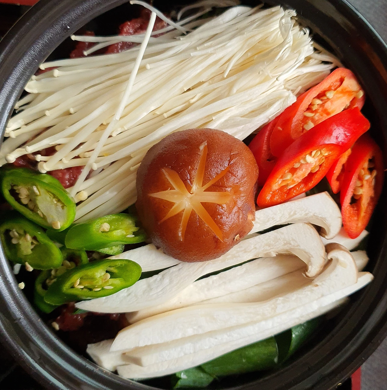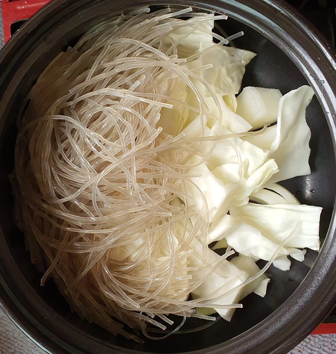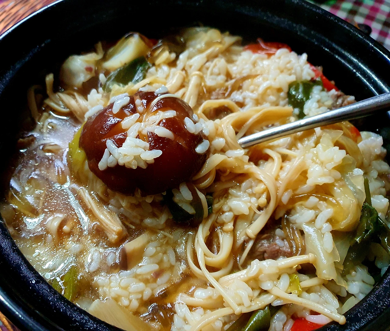 • 만들기 : 뚝배기에 양파를 넣고, 양배추. 당면. 소고기. 대파를 올리고 위에 팽이버섯과 새송이버섯. 청고추. 홍고추와 가운데 표고버섯을 올린 후에 다시마육수를 넣고 자작하게 끓인다.