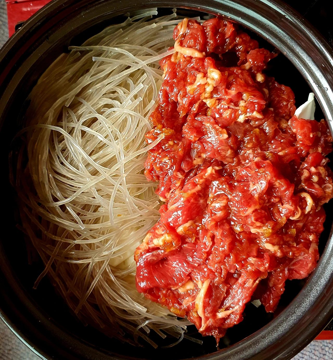 • 재료 손질 : 소고기는 키친타월로 핏물을 제거하고 먹기 좋은 크기로 썰어준다, 채소와 버섯도 먹기 좋은 크기로 썰어 준비한다. 당면은 물에 30분 이상 불려준다.