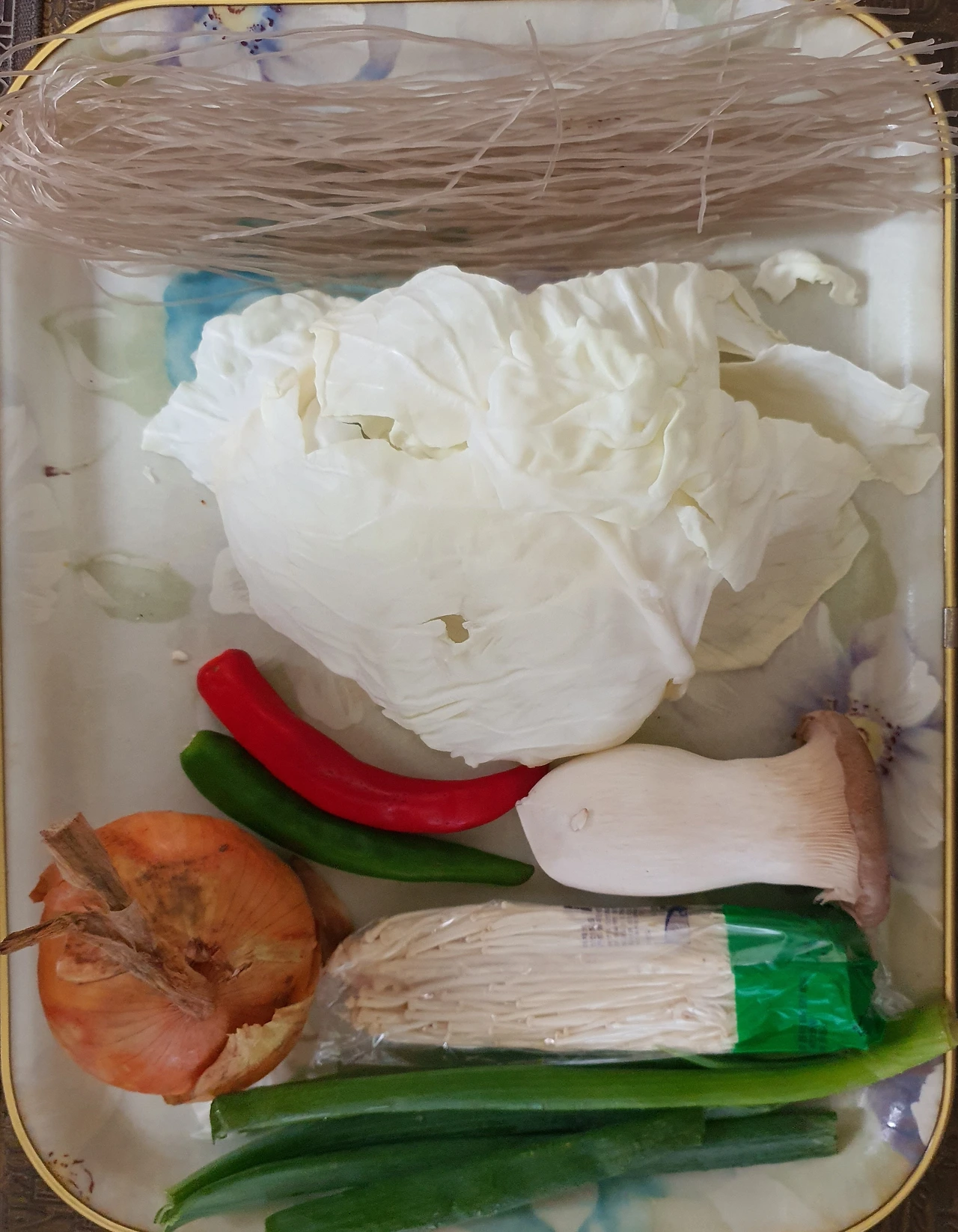 ■ 재료 : 소고기 불고기감 400g, 표고버섯 1개, 양배추 조금, 대파 ½대, 양파 ⅓개, 팽이버섯 1송이, 새송이버섯 1개. 당면 조금