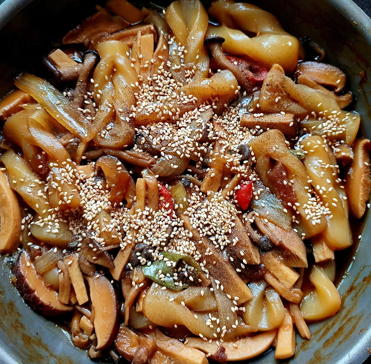 • 버섯등이 자작하게 졸여지면 불을 끄고 후춧가루. 참기름과 깨를 넣어 완성.
