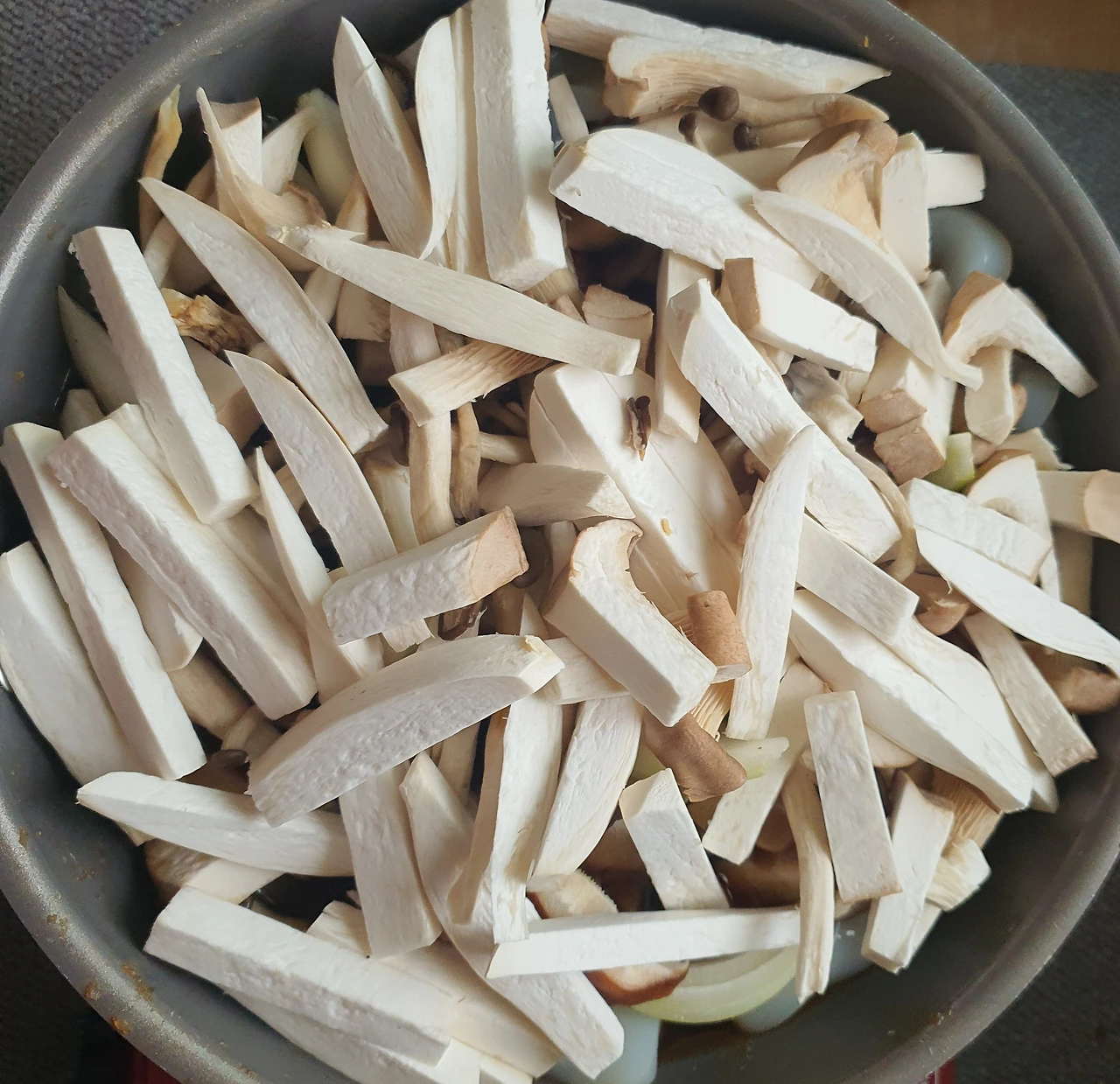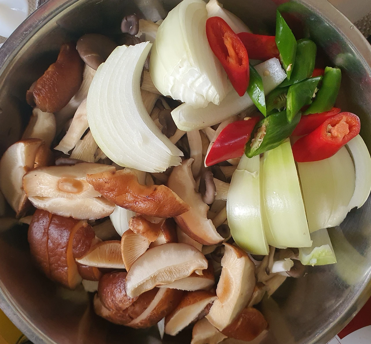 ■ 재료 : 새송이버섯 3개. 건표고버섯 8개. 느타리버섯 3송이. 곤약 1봉. 청양고추 3개. 양파 ½개. 무말랭이 조금 (건표고버섯. 무말랭이는 육수 낼 때 넣고 꺼내 조렸음)