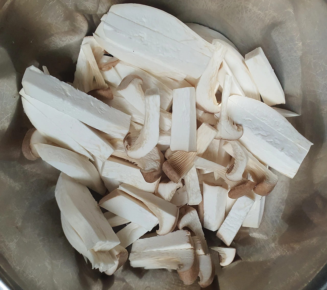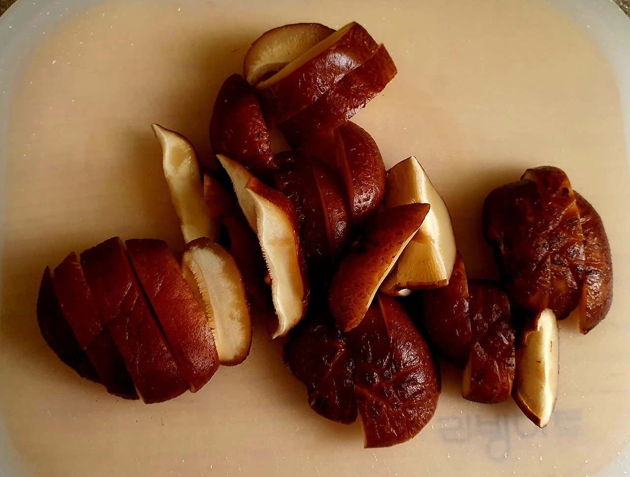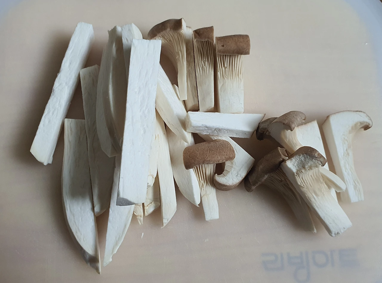 • 새송이버섯은 키친타월로 불순물을 씻어 먹기 좋은 크기로 썰기 하고, 건표고는 다시마물을 만들 때 통으로 불려 준비한 다음 3 등분해 준다.