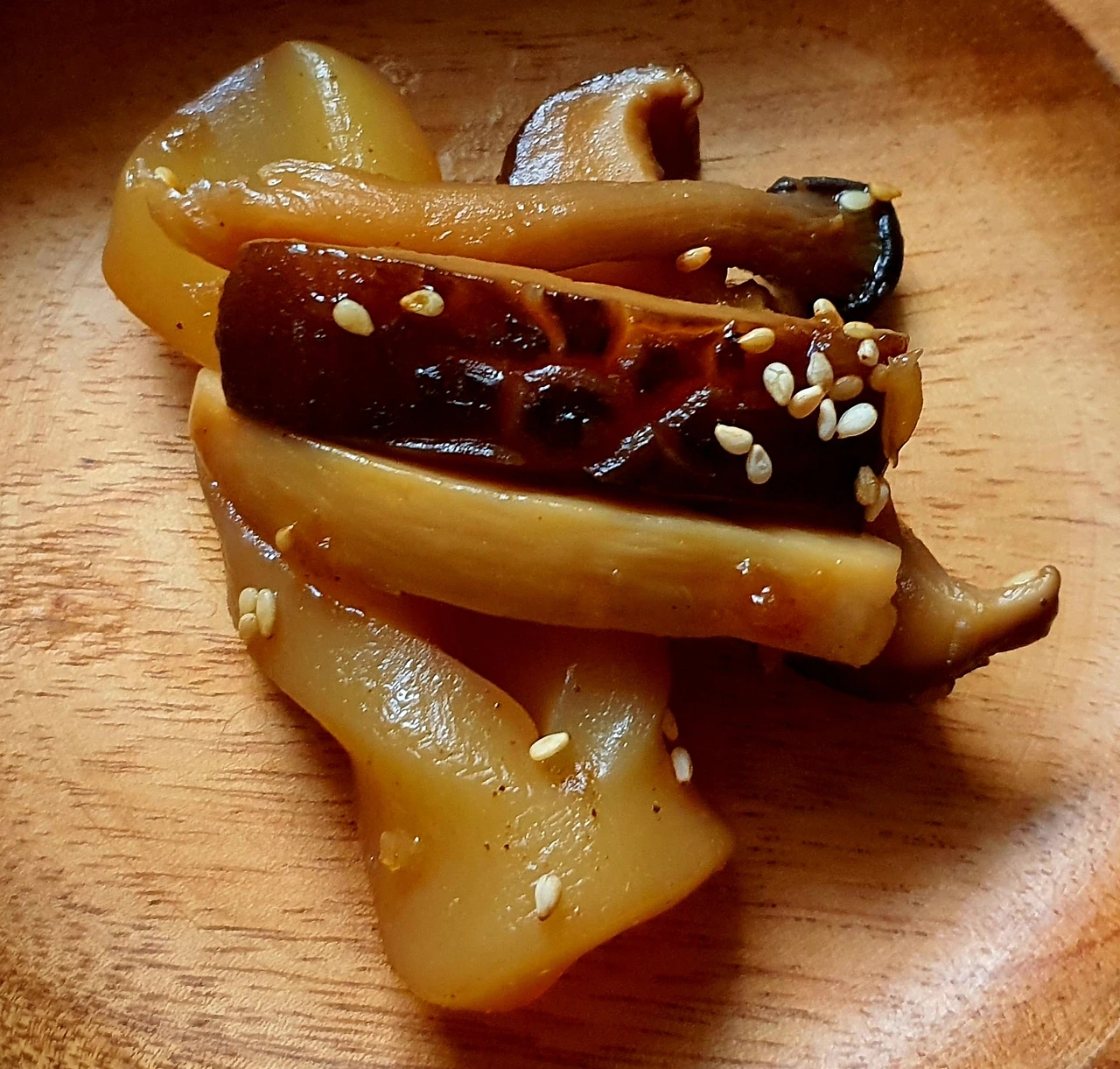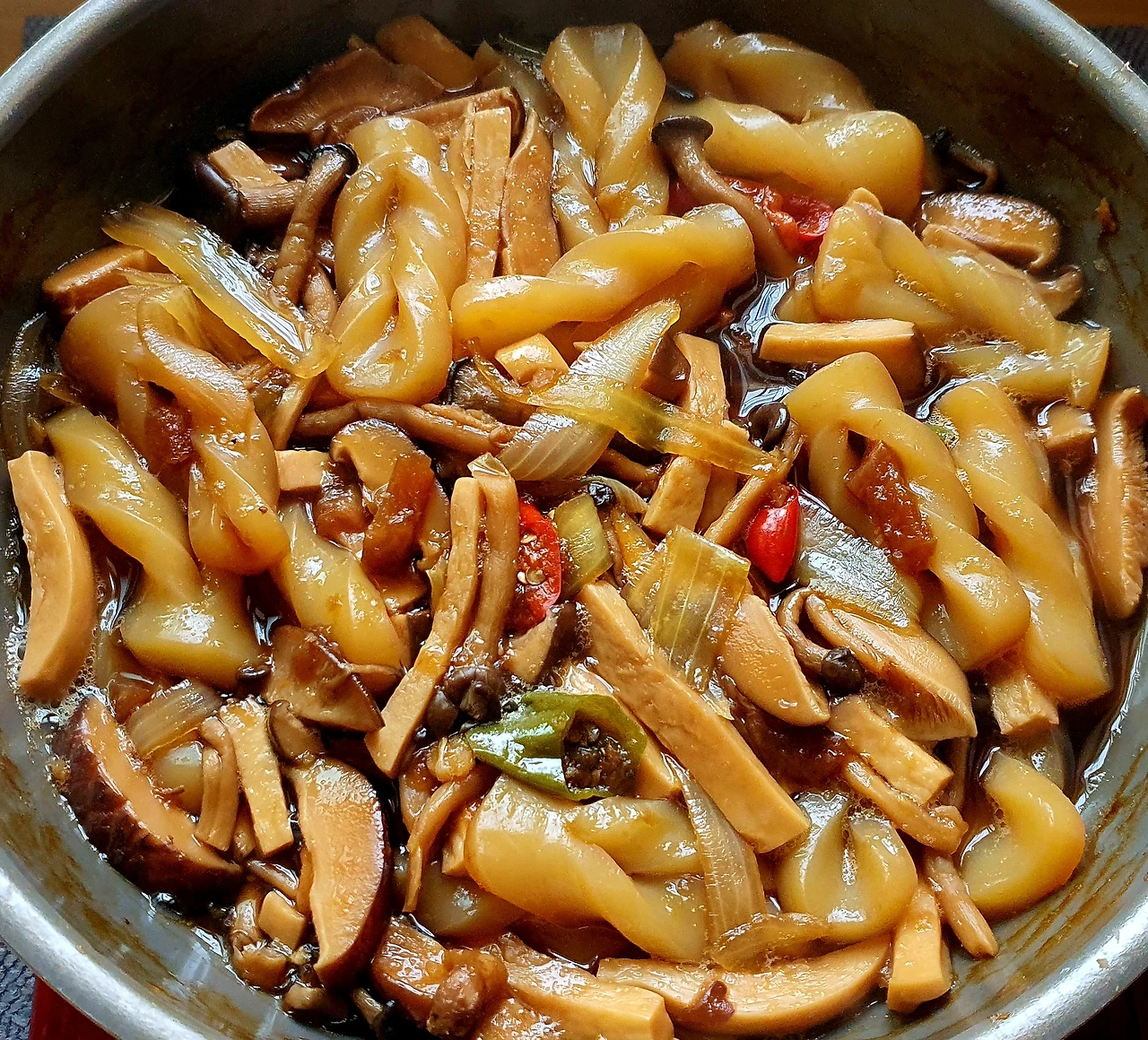 • 냄비에 간장등을 끓여 조림장을 만든 뒤 준비한 버섯과 곤약등 준비한 모든 재료를 넣어 자작해질 때까지 졸여 준다.