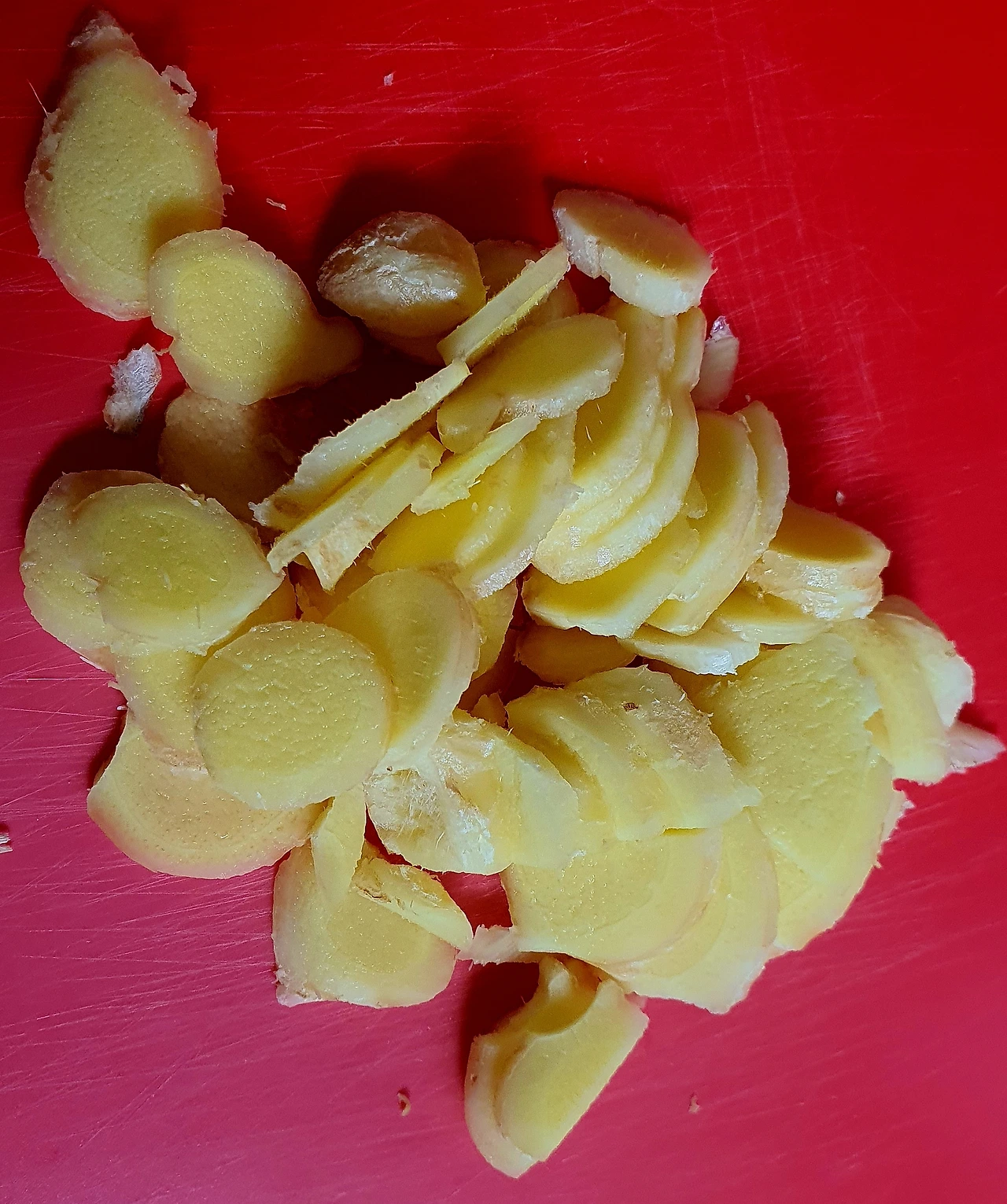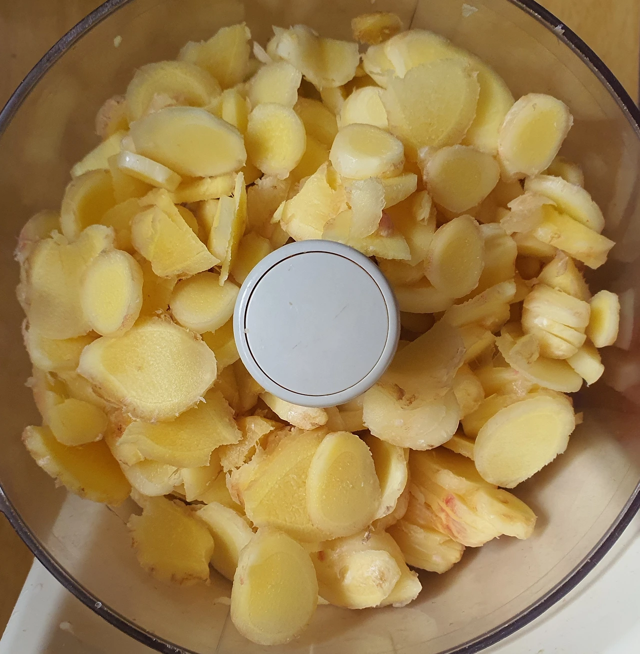 • 수분을 제거한 생강은 키친타월로 완벽하게 수분을 제거하고 믹서에 갈기 좋게 썰은 다음 곱게 갈아준다.