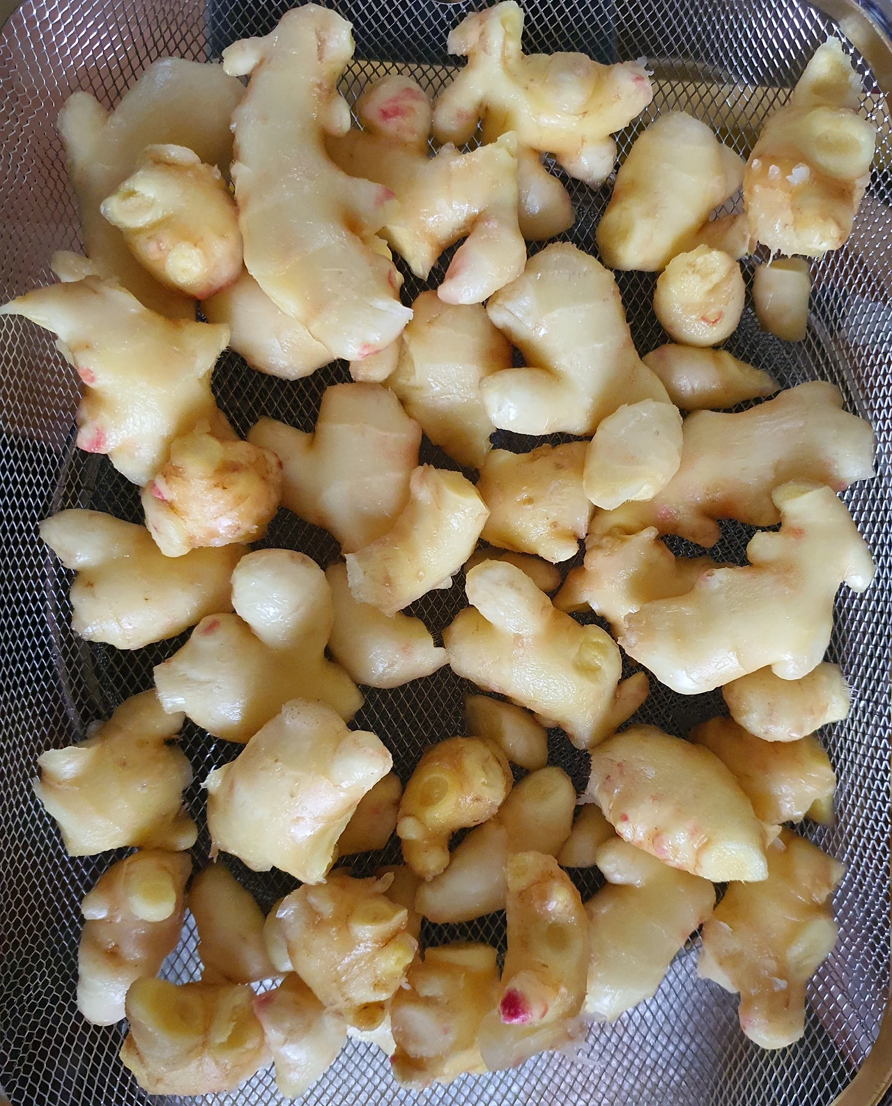 • 일차로 씻은 생강은 조각조각 띠어 칼로 살살 긁어 껍질을 벗겨내고 물로 씻은 후에 채에 받쳐 수분을 제거한다.